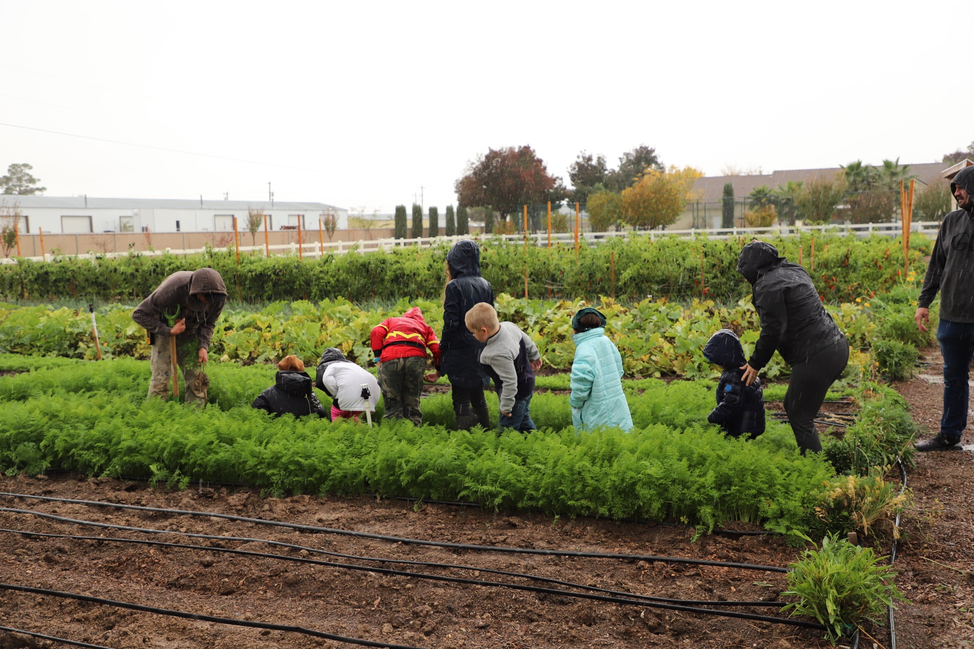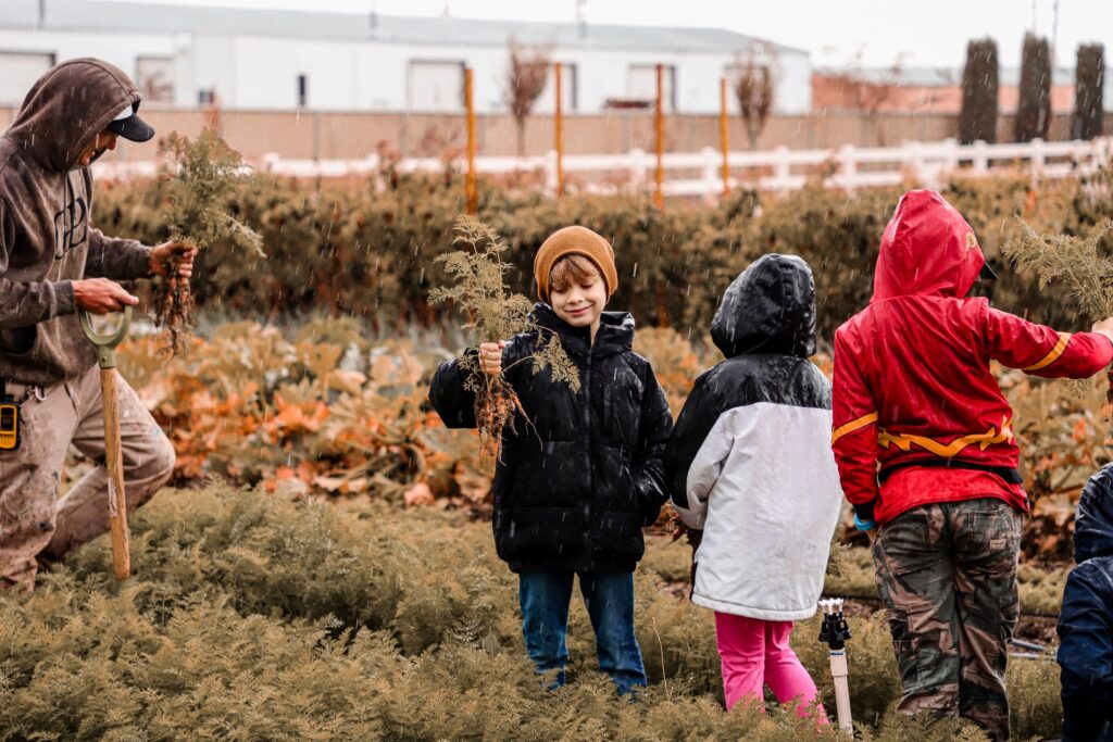 As the group rounded a row of carrot beds, Steve paused, grinned, and asked the students a question that made several of them cheer: “Do you want to pull some carrots?” Hands shot up immediately. Boots splashed through wet soil as children scattered across the rows, gripping leaves and pulling hard until bright orange carrots emerged from the ground, some thick, some skinny, all covered in mud. They rushed to the wash station, rinsing their carrots and marveling at the dirt that came off. When told they could take a bite—even with a bit of soil remaining—several brave kids did so proudly. “It’s good!” one shouted through a mouthful of crunchy carrot.