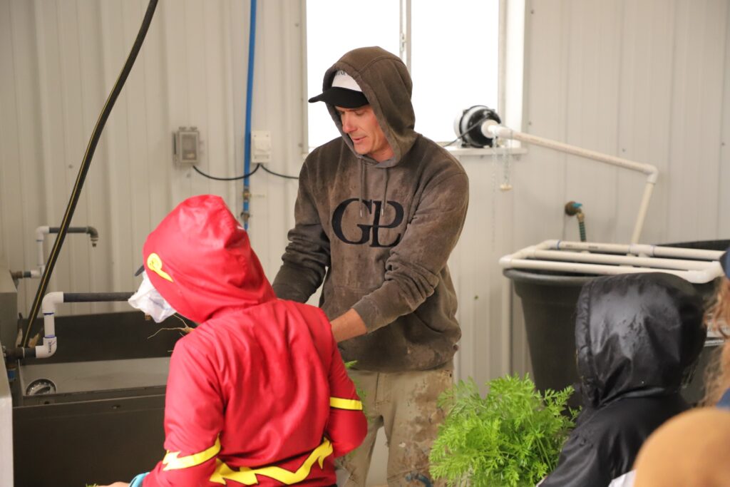 The farm’s regenerative philosophy continued into discussions of fertilizing. When one student asked what they feed the plants, Steve emphasized that they don’t feed the plants—they feed the soil. He described using things like crushed alfalfa pellets, crustacean meal, and plant-based inputs that soil organisms break down naturally. “The plant eats what it wants, when it wants,” he said. “We don’t force-feed it with bottled nutrients. We let nature do the work.”