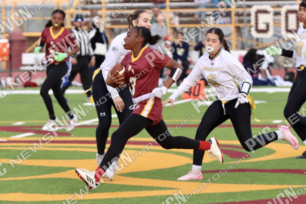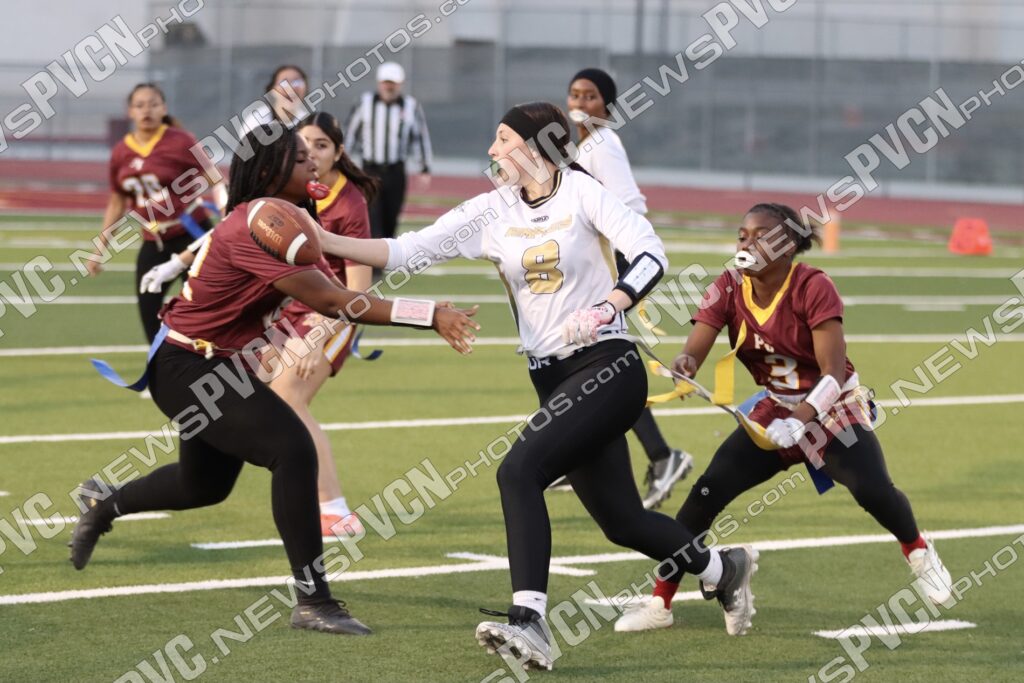 The defense responded immediately, forcing a turnover on downs midway through the first quarter. The Trojans continued to battle defensively as Ariana Lozoya and Nixon delivered key flag pulls to prevent the Archers from breaking big plays along the sideline. Amplus eventually found the end zone late in the opening quarter, but the Lady Trojans quickly answered in the second.
