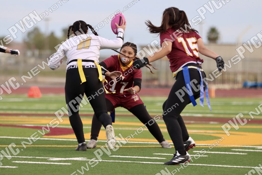 Throughout the second quarter, Pahrump Valley continued to mix in contributions from multiple players. Keelee Gieni picked up positive yardage on the ground, while Marlen Torres and Savannah Thompson each added tough rushing attempts. On defense, Gieni and Collins continued to make key stops, with Collins also recording a flag pull following an interception.