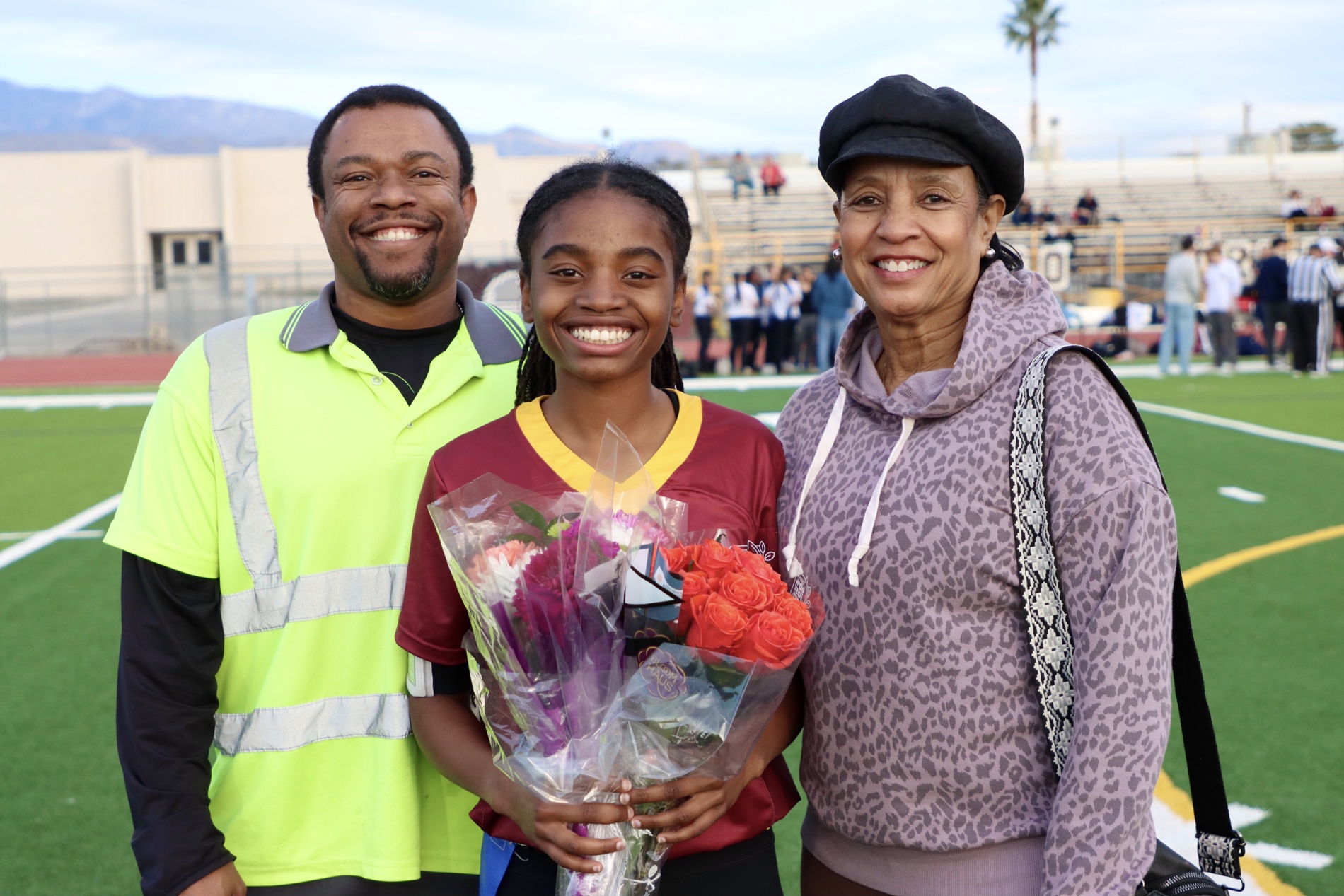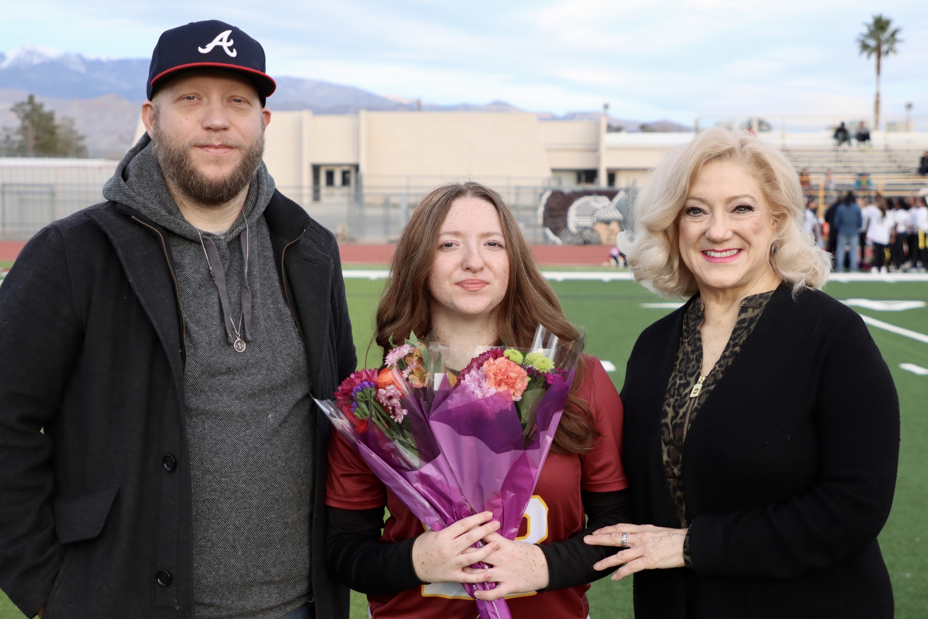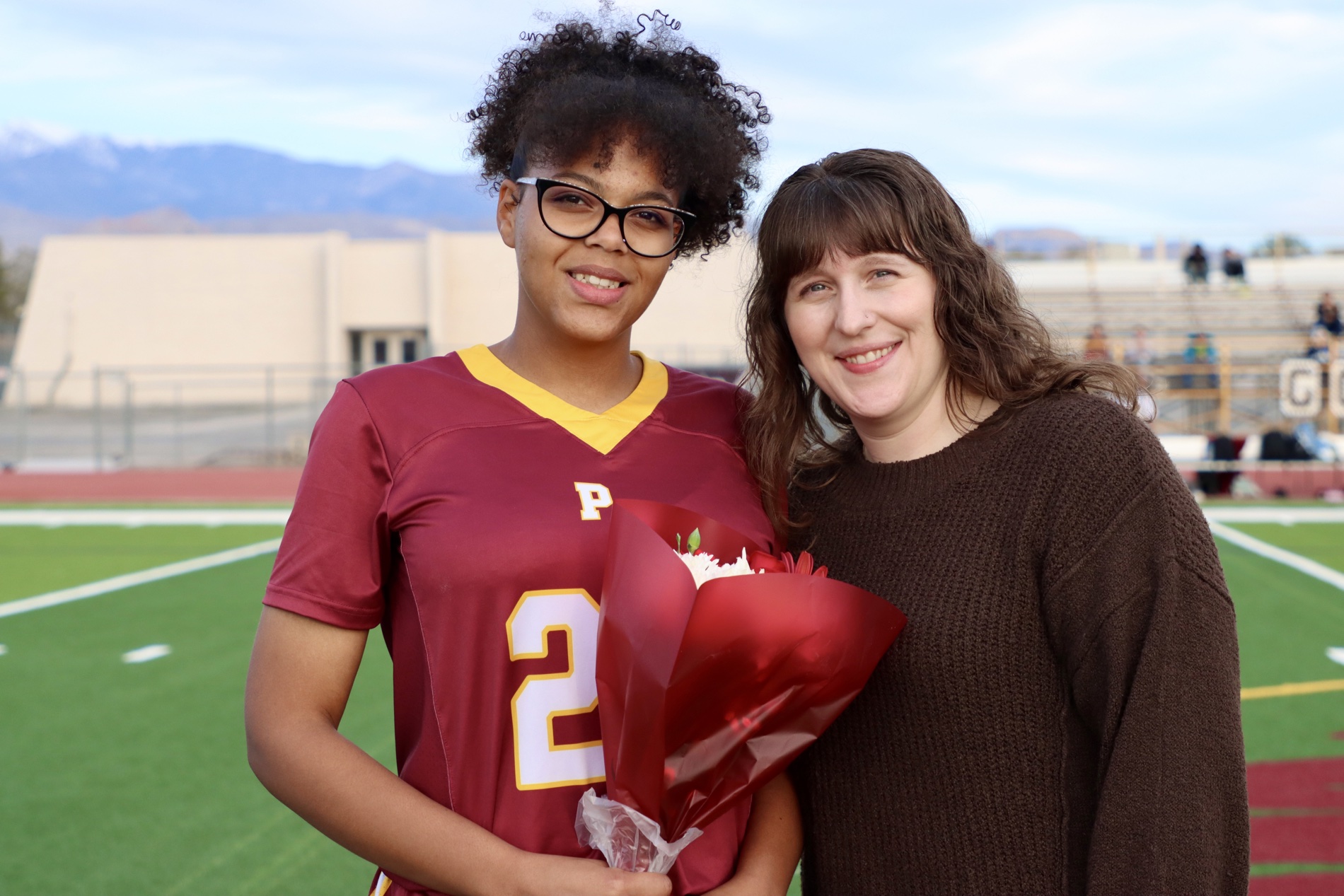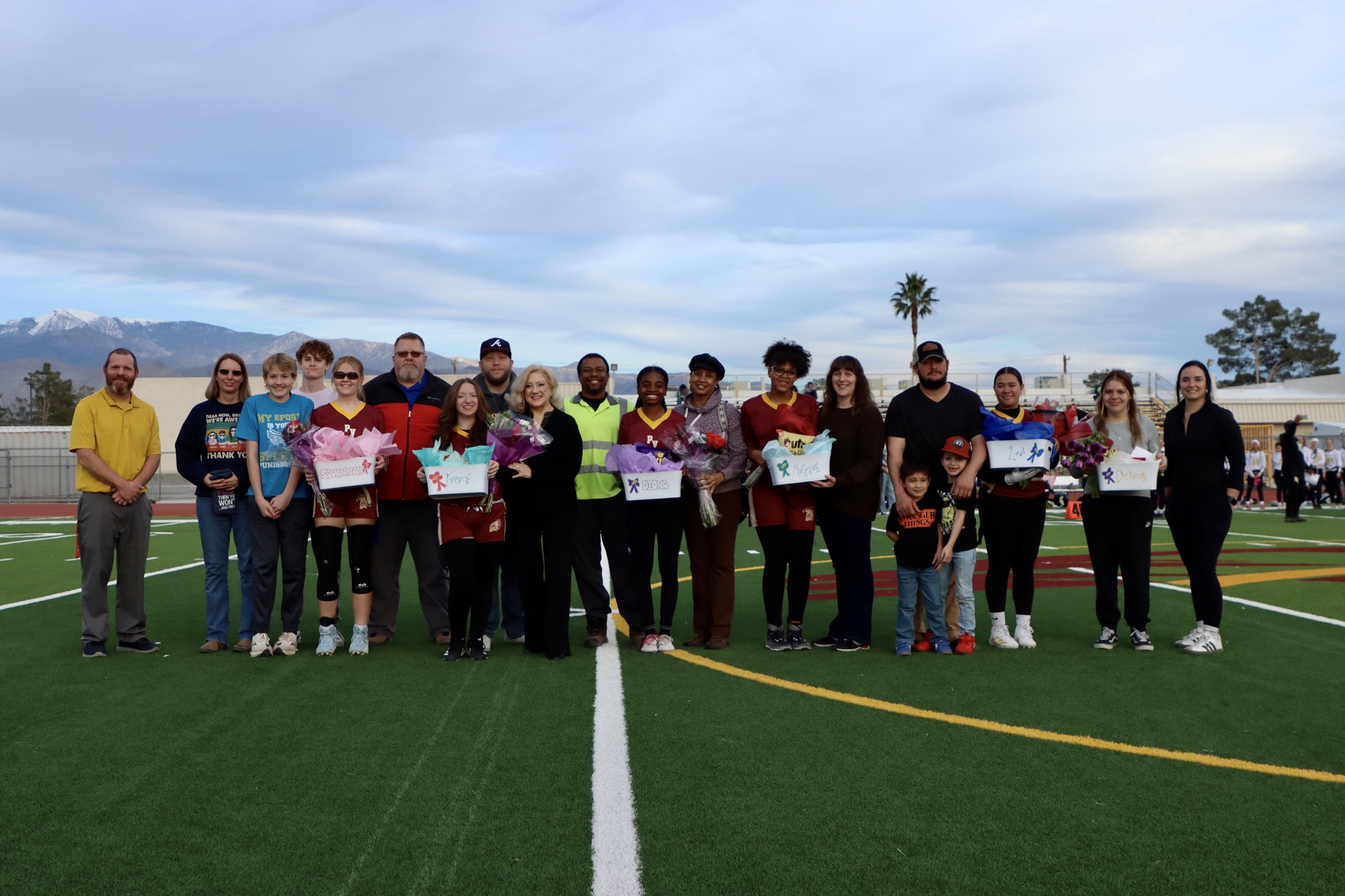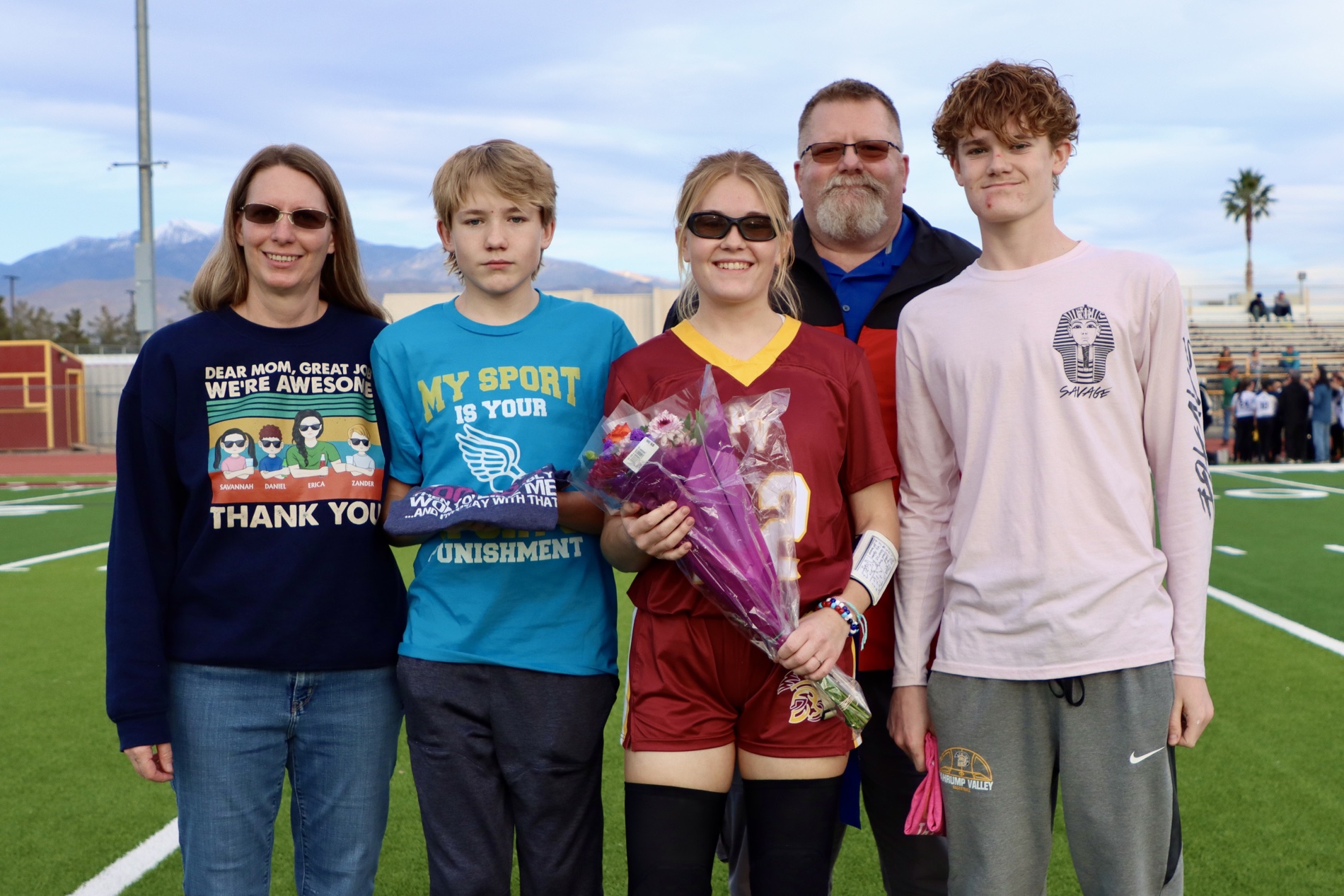 The Pahrump Valley High School girls’ varsity flag football team wrapped up its home schedule on Thursday, February 5, hosting the Amplus Archers in a game that reflected the program’s growth, determination, and team-first spirit throughout the season. Before kickoff, the evening opened with an emotional Senior Night ceremony as six Lady Trojans were honored alongside their families for their dedication to the program. Recognized seniors included Leah-Marie Cooper, Aaliyah Fries, Diona Nixon, Tiffany Sartin, and Savannah Thompson, as well as manager Delaney Abbatte.