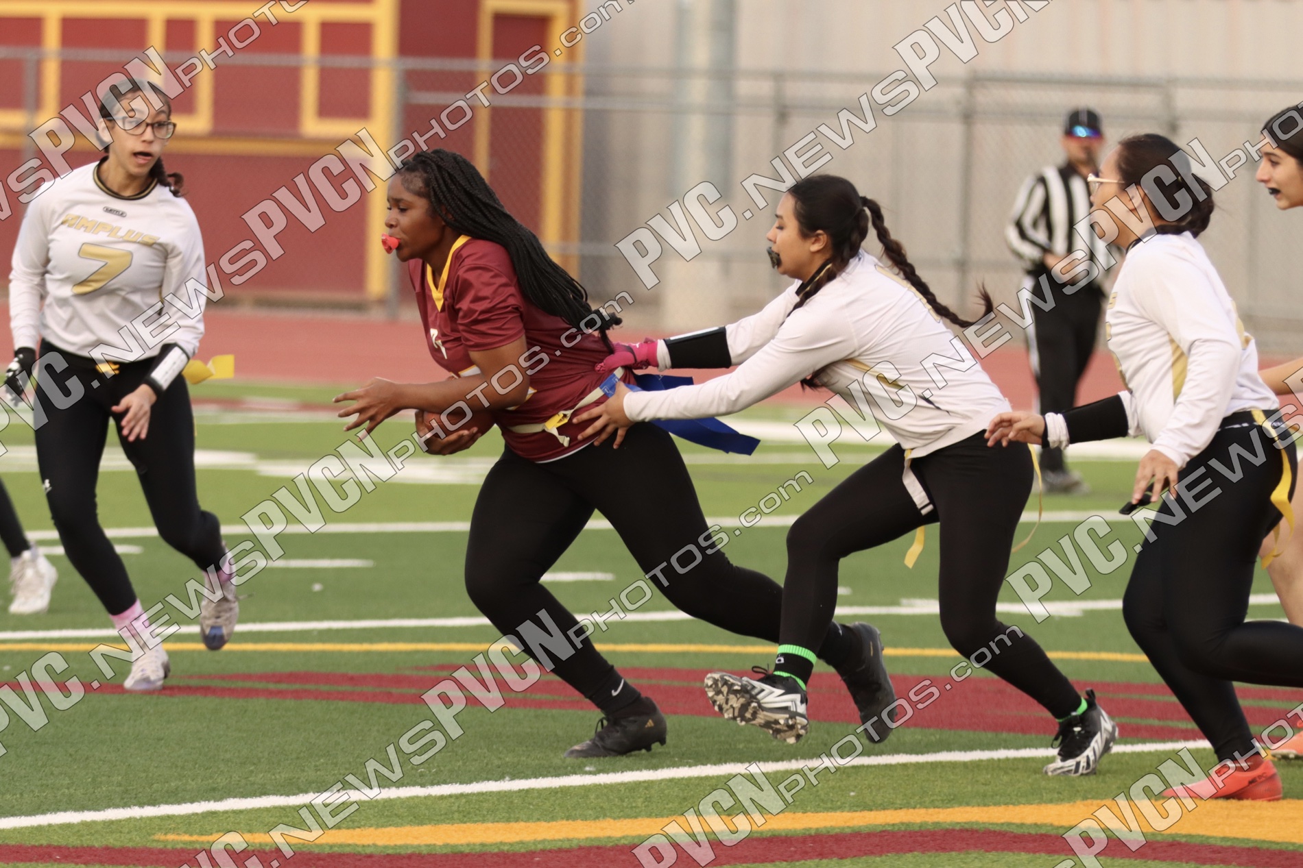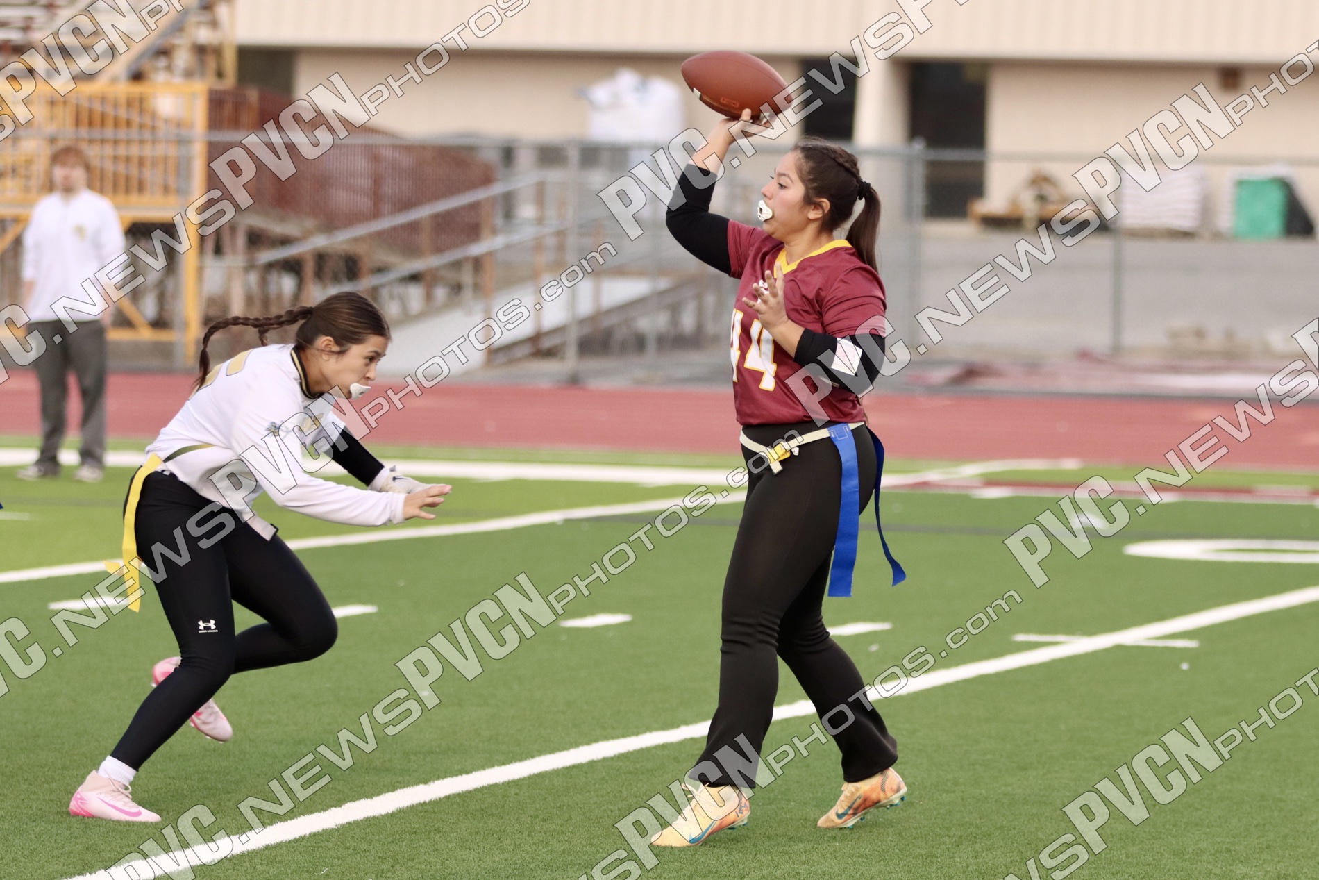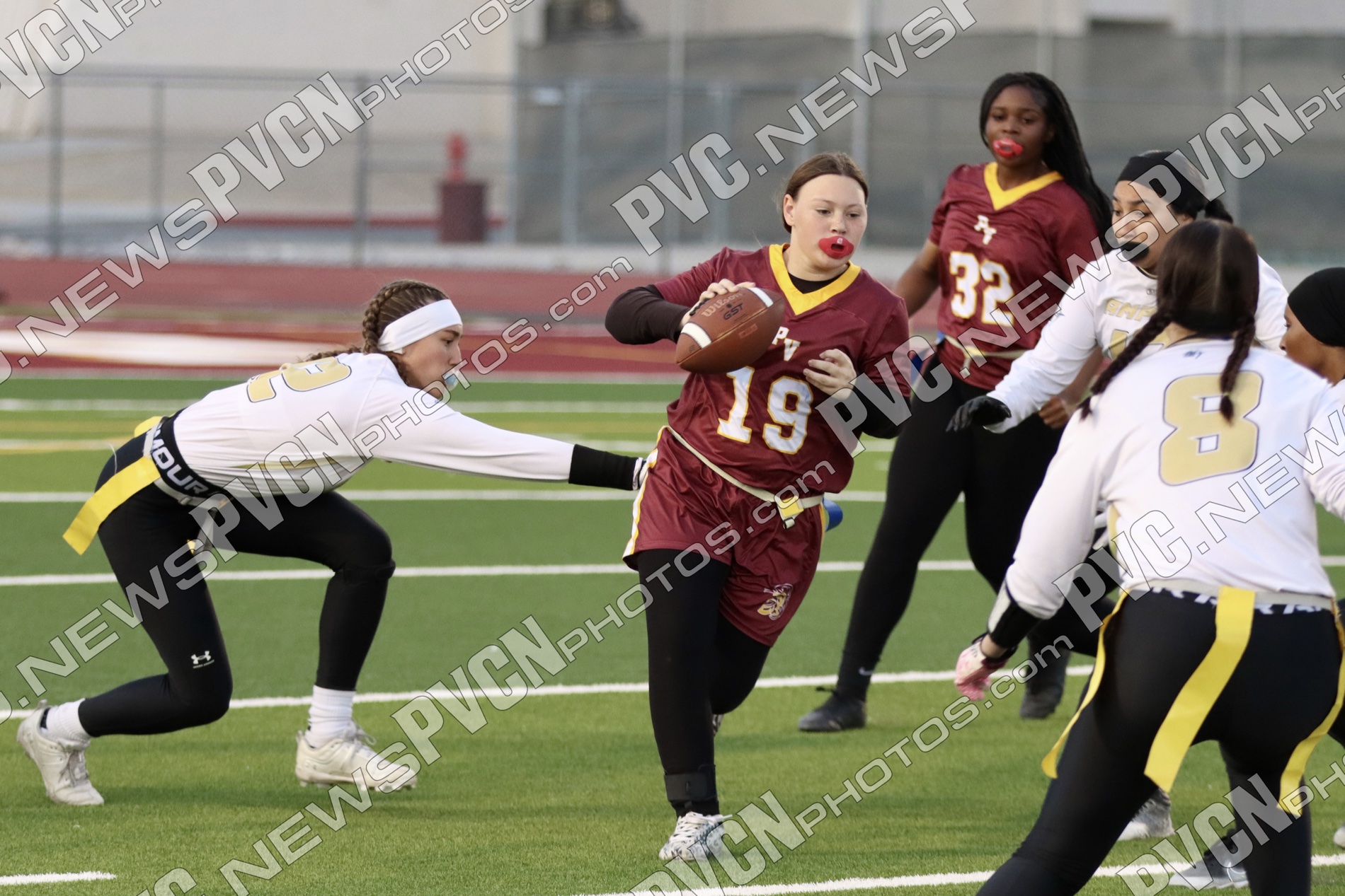 The defense responded immediately, forcing a turnover on downs midway through the first quarter. The Trojans continued to battle defensively as Ariana Lozoya and Nixon delivered key flag pulls to prevent the Archers from breaking big plays along the sideline. Amplus eventually found the end zone late in the opening quarter, but the Lady Trojans quickly answered in the second.