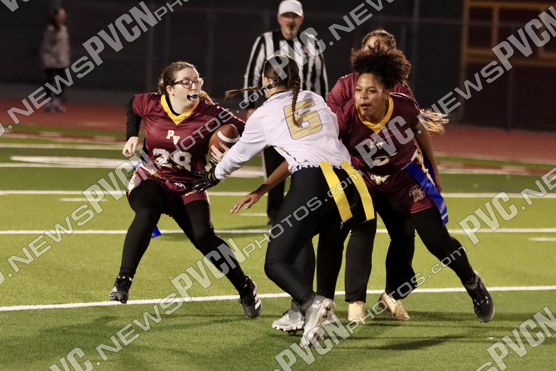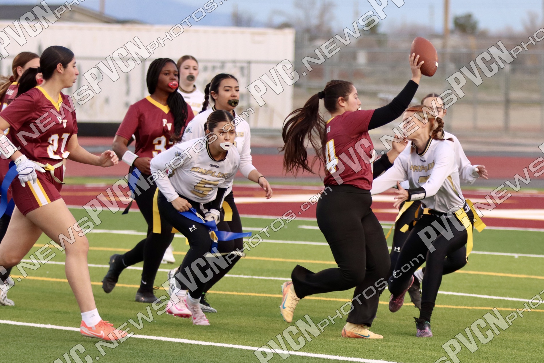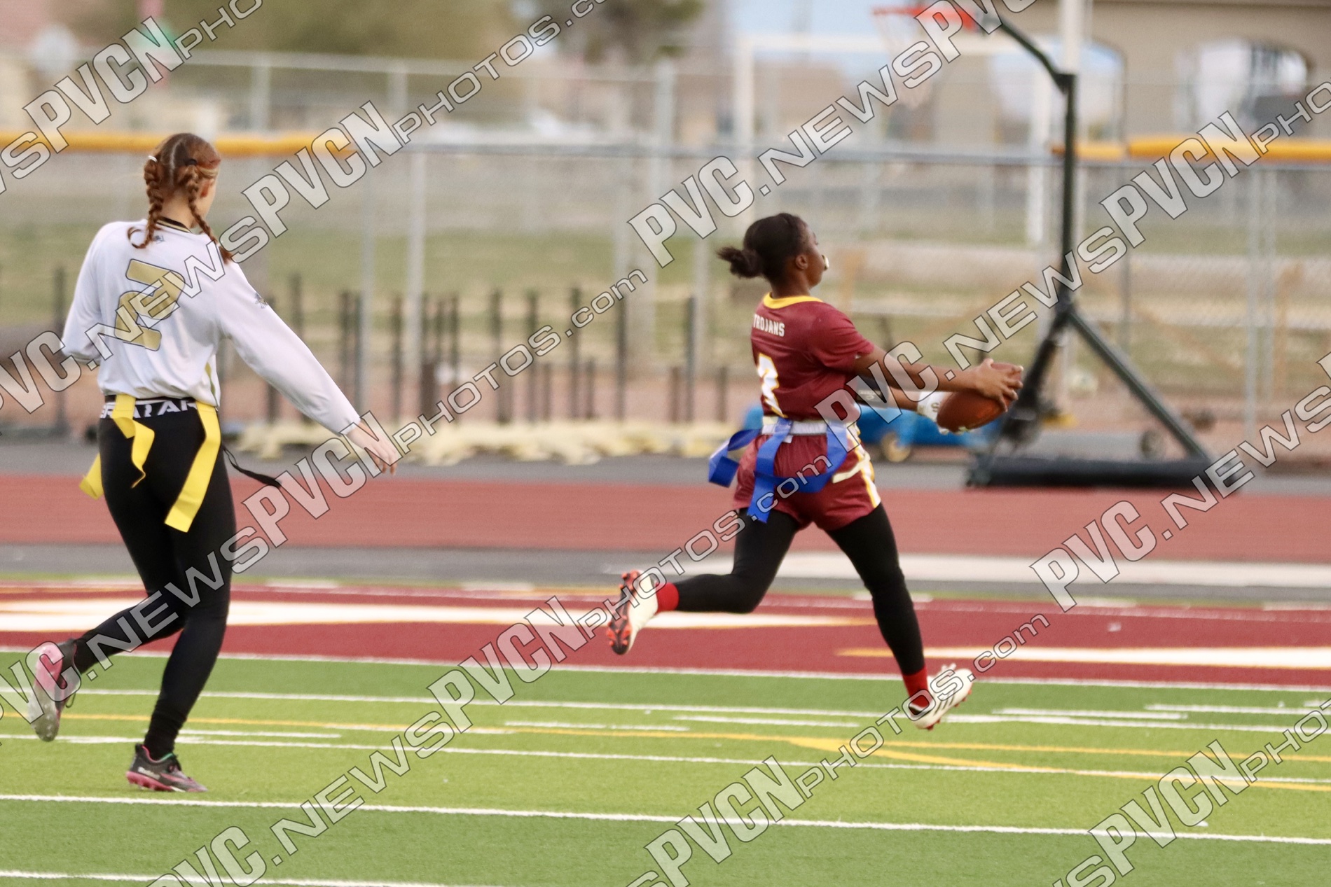 Throughout the second quarter, Pahrump Valley continued to mix in contributions from multiple players. Keelee Gieni picked up positive yardage on the ground, while Marlen Torres and Savannah Thompson each added tough rushing attempts. On defense, Gieni and Collins continued to make key stops, with Collins also recording a flag pull following an interception.