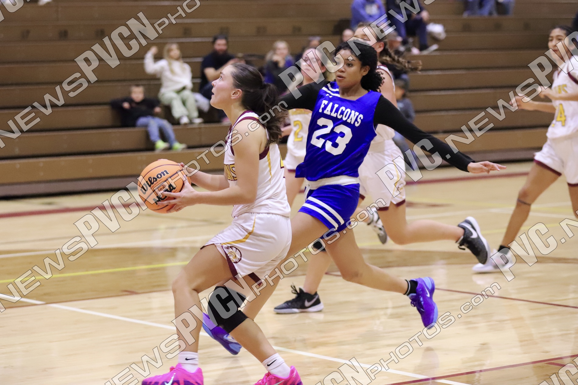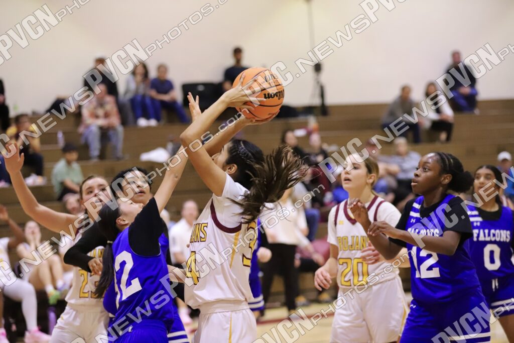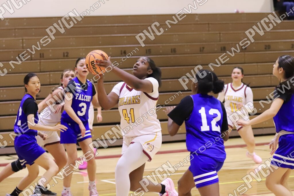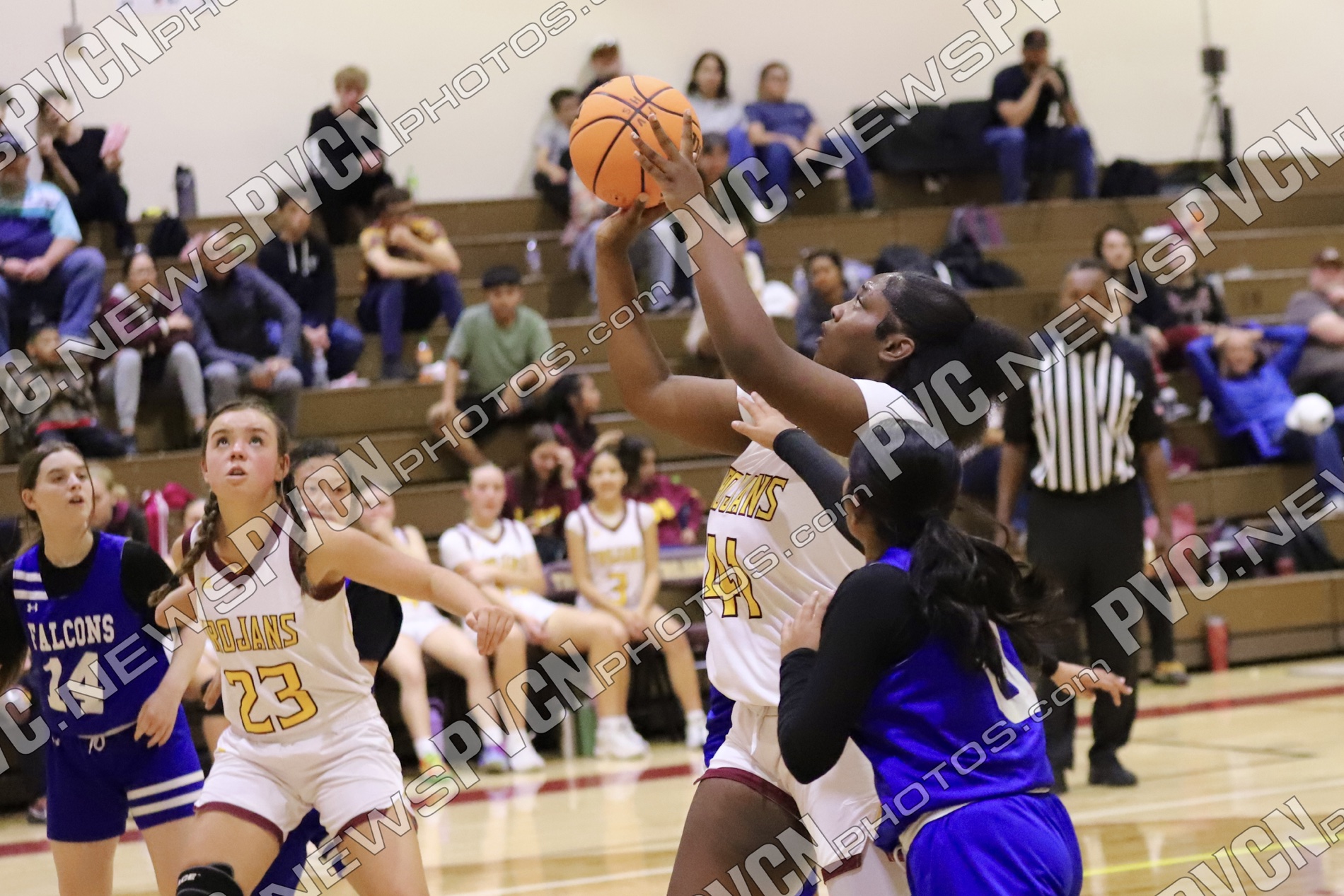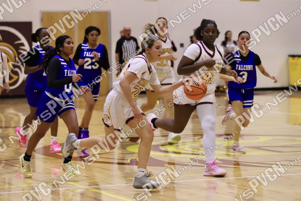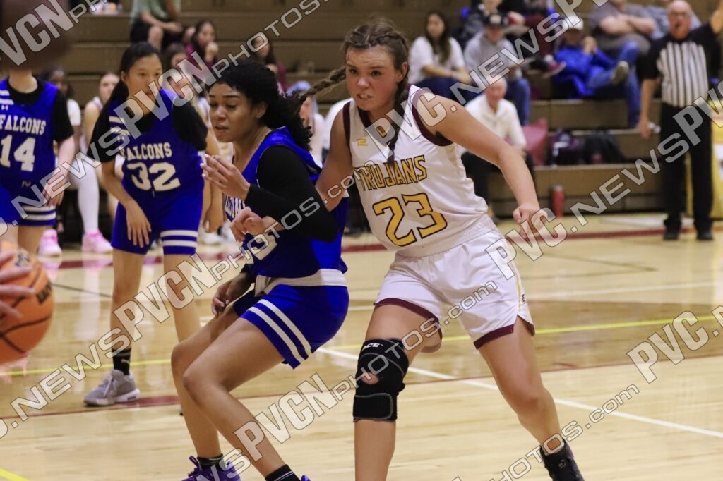 From there, the Trojans began to find their rhythm. Kaylan Robinson knocked down a smooth jumper, followed by a strong breakaway play from Jaycie Hayes, who finished through contact to extend the lead to 9–2. Robinson continued to make plays on both ends, including a key steal that led to an assist for Cindal Monahan, who converted under the basket. Defensive coverage from players like Reagan Saldaña helped hold the Falcons to just three points in the opening quarter as PVHS took an 11–3 advantage.
