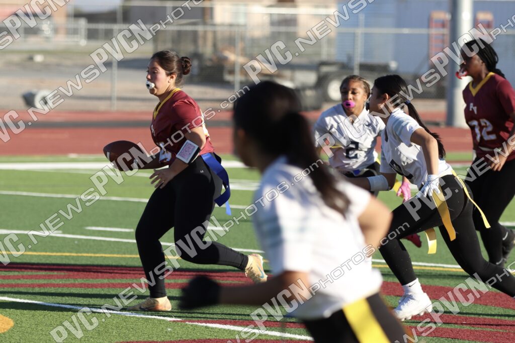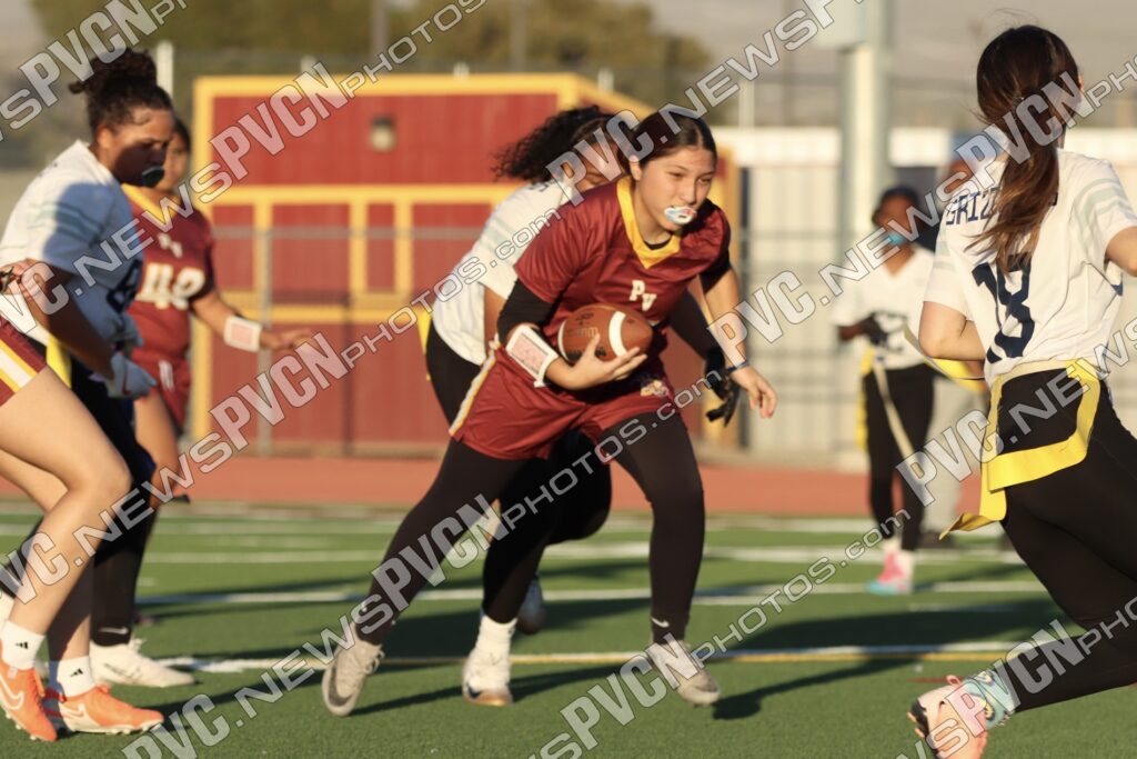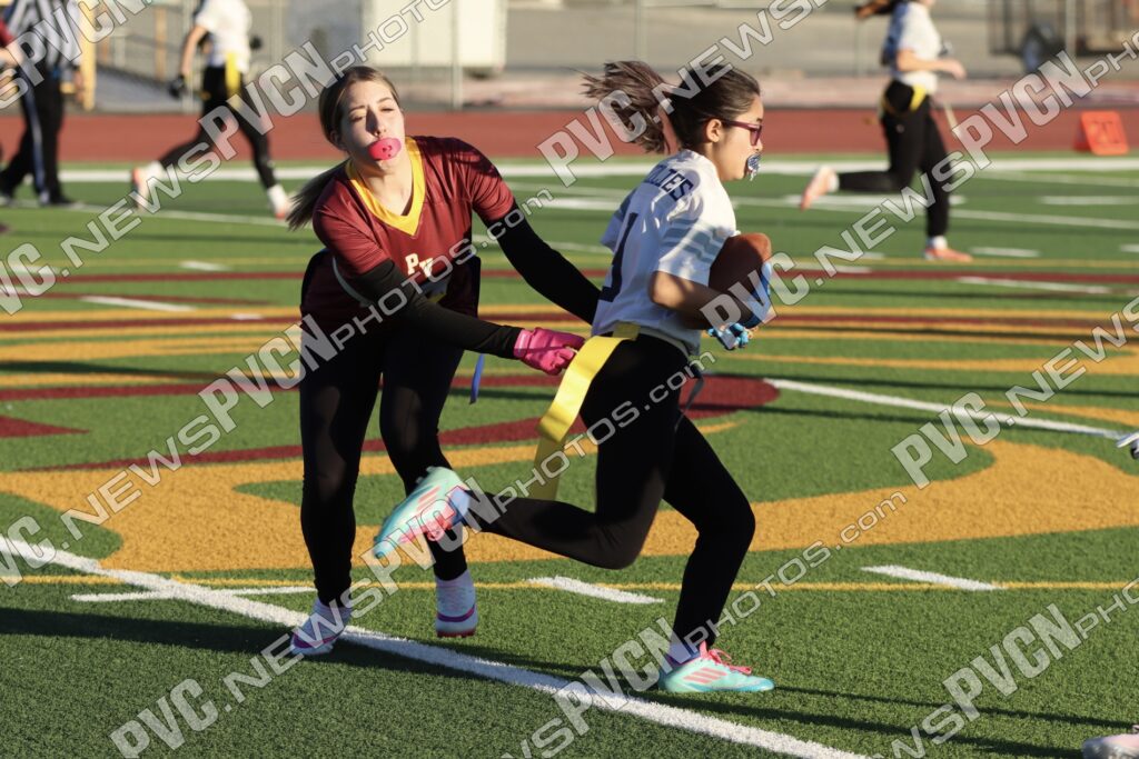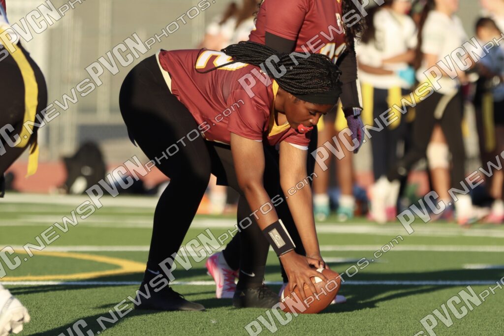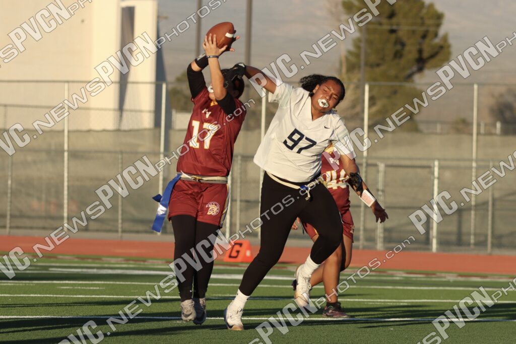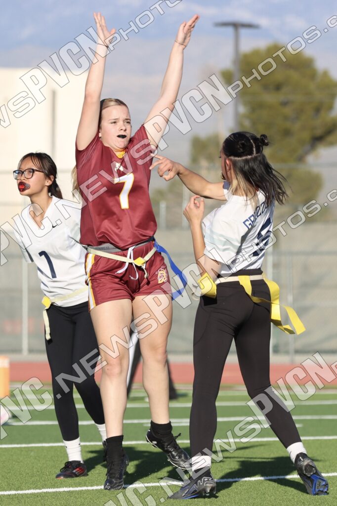 Spring Valley opened the game with possession and immediately faced resistance from the Pahrump defense. On an early fourth-down conversion attempt, Keelee Gieni came up with a key flag pull to keep the play from turning into a bigger gain. Spring Valley continued to push the ball downfield with a long completion, but Anjolina Mercado quickly stepped in with a flag pull to halt the momentum. Moments later, Ember Castaneda added another defensive stop, pulling the flag on a run attempt.