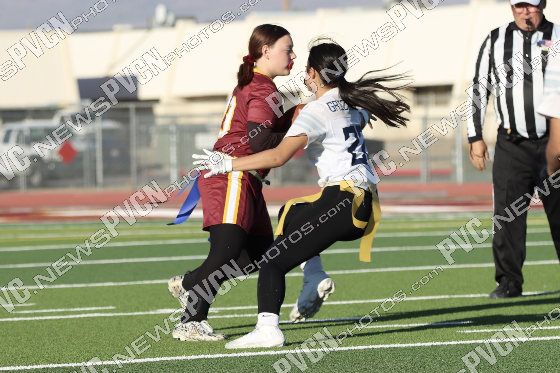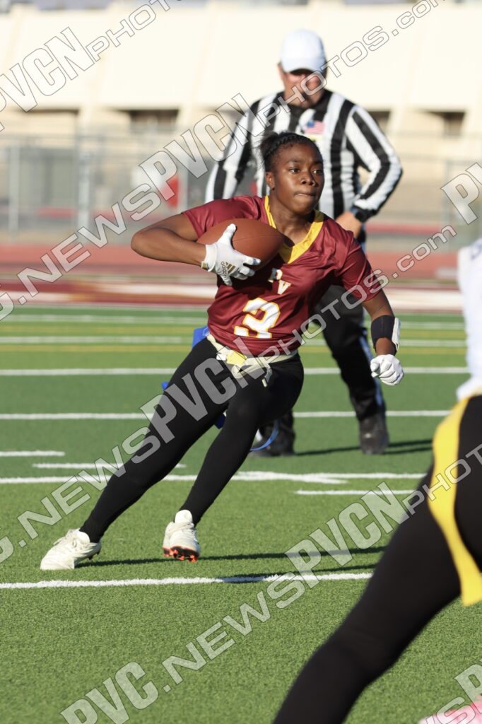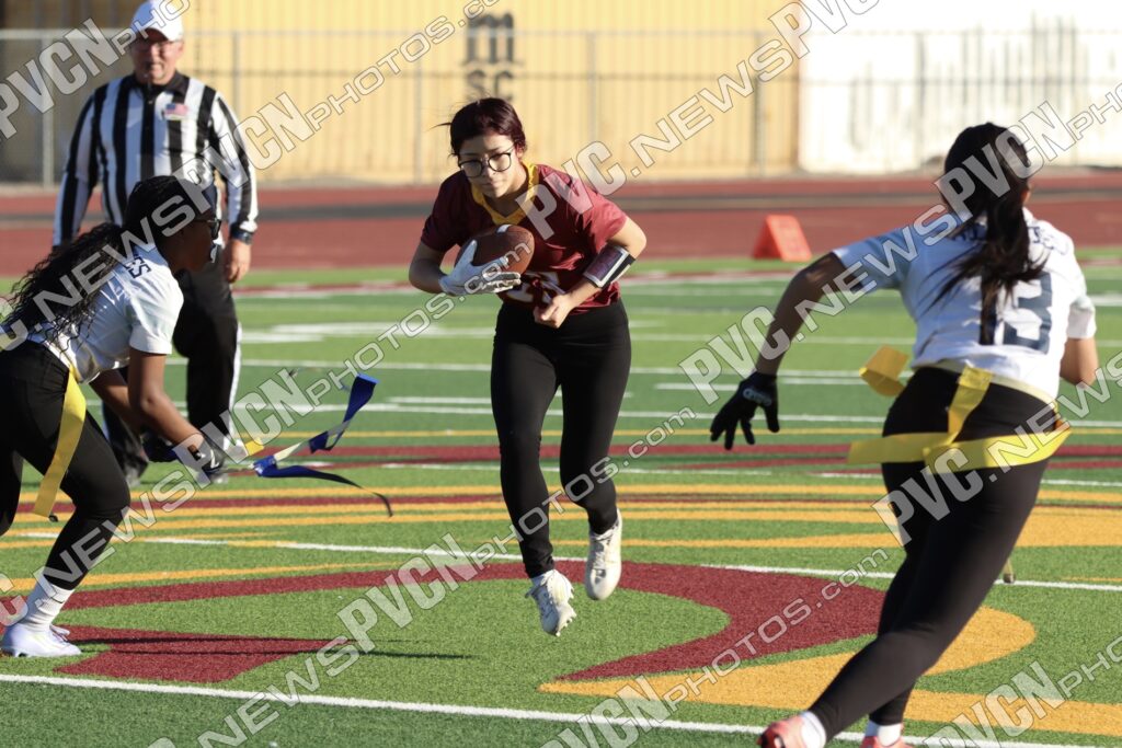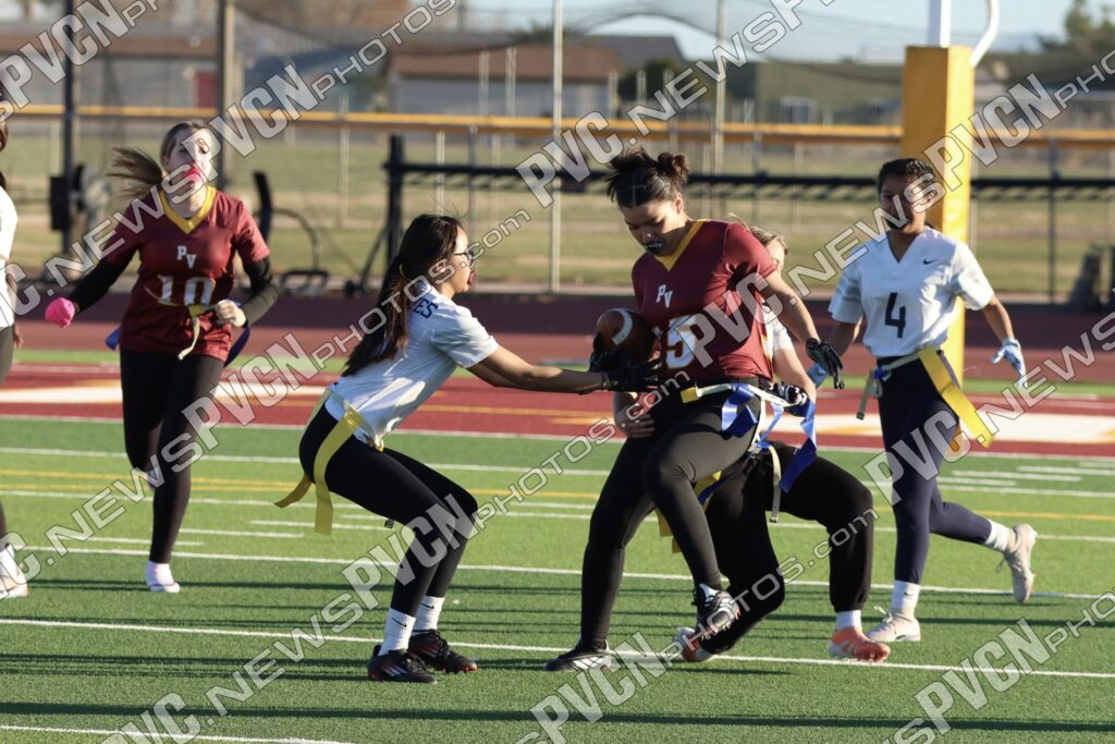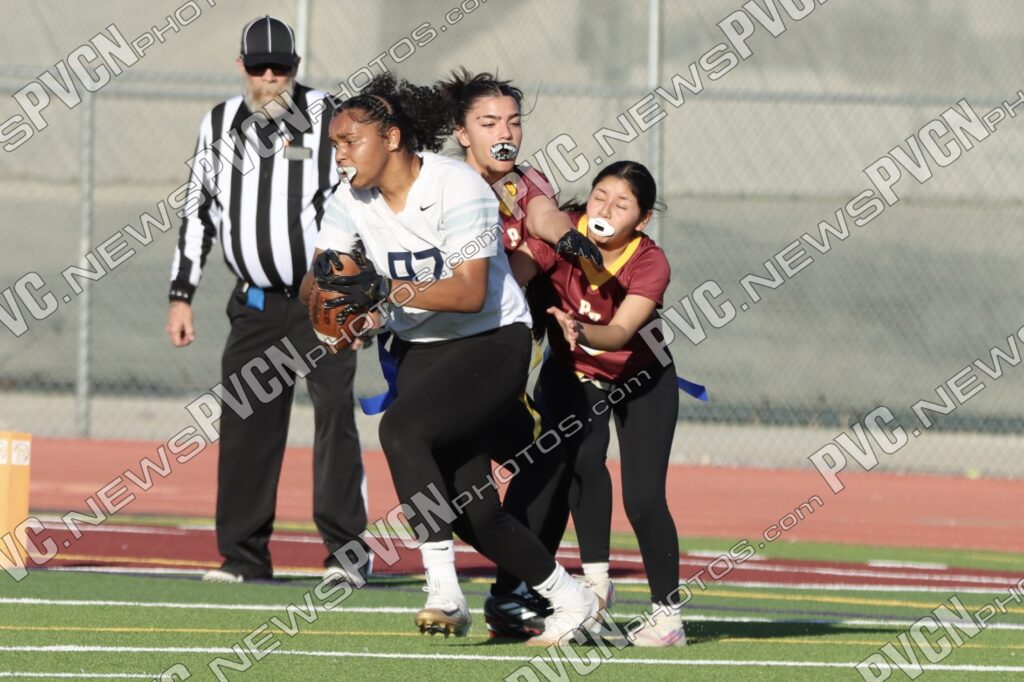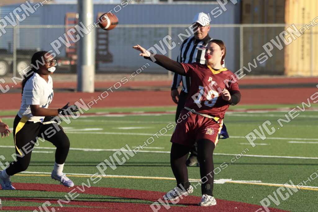 Spring Valley opened the game with possession and immediately faced resistance from the Pahrump defense. On an early fourth-down conversion attempt, Keelee Gieni came up with a key flag pull to keep the play from turning into a bigger gain. Spring Valley continued to push the ball downfield with a long completion, but Anjolina Mercado quickly stepped in with a flag pull to halt the momentum. Moments later, Ember Castaneda added another defensive stop, pulling the flag on a run attempt.