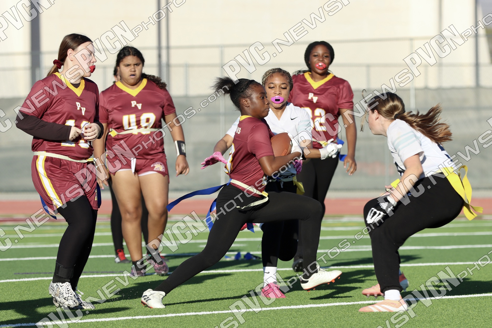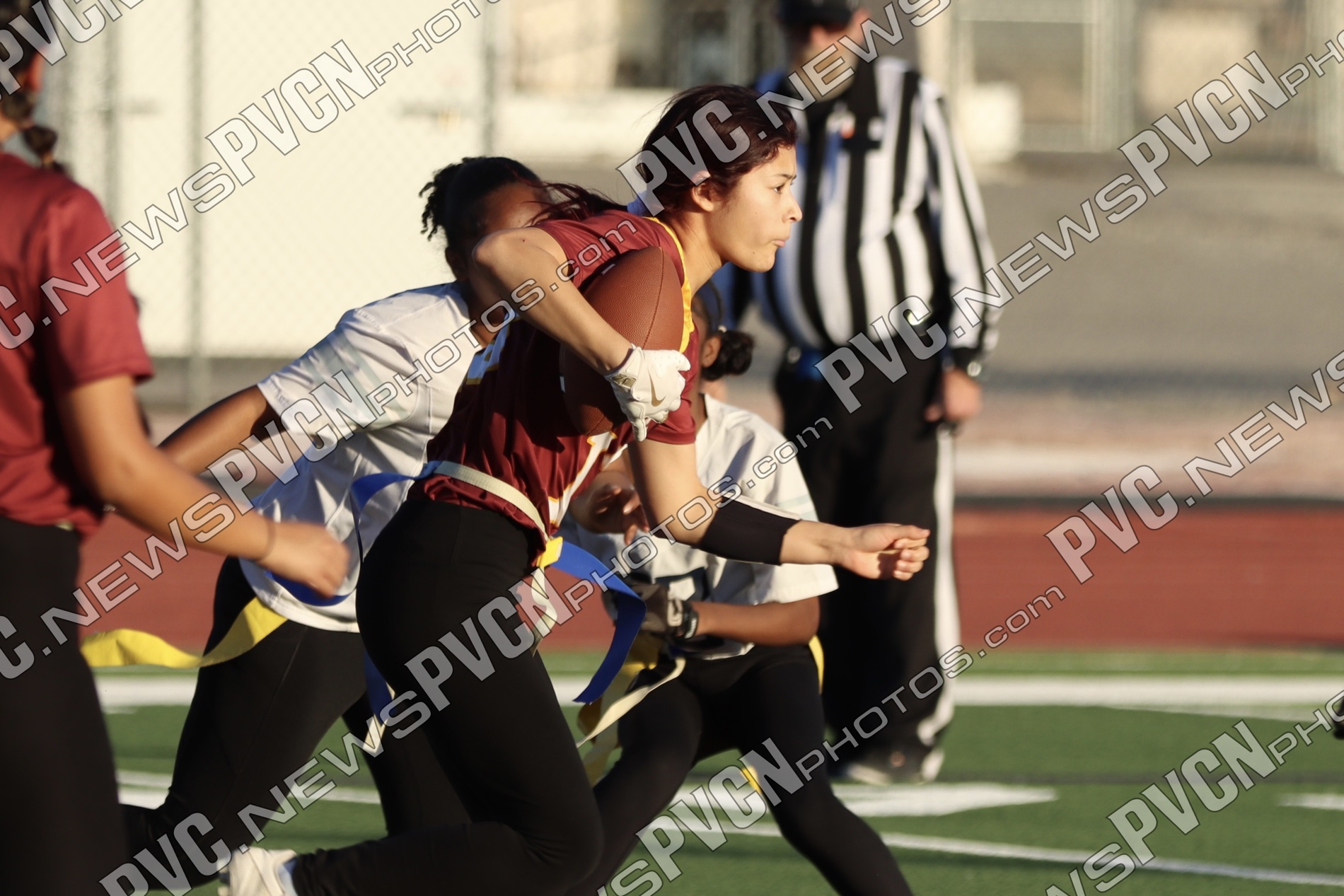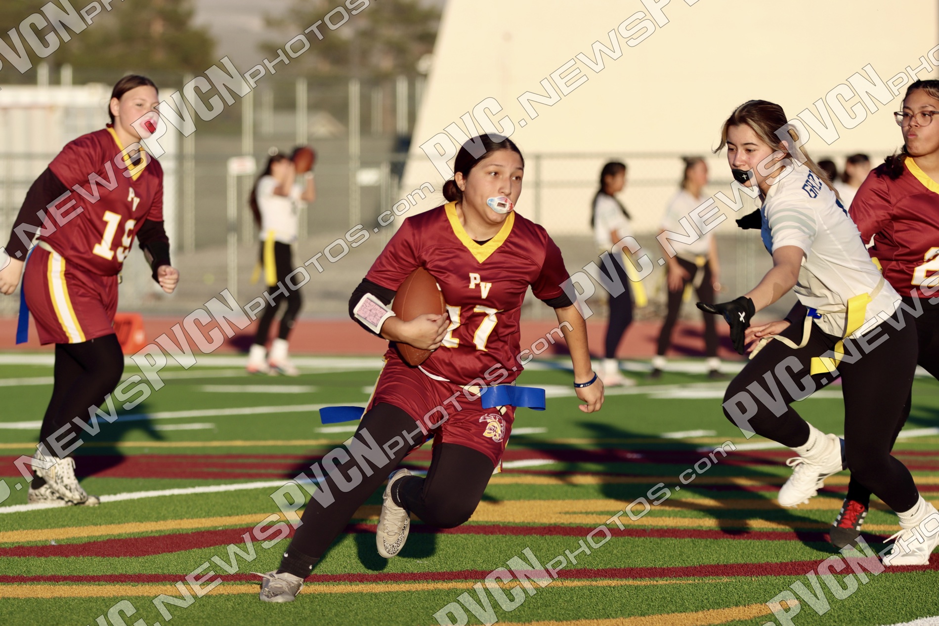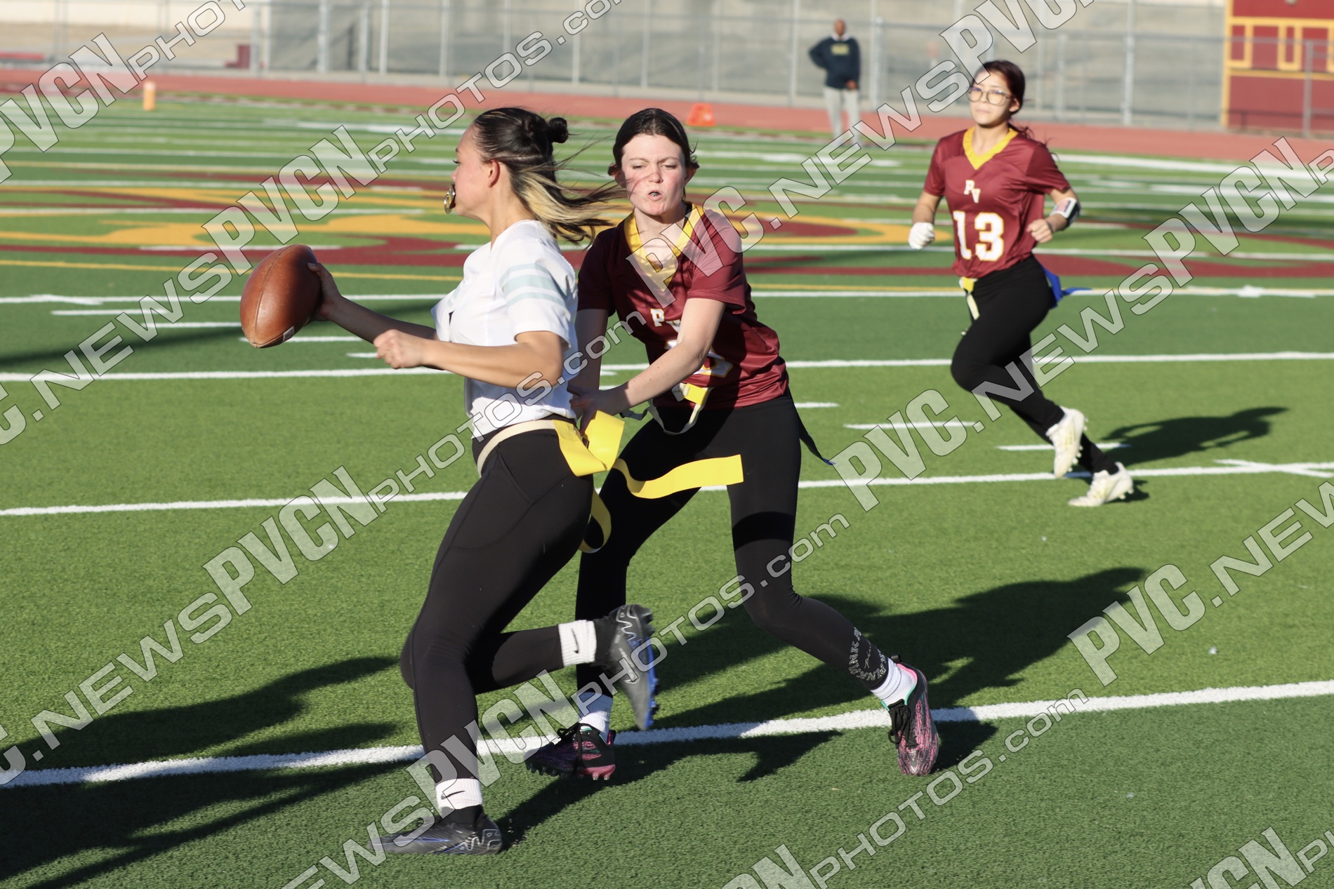 Spring Valley opened the game with possession and immediately faced resistance from the Pahrump defense. On an early fourth-down conversion attempt, Keelee Gieni came up with a key flag pull to keep the play from turning into a bigger gain. Spring Valley continued to push the ball downfield with a long completion, but Anjolina Mercado quickly stepped in with a flag pull to halt the momentum. Moments later, Ember Castaneda added another defensive stop, pulling the flag on a run attempt.