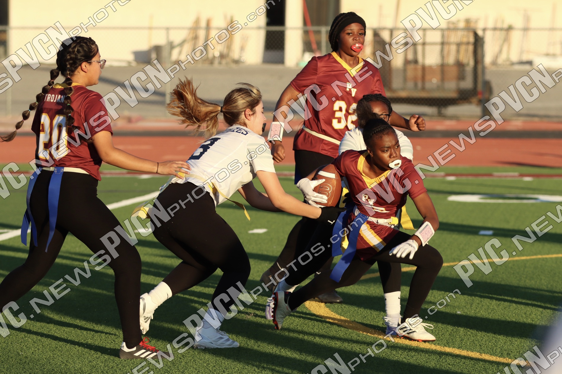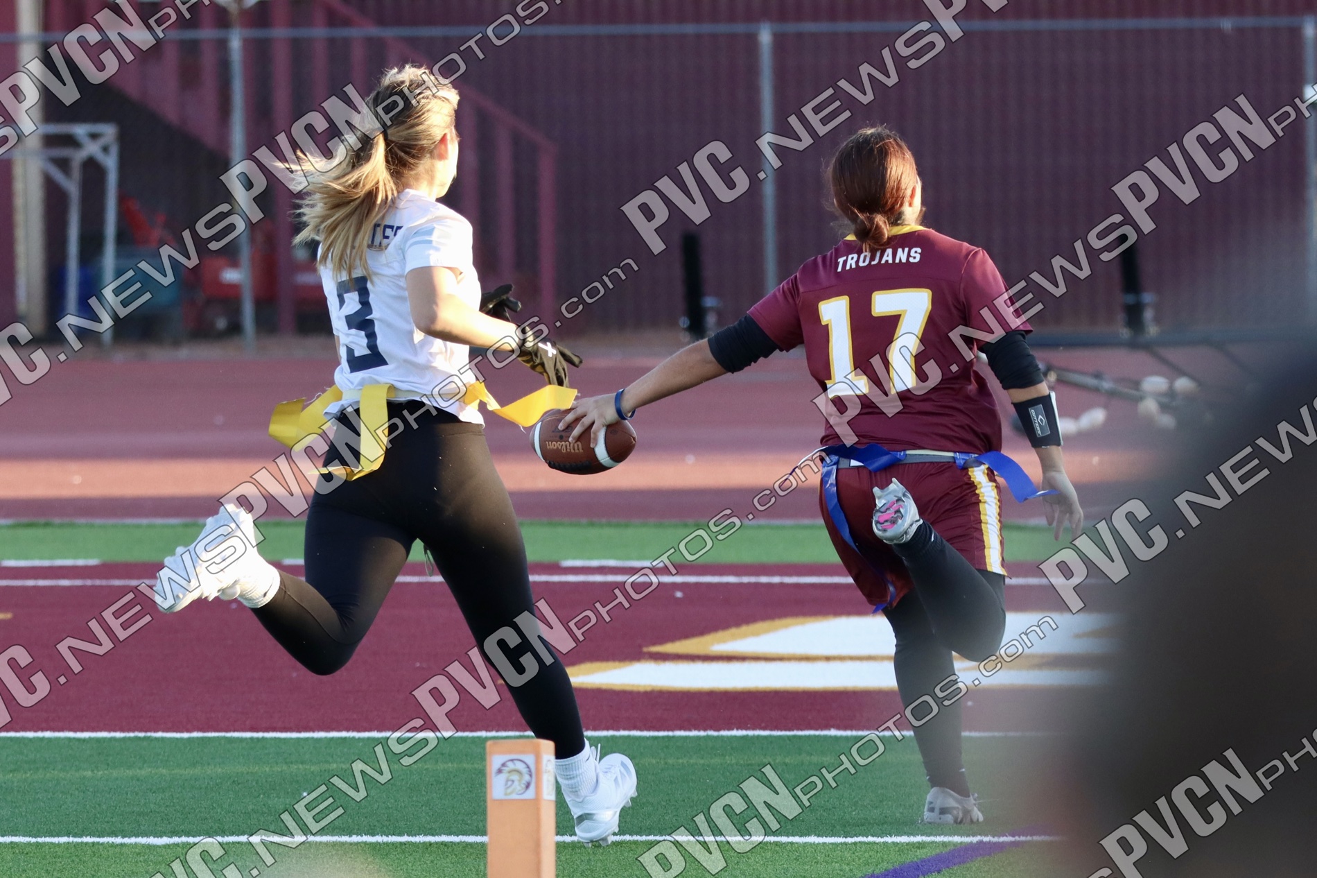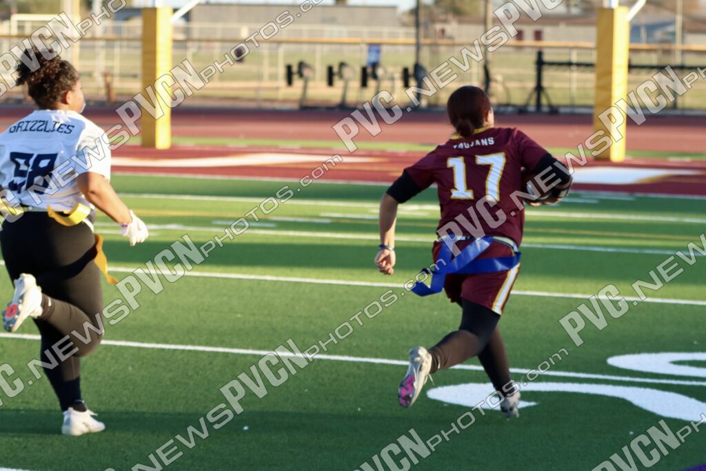 The defense remained active late in the third quarter and into the fourth. Teagan Fanning recorded a quick flag pull with 1:21 remaining in the third, and early in the fourth quarter, the Trojans forced a turnover on downs after breaking up a pass attempt.