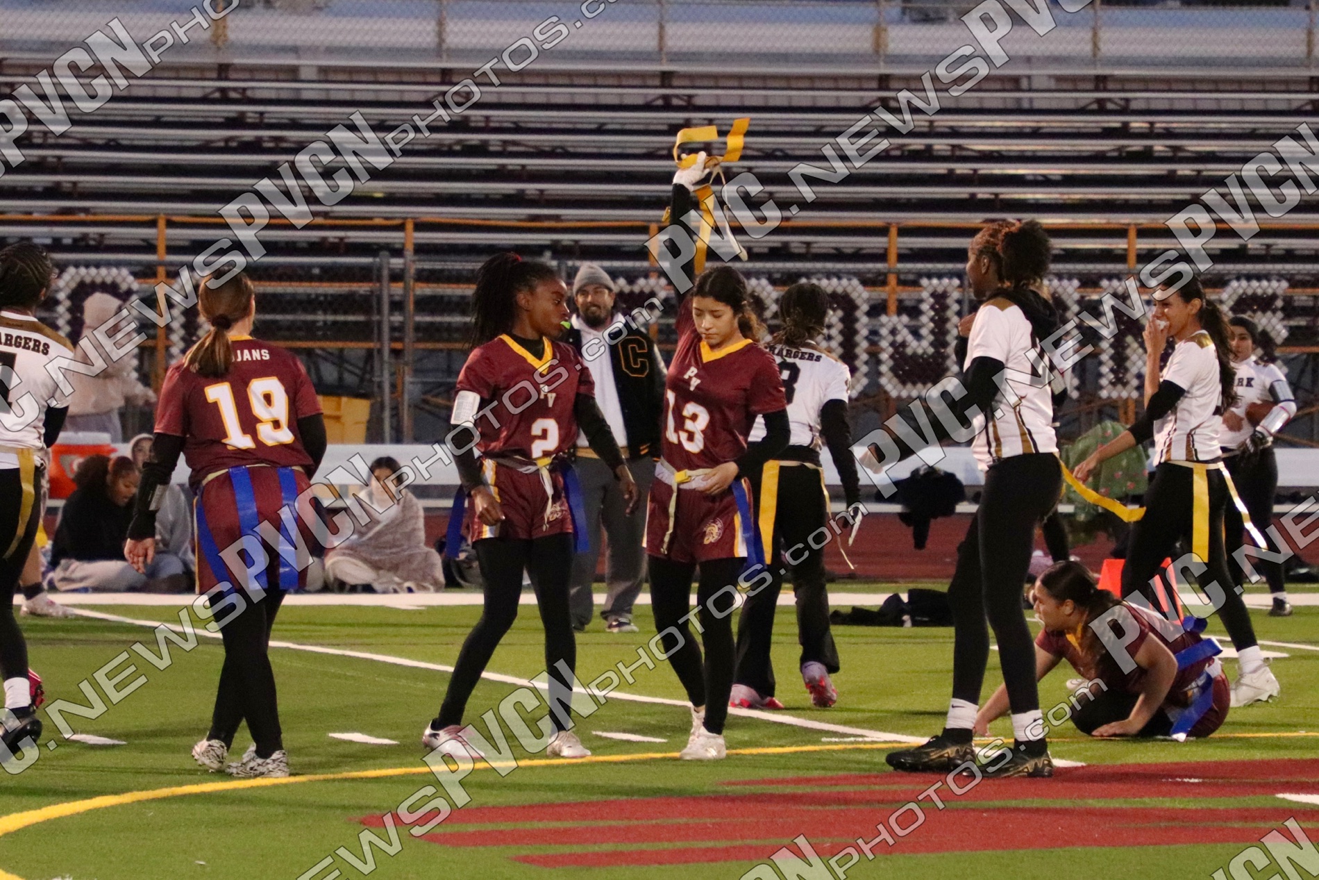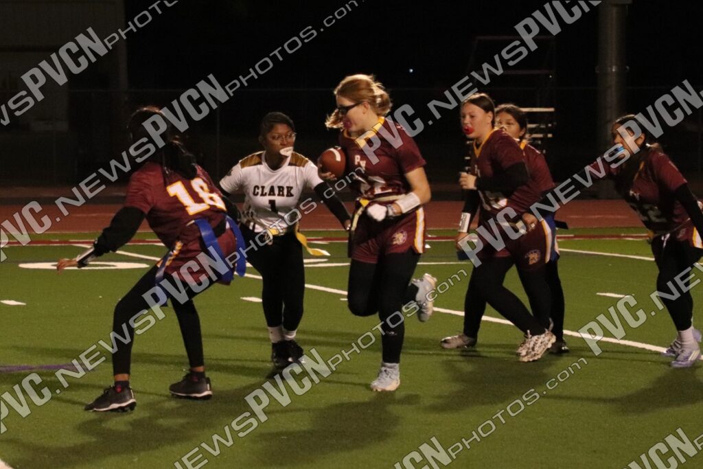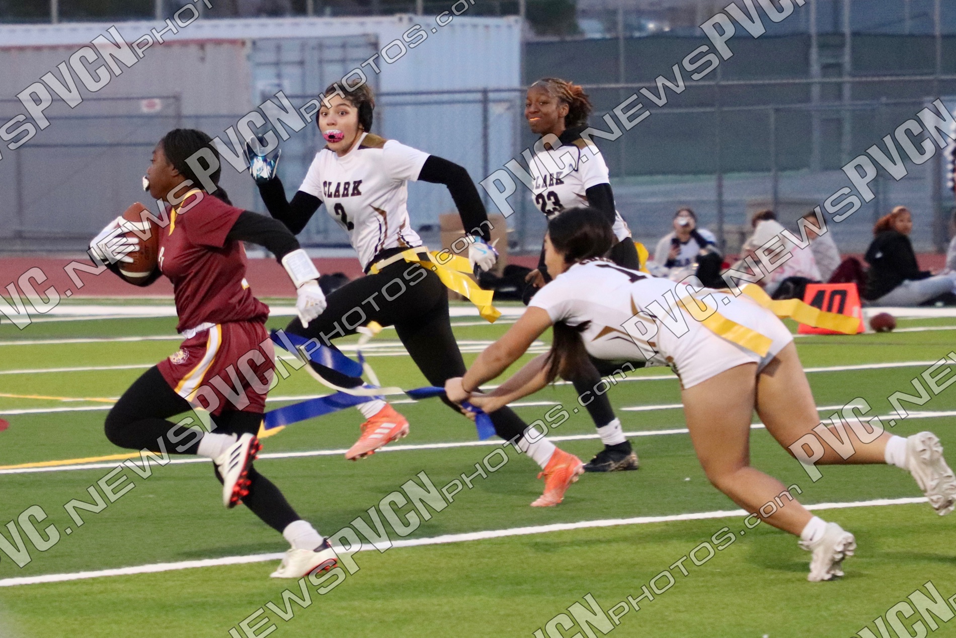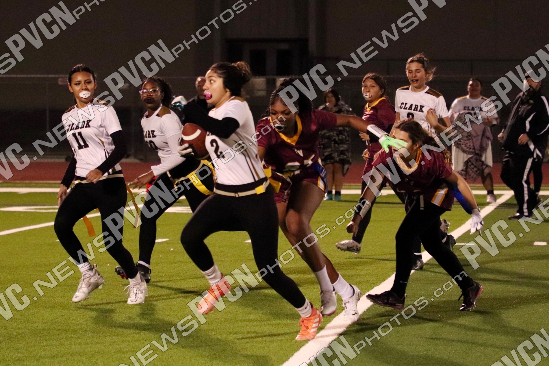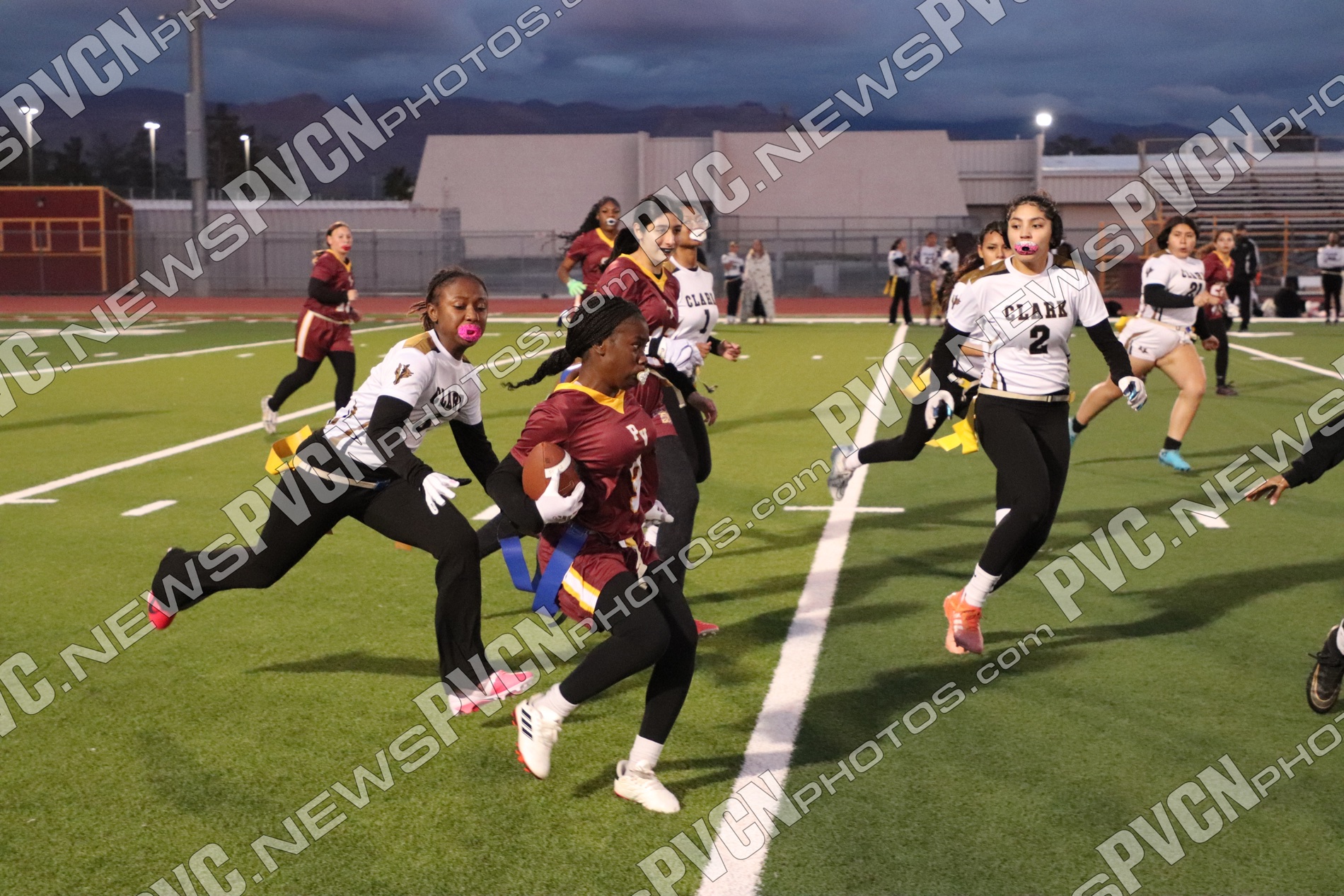 Jazymyn Herrera opened the game at quarterback for Pahrump Valley as the Lady Trojans worked to establish their offense early. Clark struck first with a punt return touchdown, but the Trojans continued to battle on both sides of the ball. Defensively, Ma’liyah Collins made her presence felt right away, pulling a quick flag after an interception to limit additional yardage.