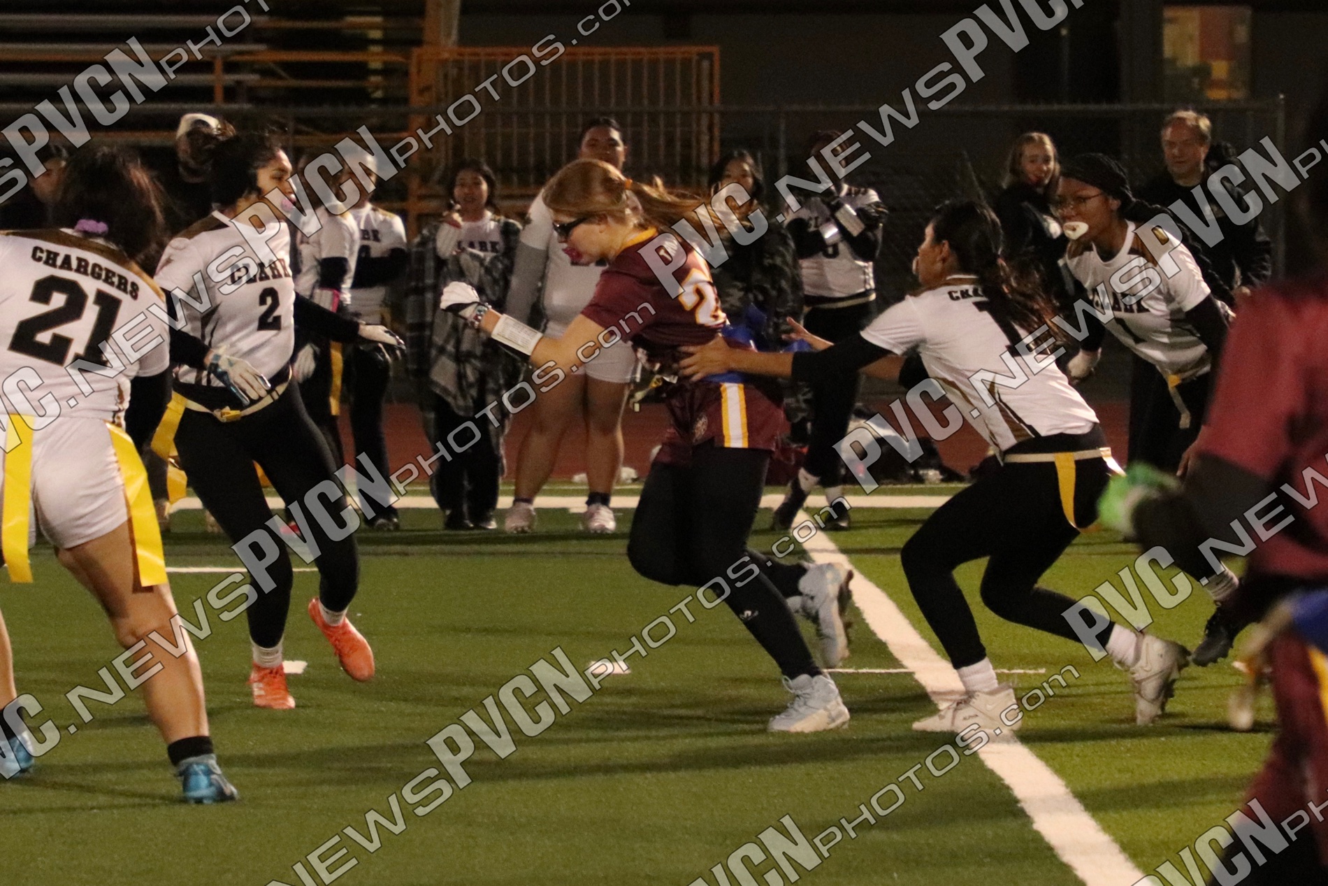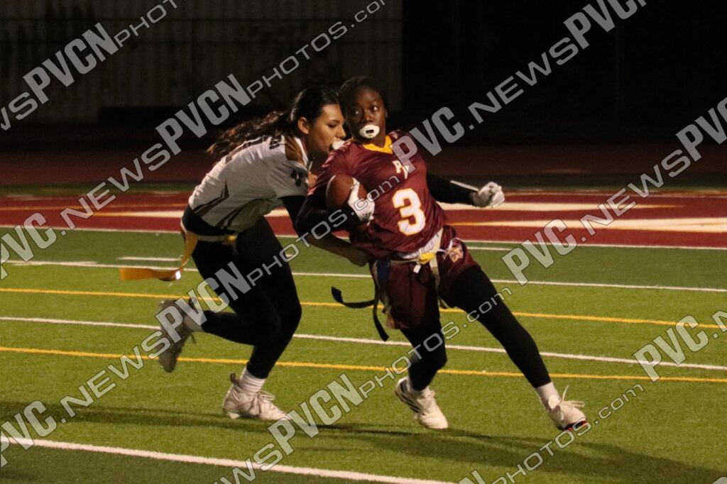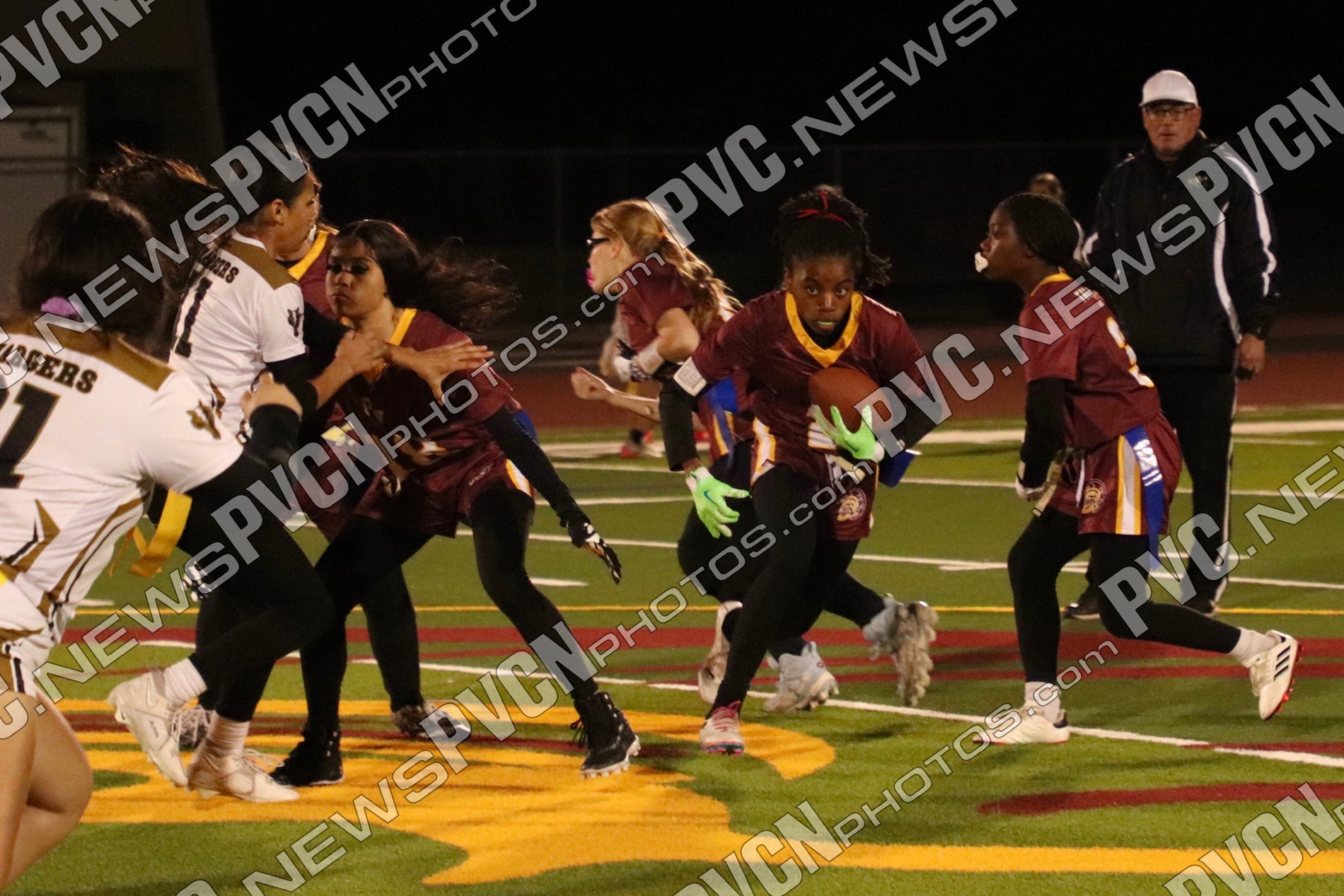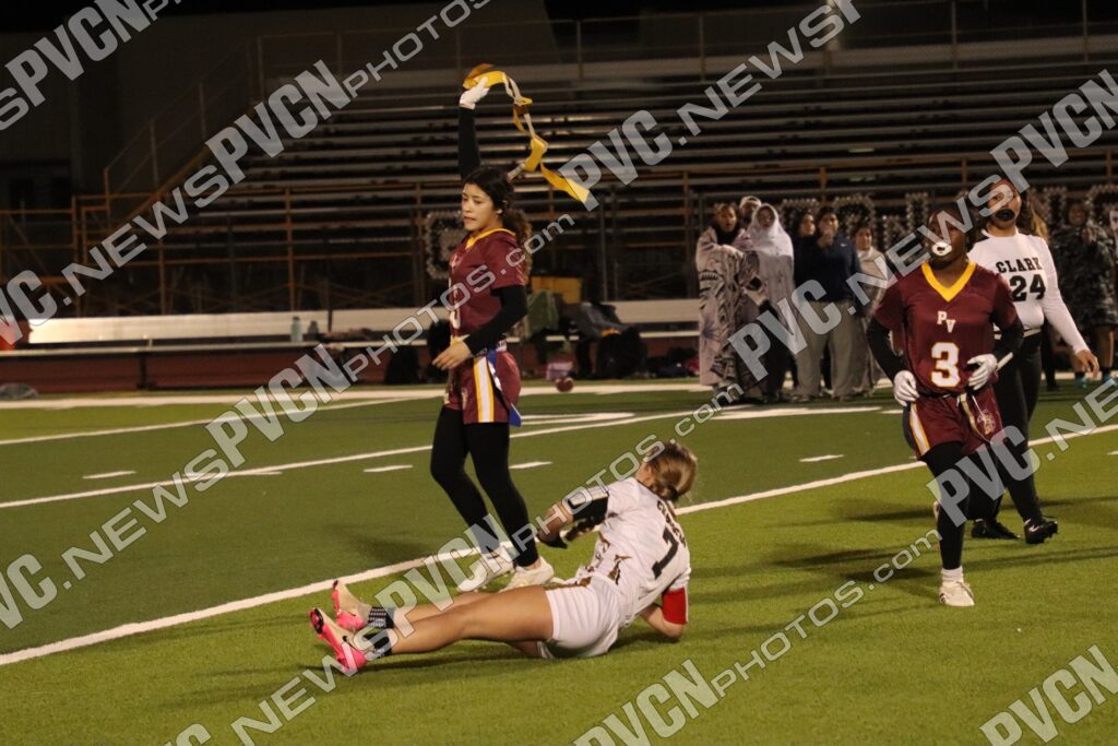 In the second half, Pahrump Valley remained focused and continued to compete with heart. Nixon, Mercado, and Toyia Farmer were consistently around the ball, making stops and pulling flags to slow Clark’s offense. The Lady Trojans also showed persistence offensively, mixing quarterback runs with short completions and keeping drives alive when possible.