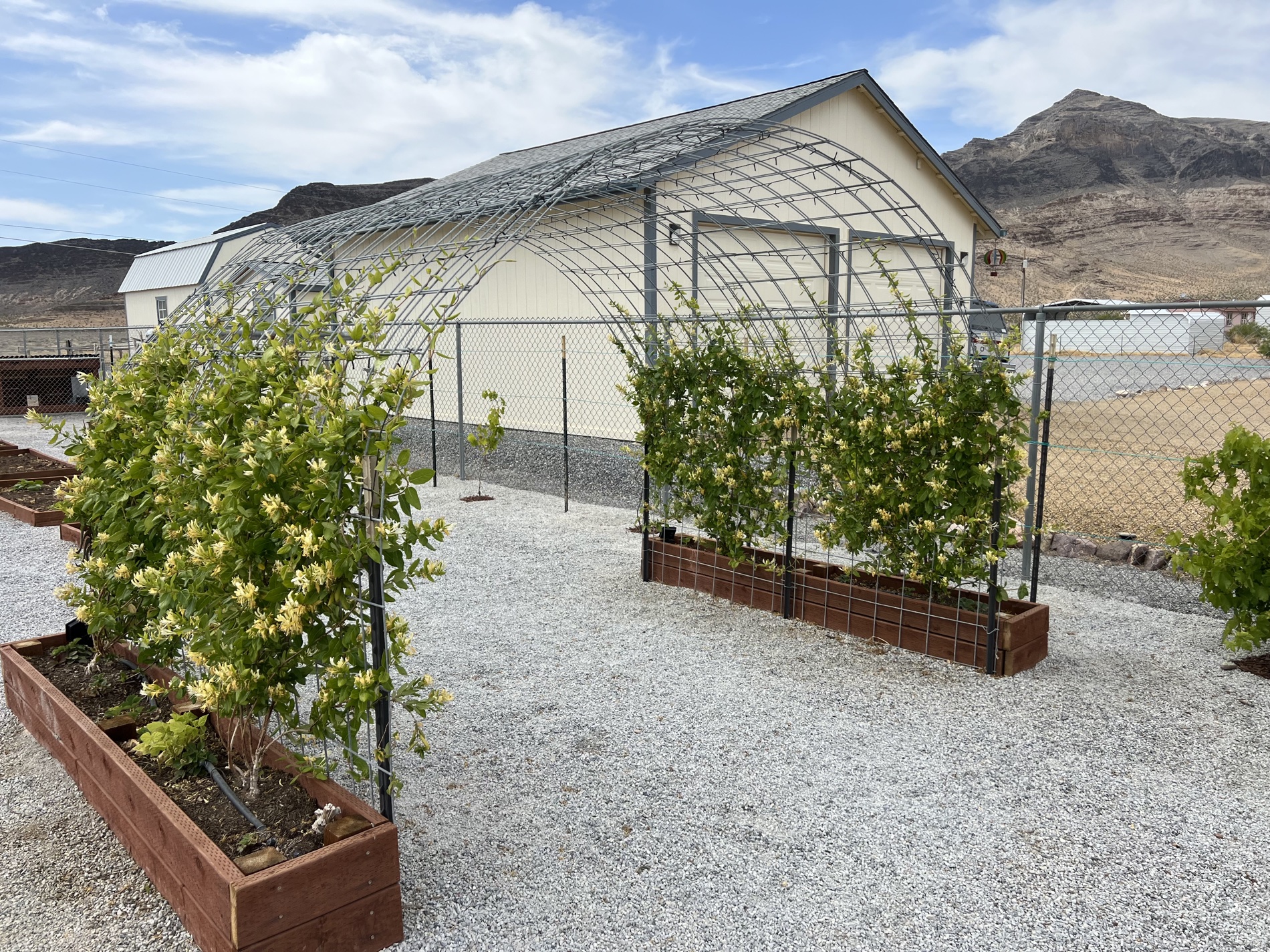 The original two garden beds and their trellis in front of the grape wall