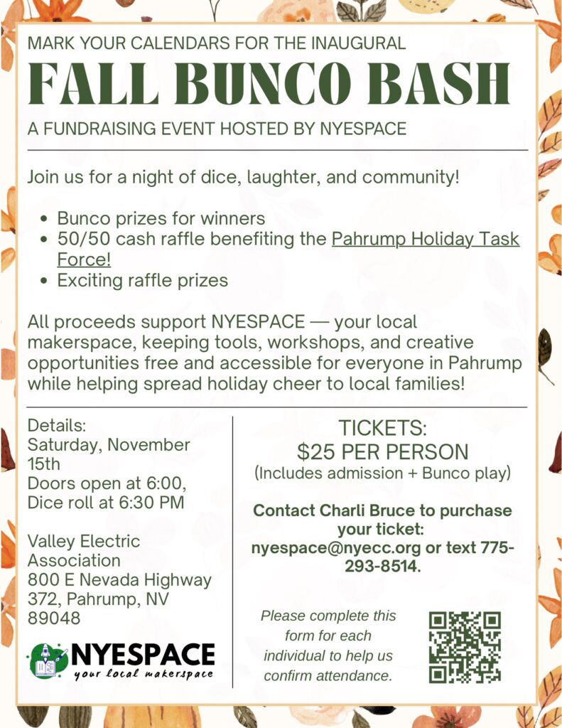 With laughter, community, and a little friendly competition, the Fall Bunco Bash promises to be an evening where every roll supports creativity and kindness in Nye County.