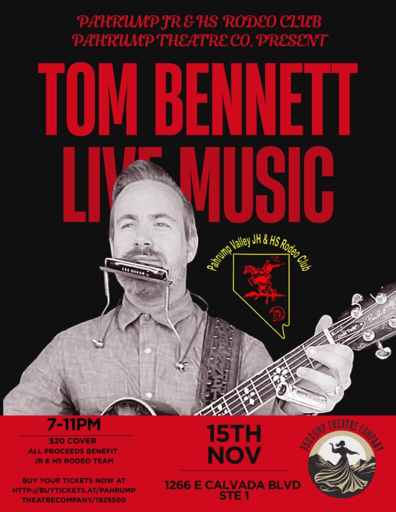 The Pahrump Theatre Company is teaming up with the Pahrump JR & HS Rodeo Club for a night of live music and community spirit in support of local youth athletes. On Friday, November 15, country music performer Tom Bennet will take the stage from 7:00 to 11:00 p.m. at the Pahrump Theatre Company, located at 1266 E. Calvada Blvd., Suite 1.