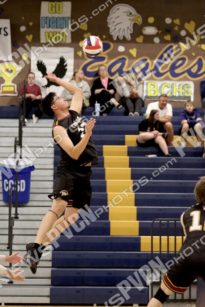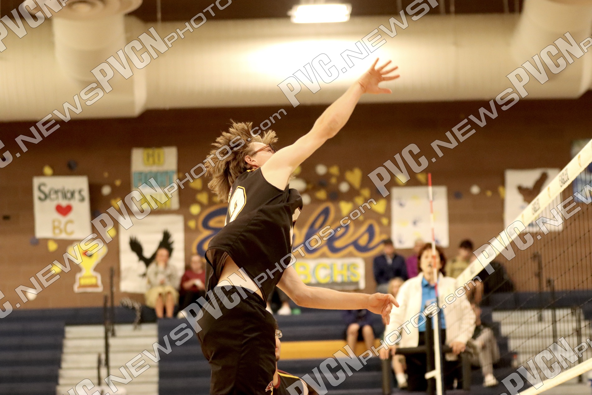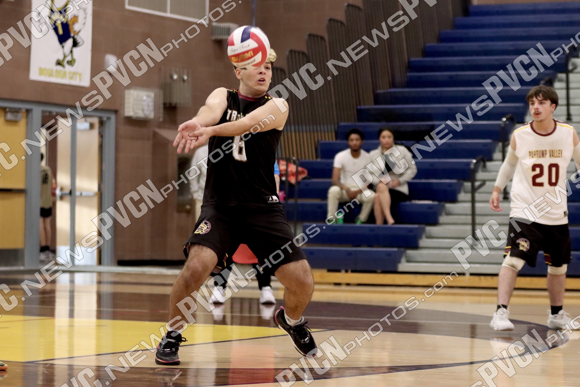 The Pahrump Valley High School boys’ volleyball team hit the road Wednesday, April 15, taking on the Boulder City Eagles in a competitive matchup that showcased hustle, effort and flashes of strong play throughout all three sets.