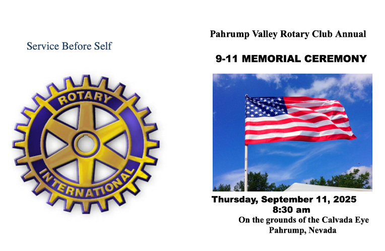 The Pahrump Valley Rotary Club will once again bring the community together to honor the lives lost on September 11, 2001, with a moving remembrance ceremony scheduled for Thursday, September 11, 2025. The program will take place at the Calvada Eye and will begin promptly at 8:30 a.m. Participants are asked to be “in place” by 8:15 a.m.