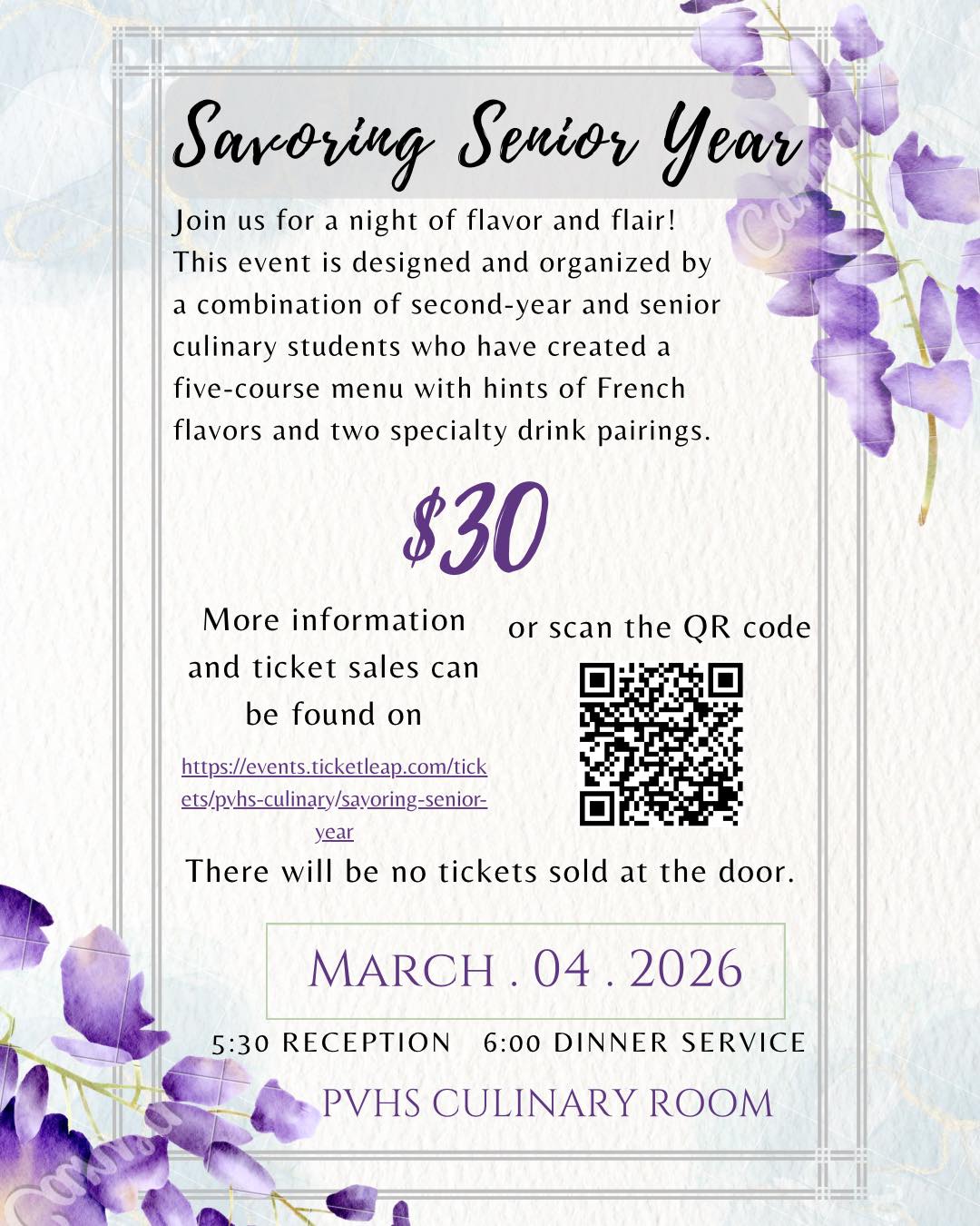 Tickets are $30 and must be purchased in advance, as no tickets will be sold at the door. Community members can purchase tickets online at https://events.ticketleap.com/tickets/pvhs-culinary/savoring-senior-year.