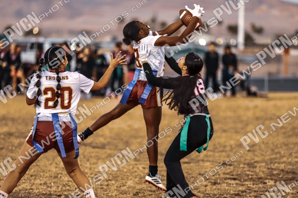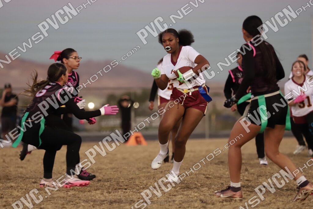 The Pahrump Valley High School girls’ flag football teams traveled to Las Vegas on Monday, Dec. 15, to face the SLAM Bulls at the Russell Road Recreation Complex, gaining valuable experience as both the junior varsity and varsity squads continued to develop against strong competition.