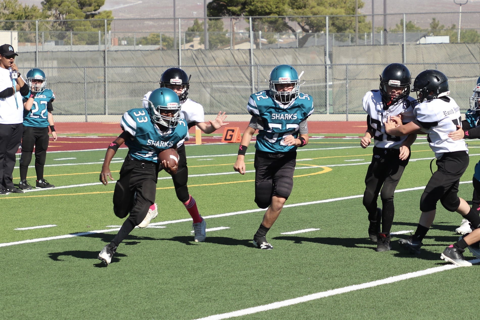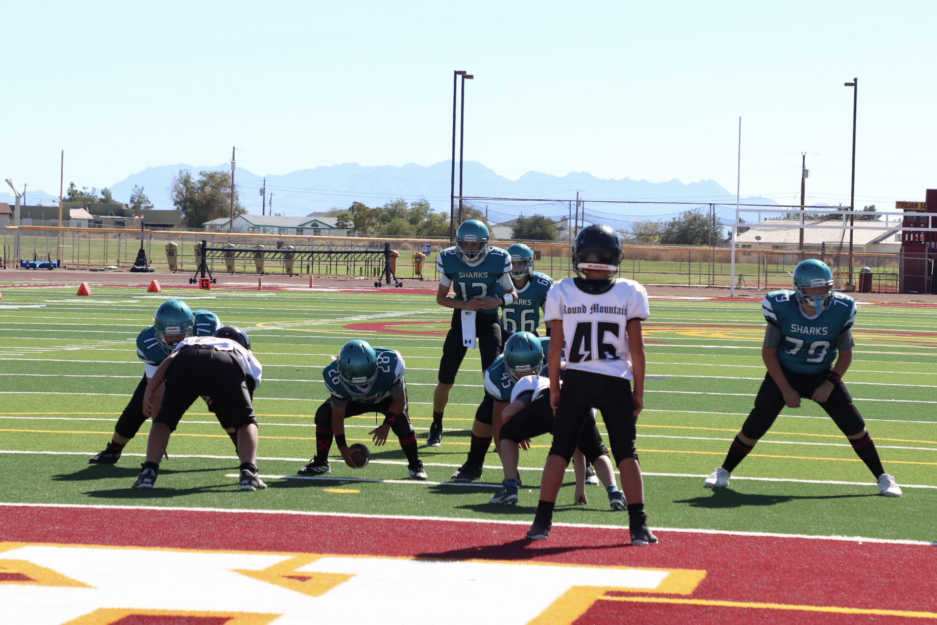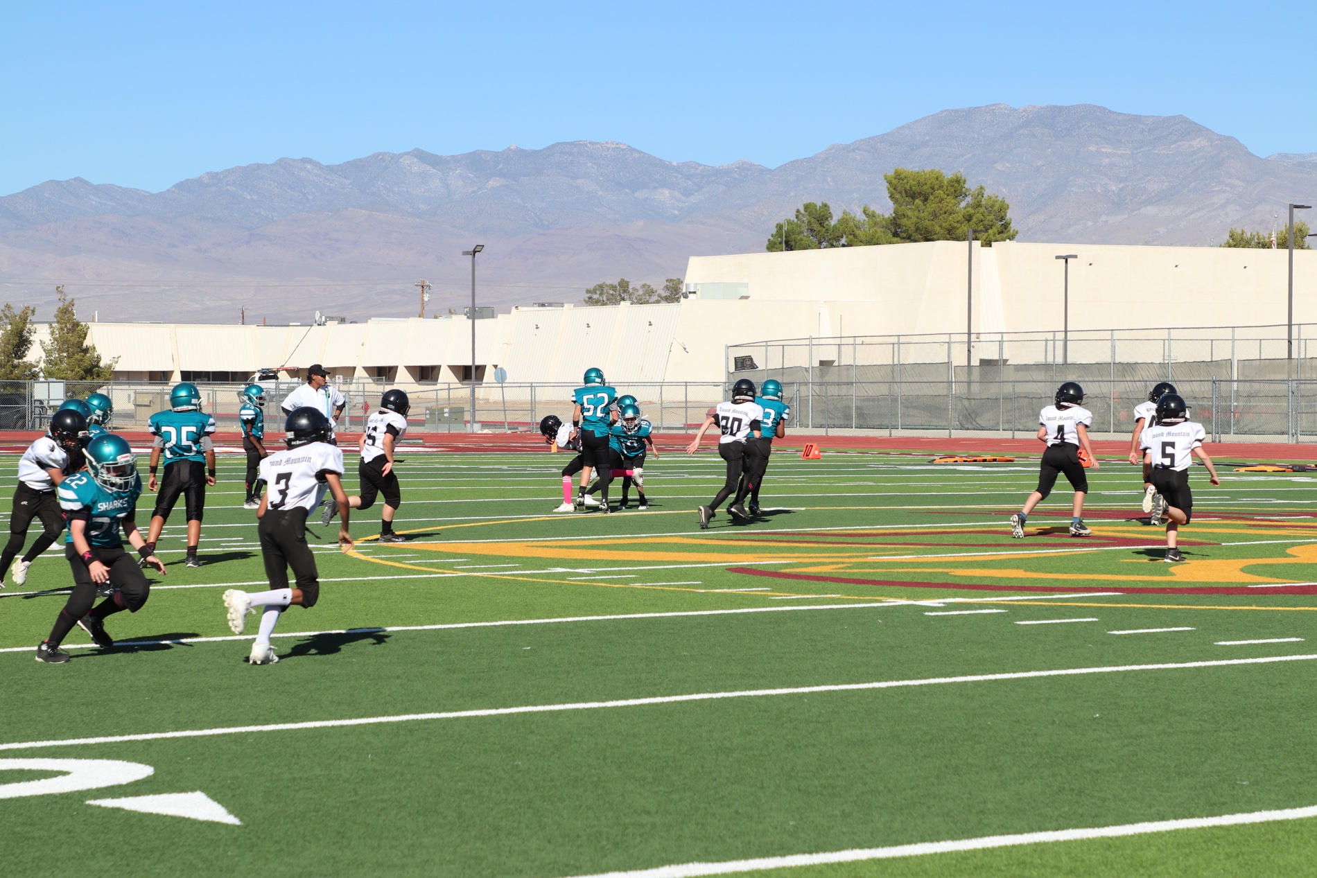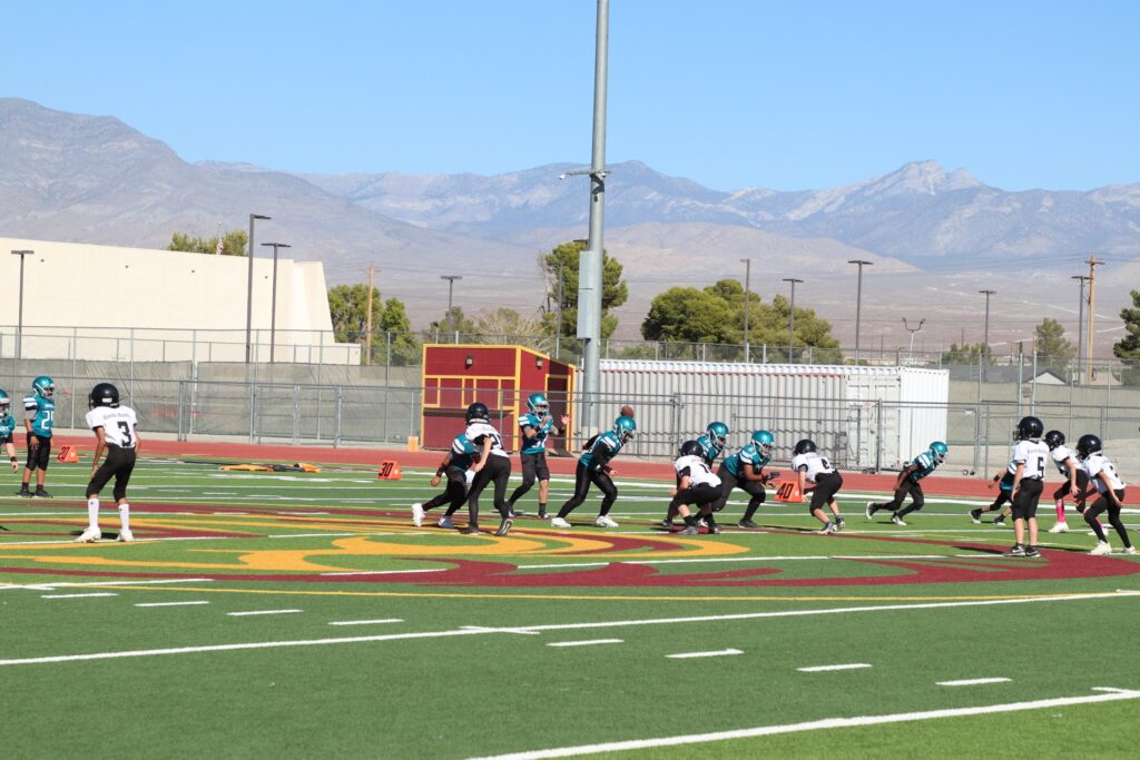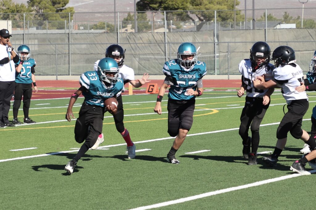 The Rosemary Clarke Middle School Sharks football team wrapped up their regular season in commanding fashion on Saturday, October 19, shutting out Round Mountain 43–0 at home in Pahrump. The victory cemented the Sharks’ undefeated record in league play and secured them the top seed heading into this Saturday’s championship game.
