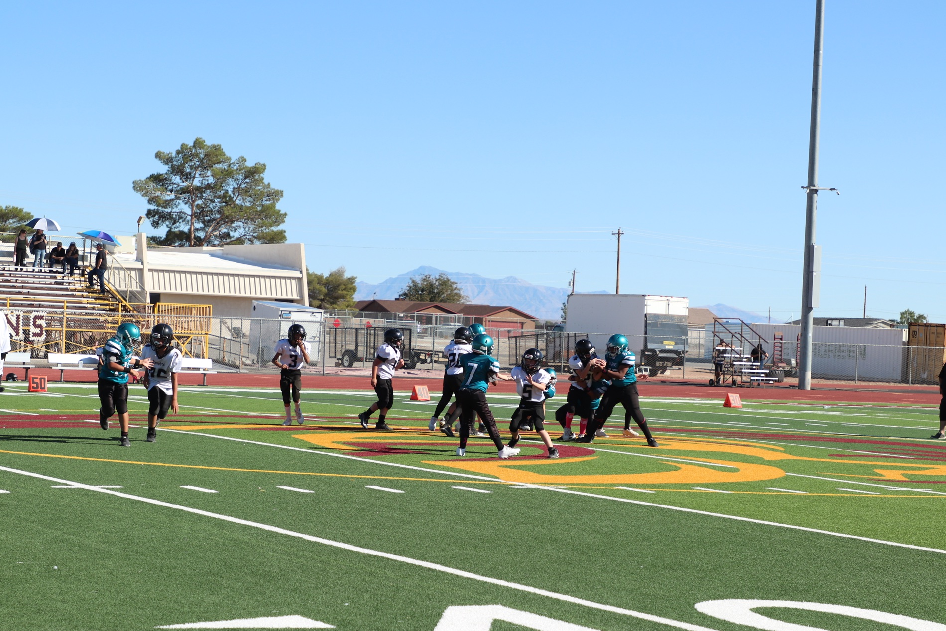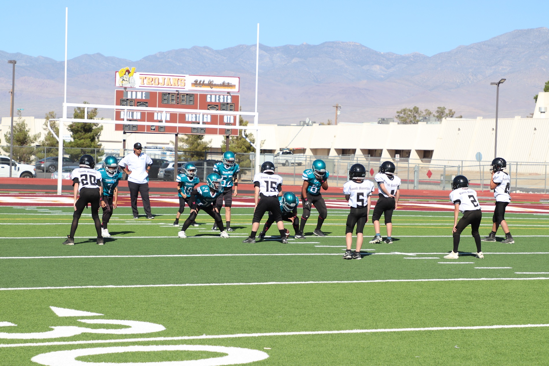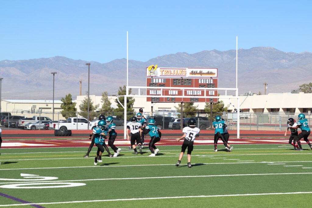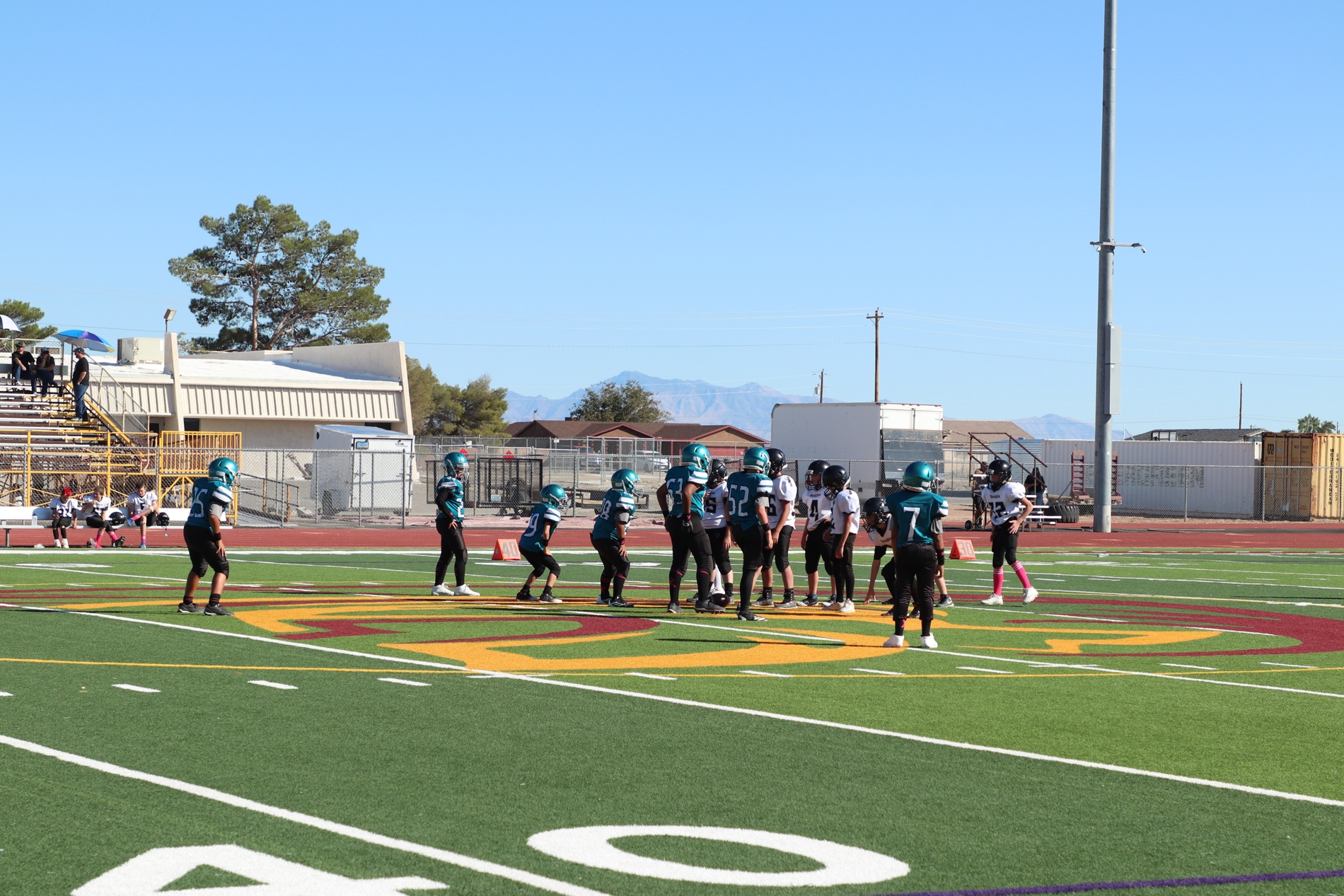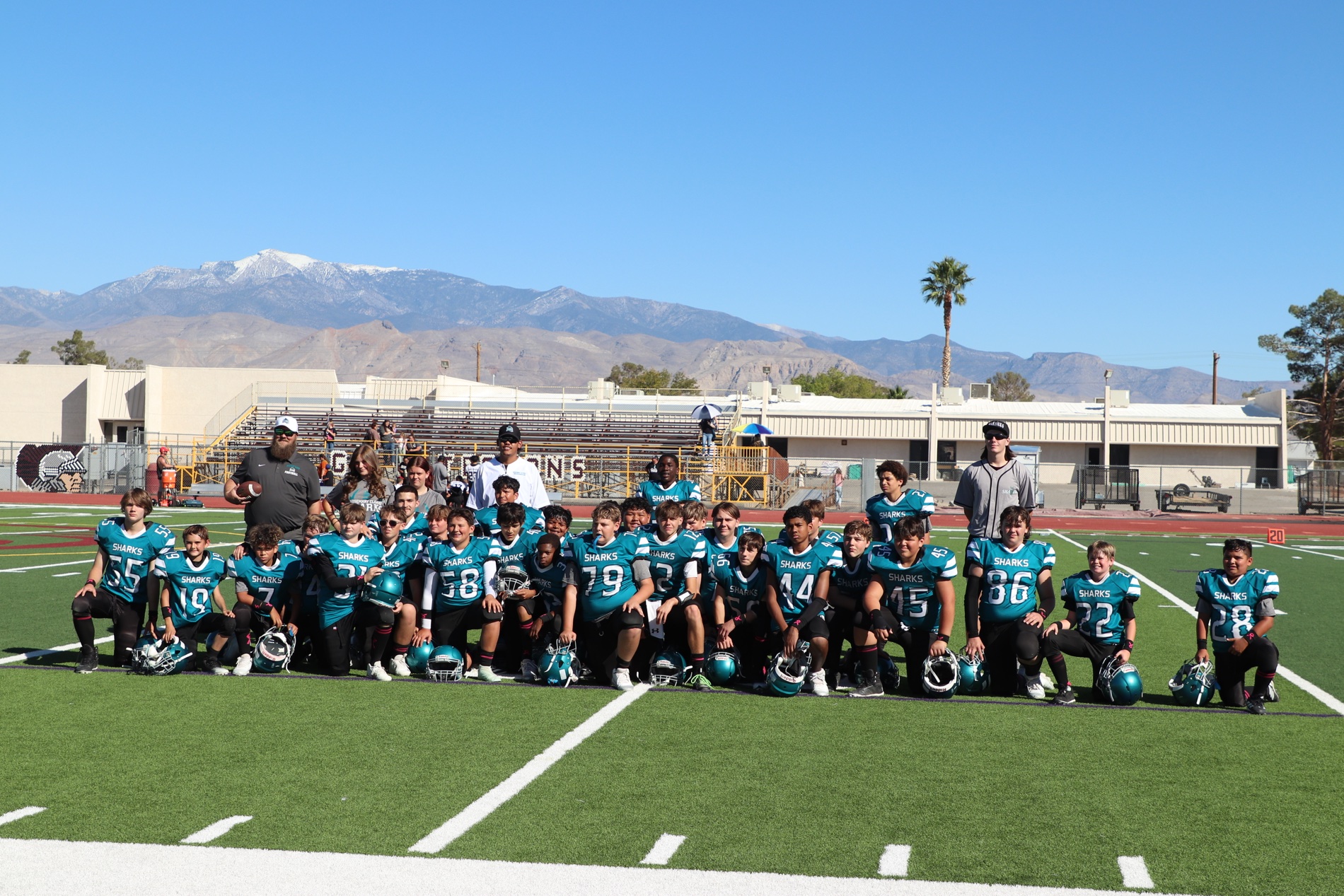 The Rosemary Clarke Middle School Sharks football team wrapped up their regular season in commanding fashion on Saturday, October 19, shutting out Round Mountain 43–0 at home in Pahrump. The victory cemented the Sharks’ undefeated record in league play and secured them the top seed heading into this Saturday’s championship game.