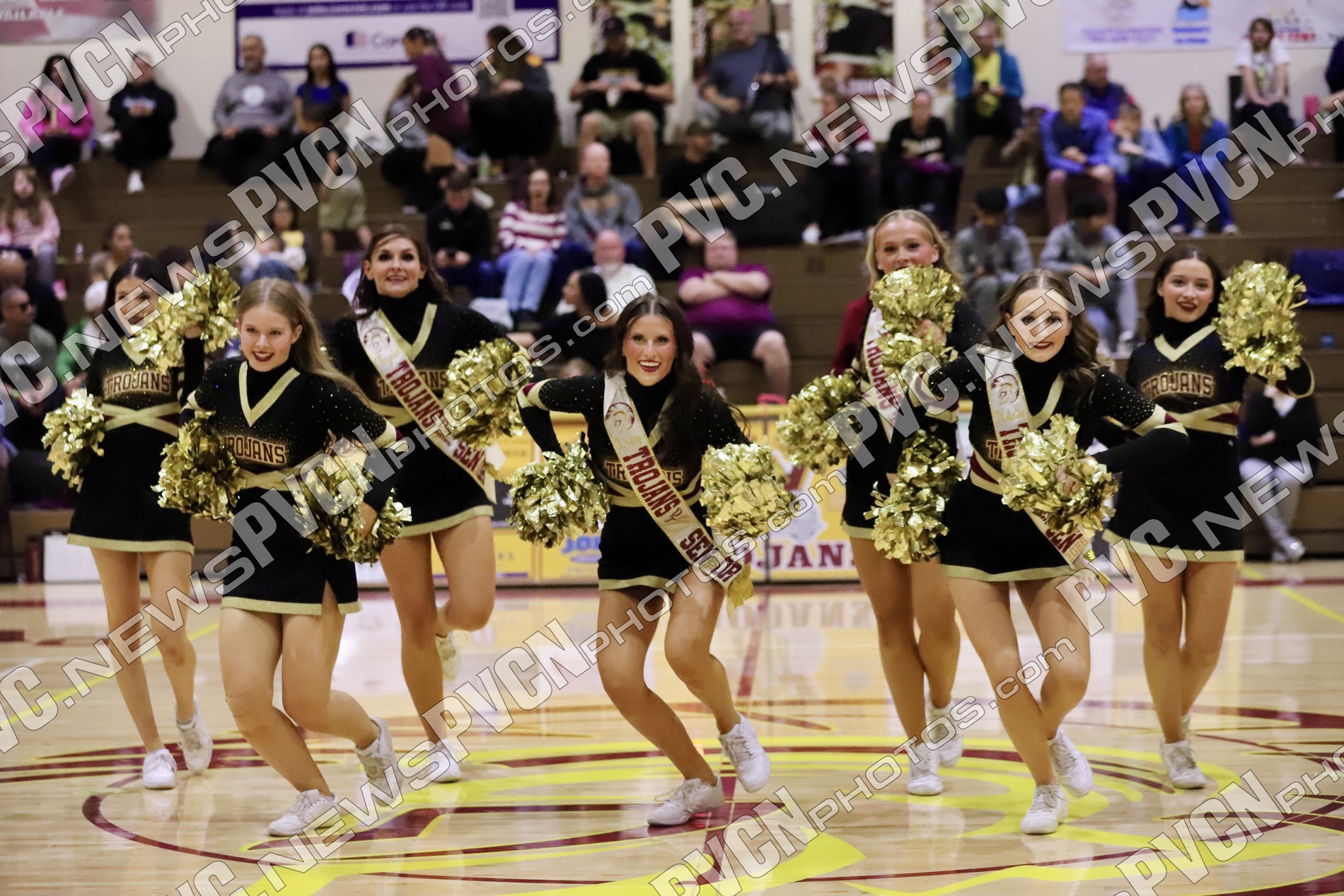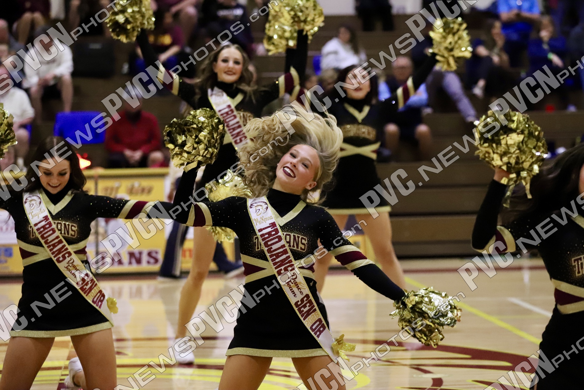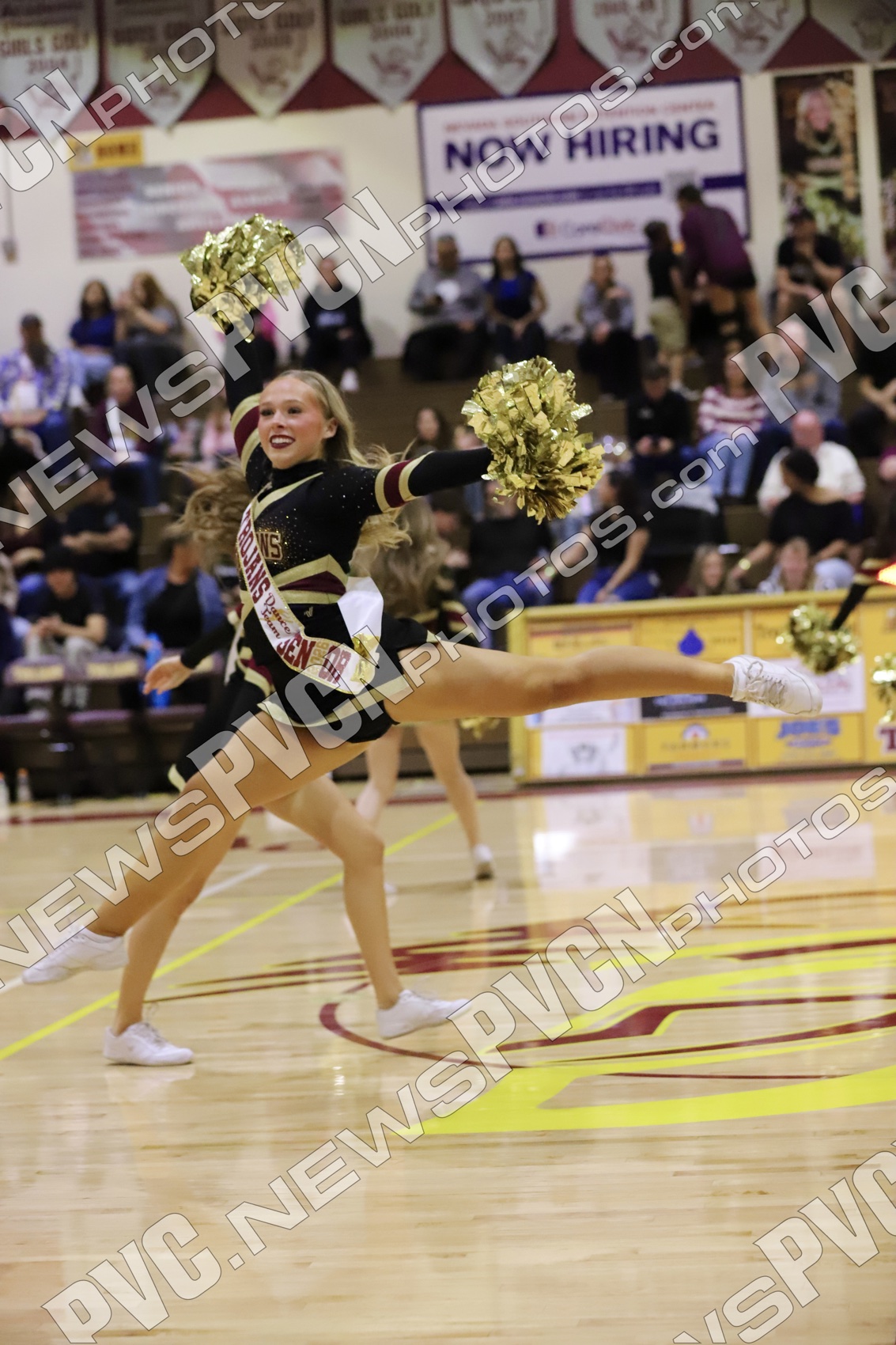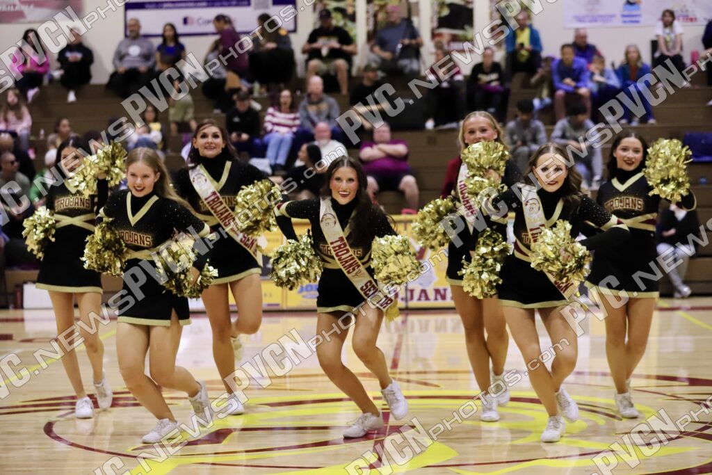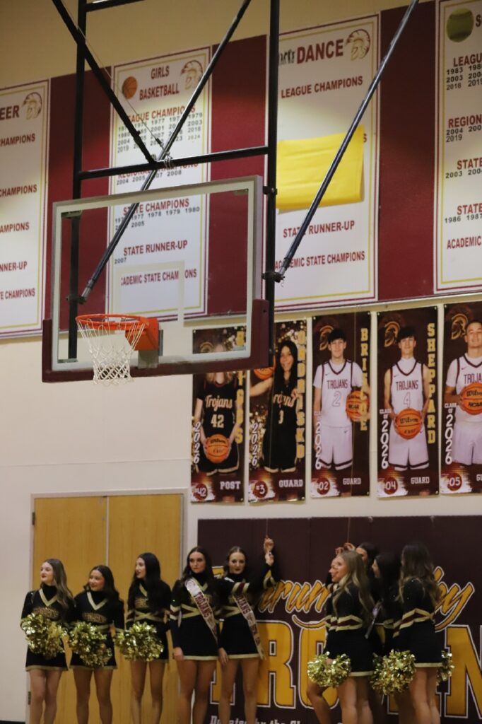 At halftime, the celebration of PVHS student achievement continued with a special banner drop ceremony honoring several Trojan programs. The PVHS Dance Team was recognized for its Regional Championship placement, highlighting the team’s successful competitive season. The recognition extended to both the boys and girls cross country teams, who were honored for capturing Regional Championship titles, the first time in school history that both teams won the Championship in the same year. The moment allowed the home crowd to celebrate the continued success of PVHS athletics, drawing loud applause as each banner was unveiled inside the gym. The dance team also performed a lively routine to keep the energy strong heading into the second half.