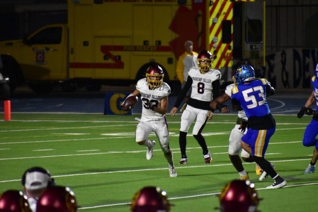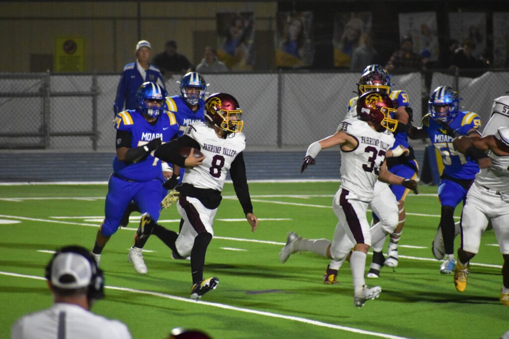 The Pahrump Valley High School Trojans ended their 2025 football season with determination and pride Friday night, November 7, in a thrilling semifinal playoff matchup against the Moapa Valley Pirates. Despite an explosive start and several standout performances, the Trojans came up just short, falling 35–27 on the road in Moapa.