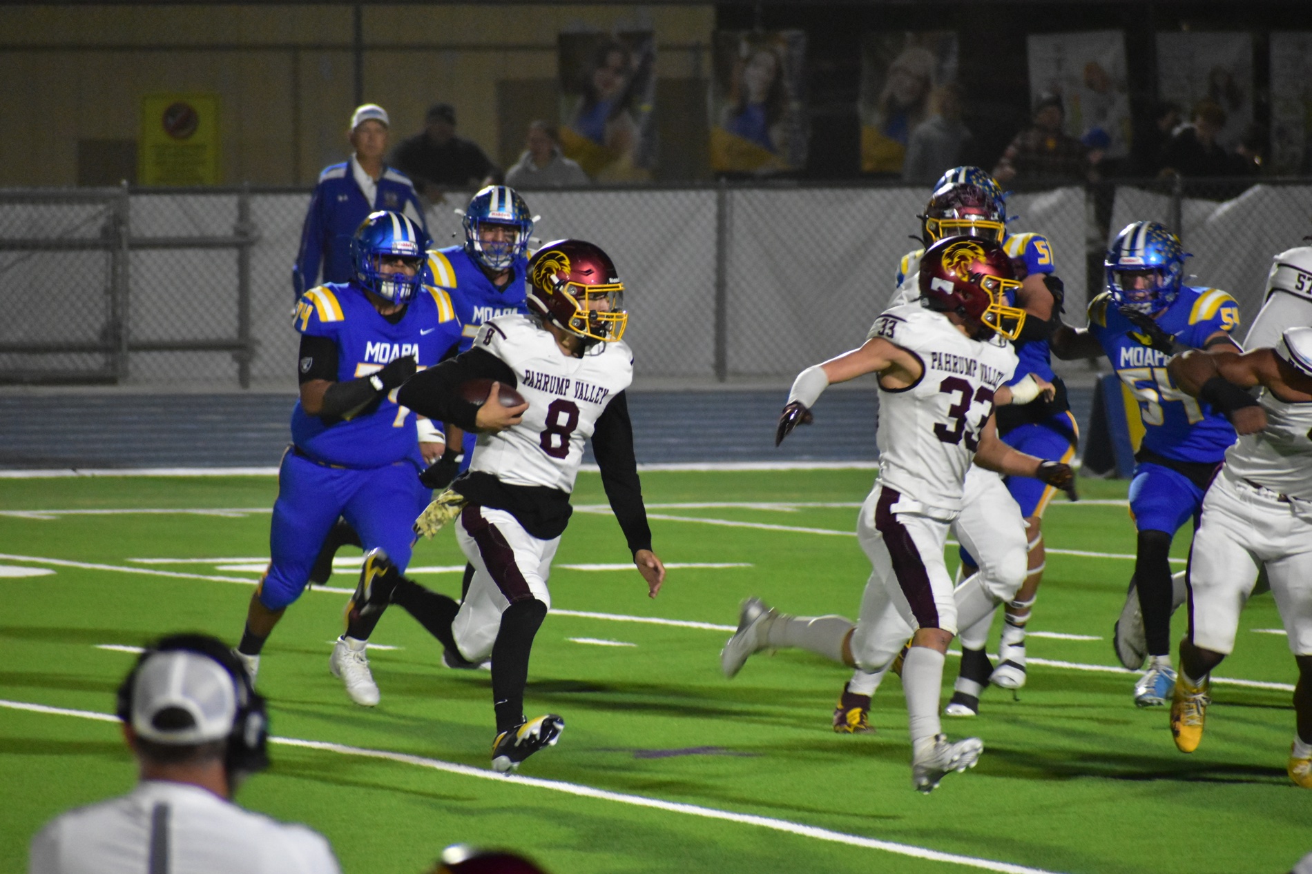 The Pirates came out of the break determined, putting together a strong third-quarter drive built on short runs and quarterback keepers. A goal-line rush gave Moapa its first lead of the night, 21–14. The Trojans responded with steady runs from Alvarez and Horibe, but an incomplete pass on fourth down ended their drive. Moments later, a fluke play—where Moapa fumbled and recovered the ball for a touchdown—extended the Pirates’ lead to 28–14.