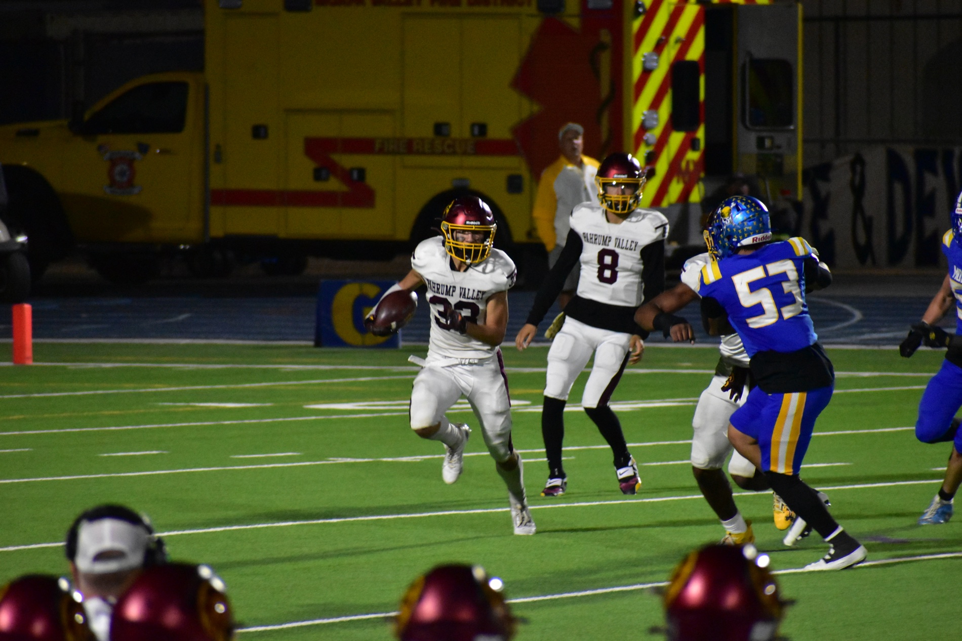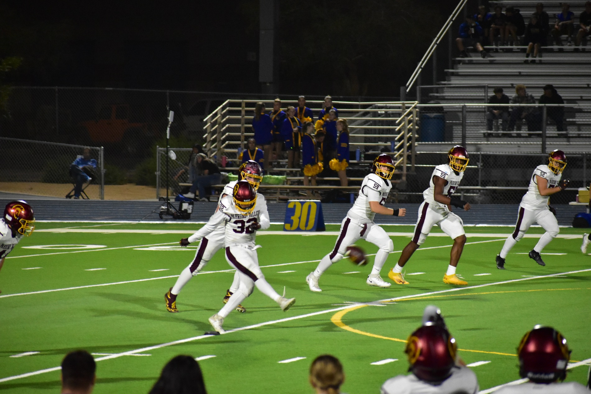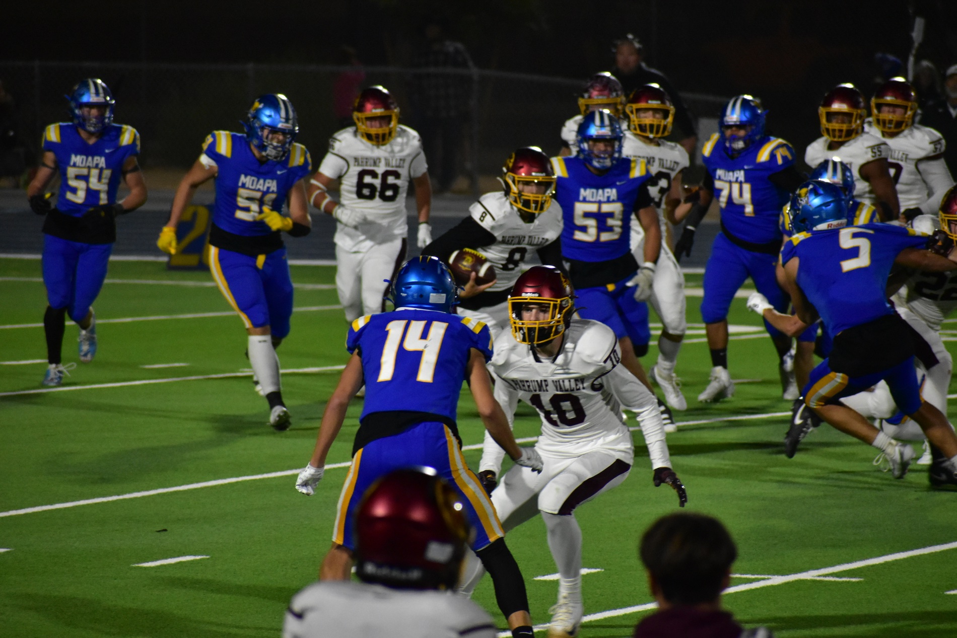 Moapa, however, found its rhythm late in the second quarter. After recovering from a holding penalty, the Pirates scored on a long pass to close the gap to 14–7. Then, with less than a minute left in the half, Moapa capitalized on a Pahrump fumble, returning it for a touchdown to tie the game 14–14 heading into halftime.