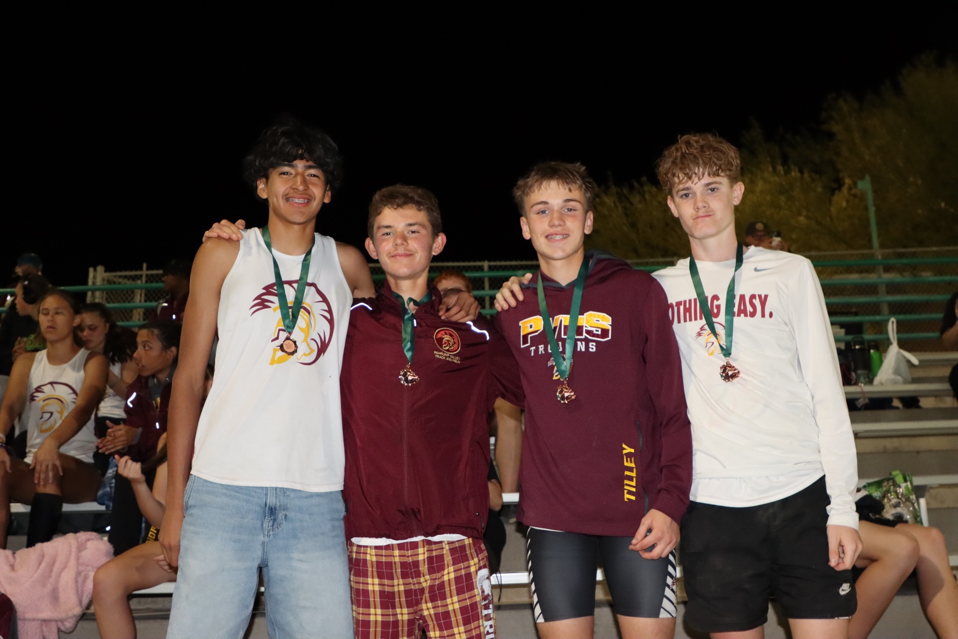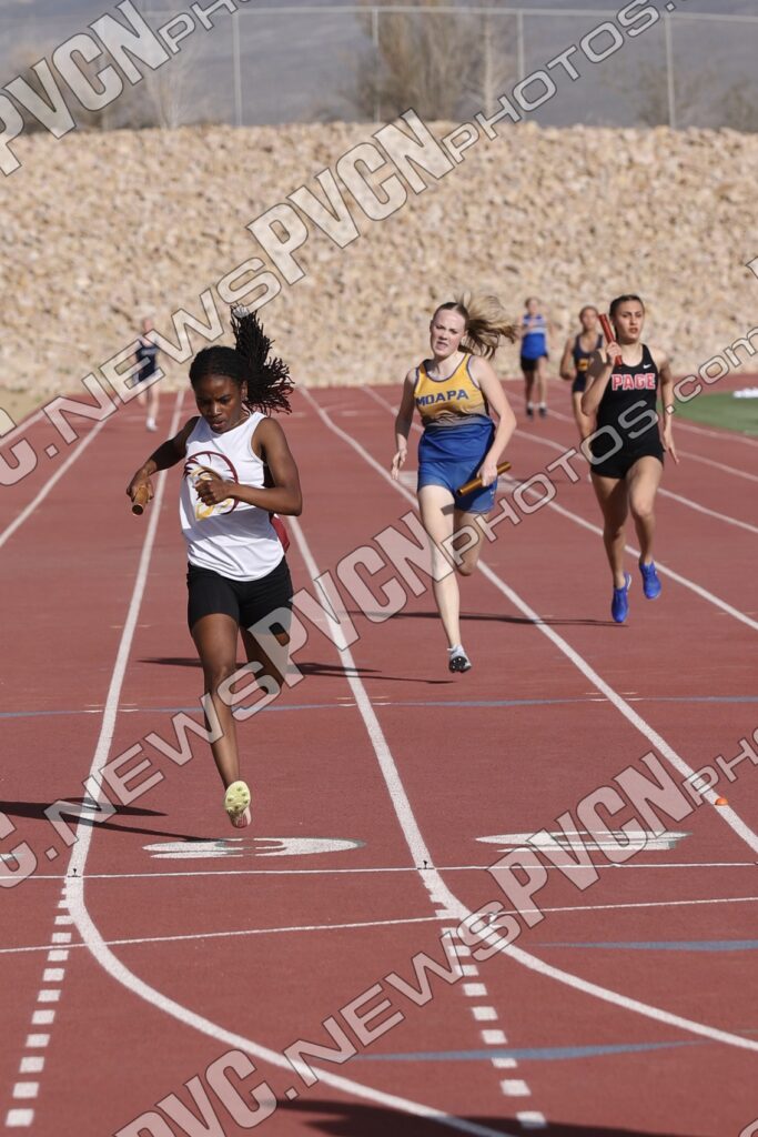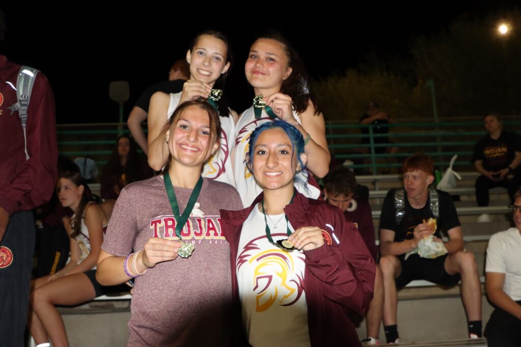 Pahrump’s distance crews set the tone early in the relays. The boys 4×800-meter relay team of Kris Trejo, Daniel Thompson, Josh Flores and Logan Tilley placed third with a time of 9:11.58. The girls 4×800 relay squad of Alexis Clouser, Addi Nelsen, Ava Bowers and Sophie Romero claimed first place in 11:09.07, continuing a strong trend for the Trojans in distance events.