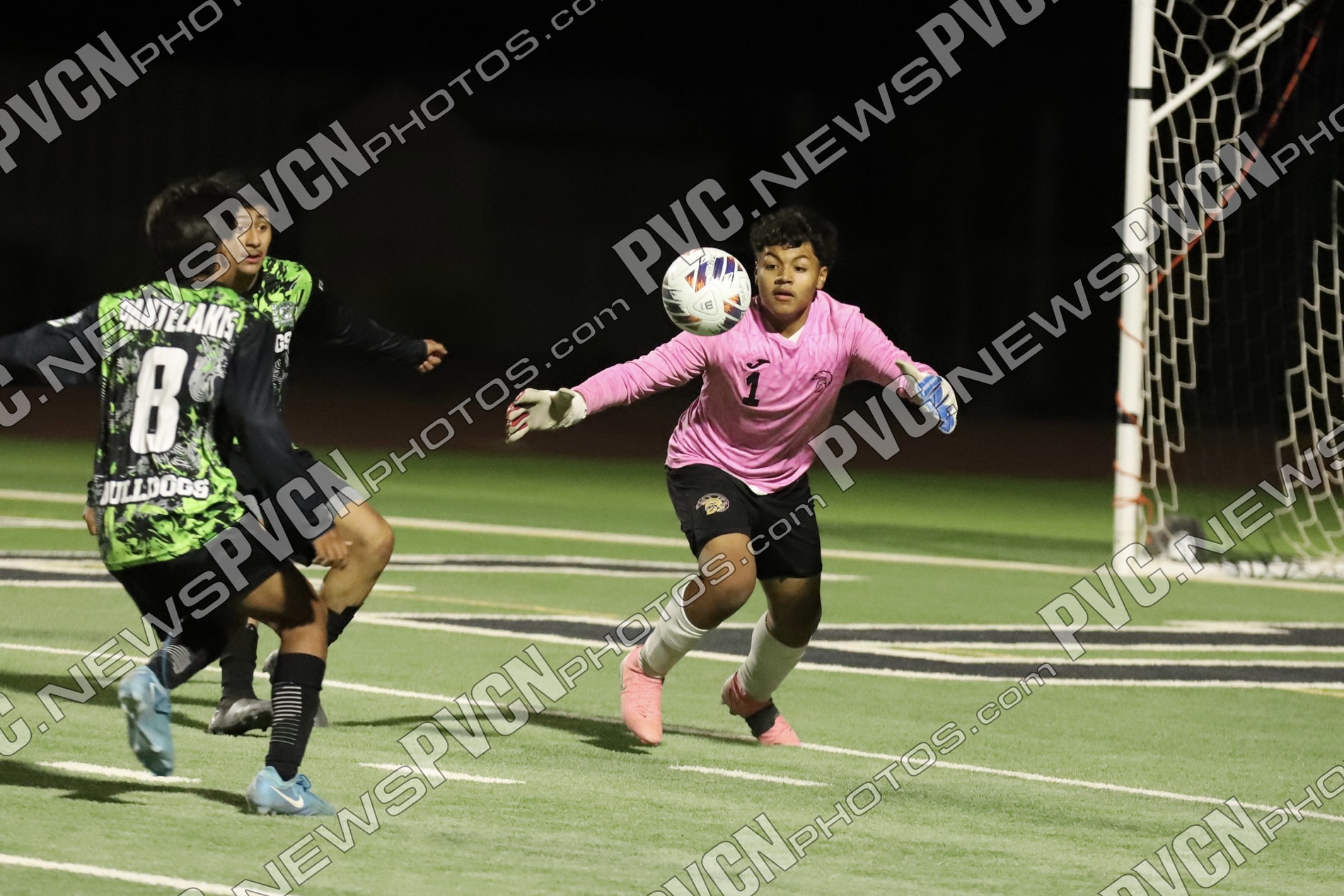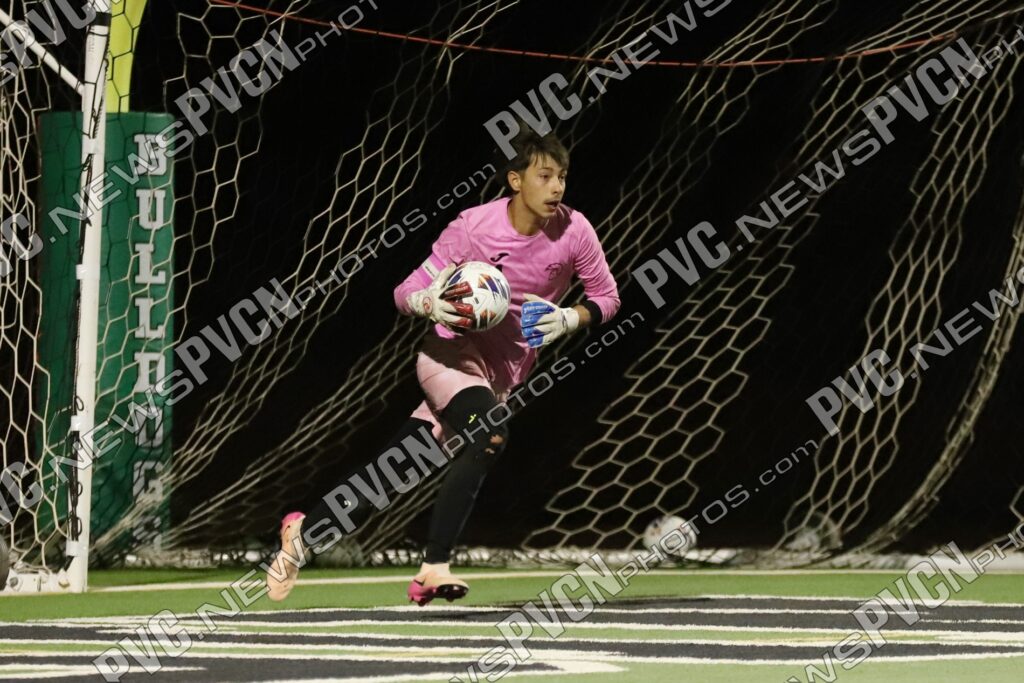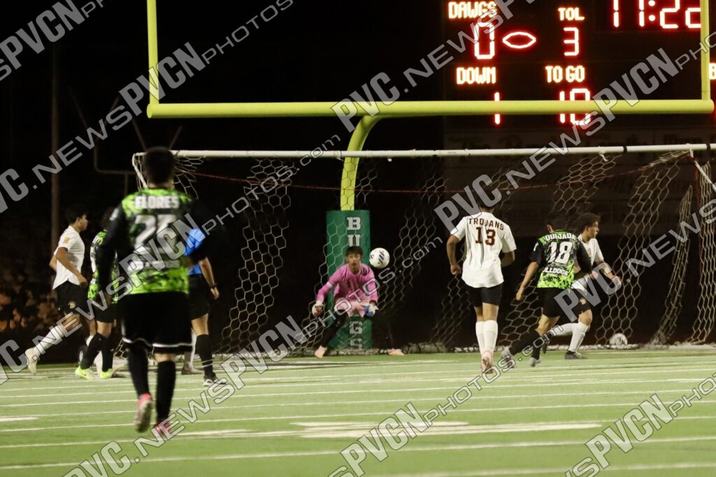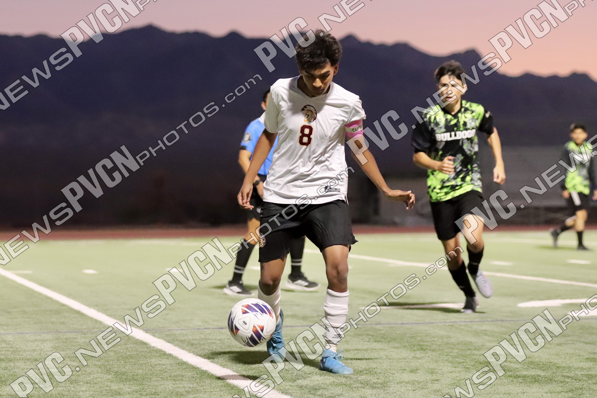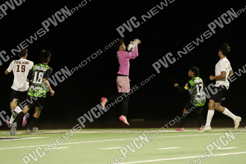 The game opened with intensity from both sides. In the first minute, Pahrump was awarded a penalty kick after a handball in the box, but Adrian Dominguez-Leyva’s shot just skimmed the top bar and flew over. From there, the Bulldogs applied pressure, but the Trojans’ defense, anchored by goalkeeper Cayden Cowley, stood tall. Cowley made several diving saves, including a critical stop on a 12-yard penalty kick that kept the Trojans within reach early on.