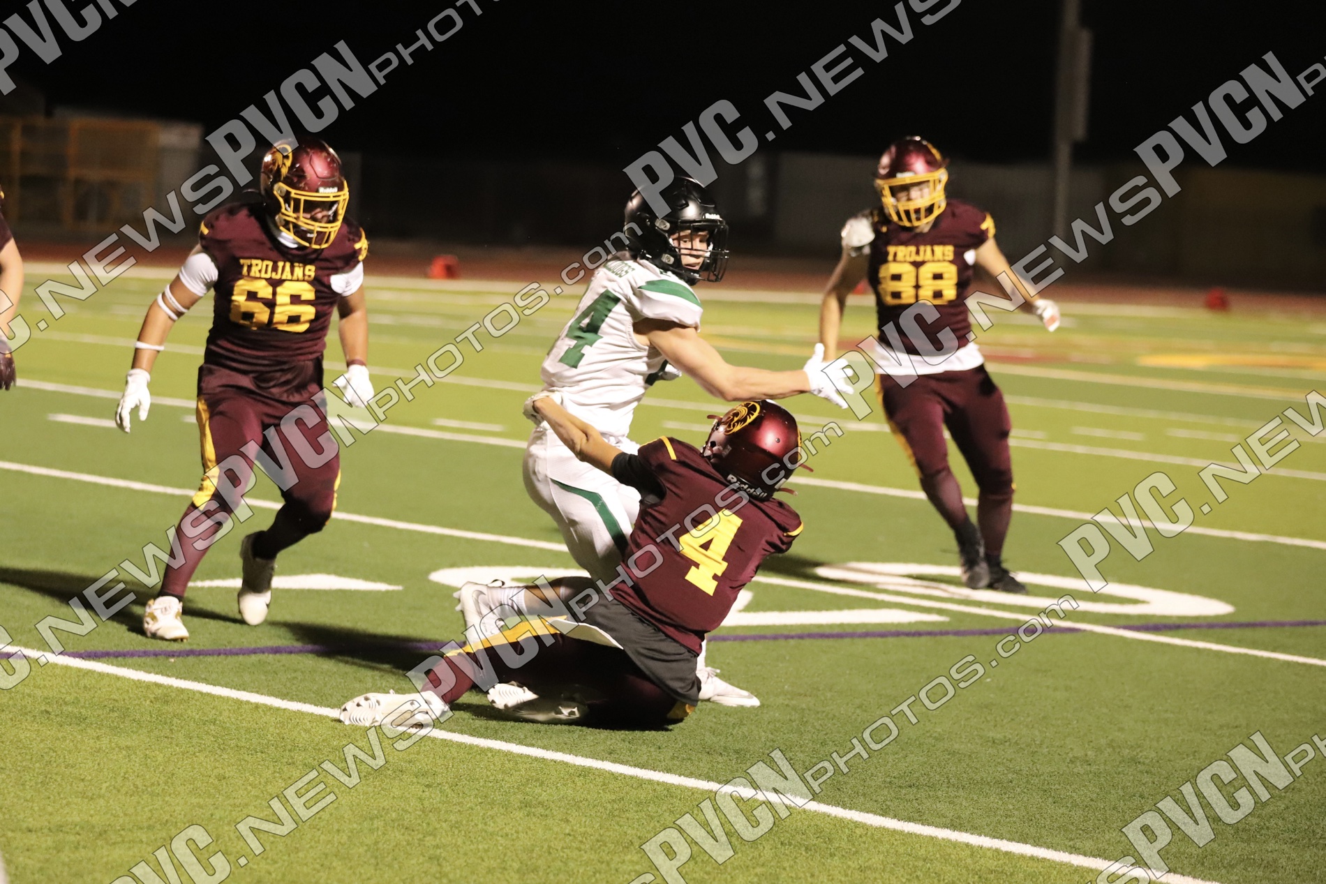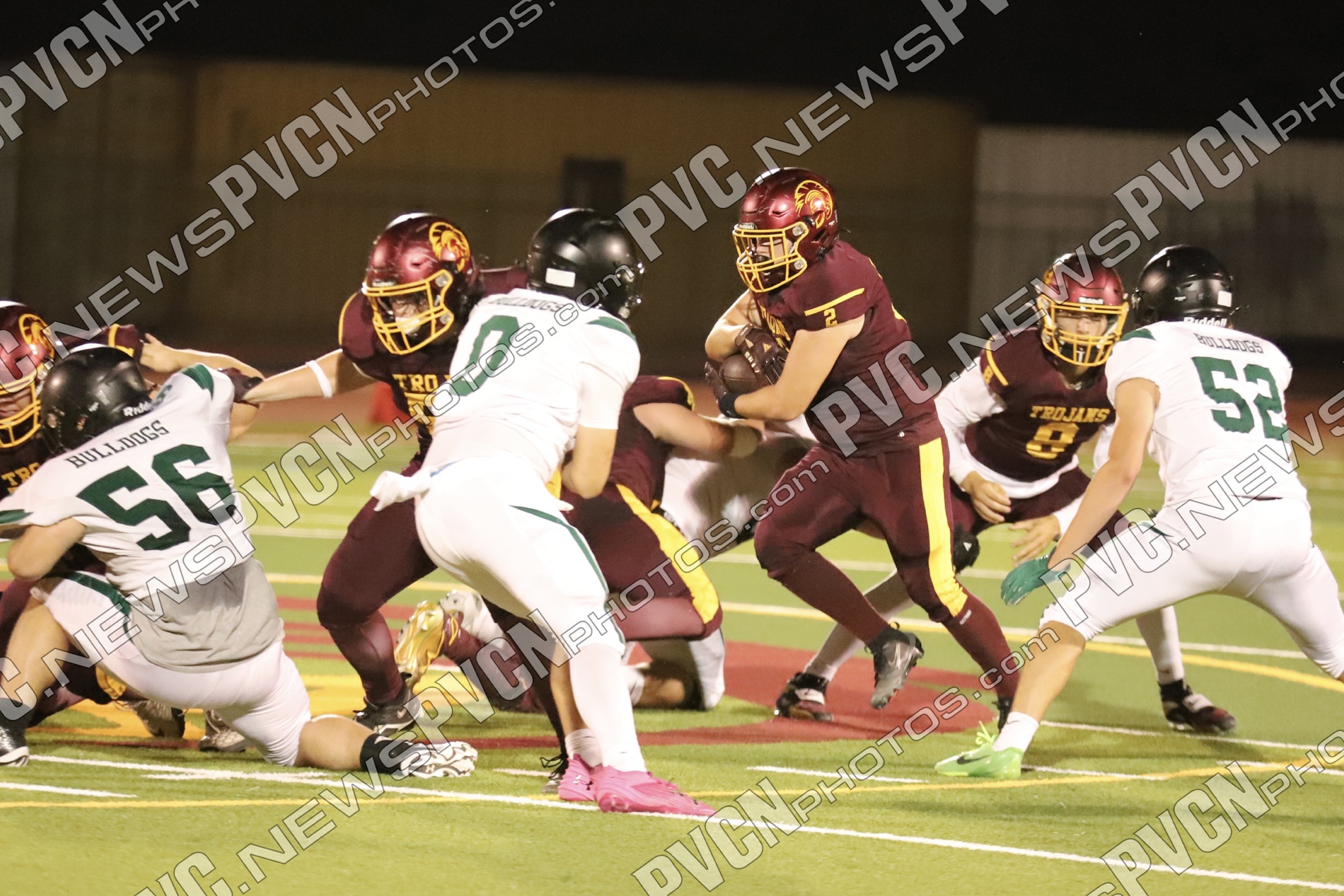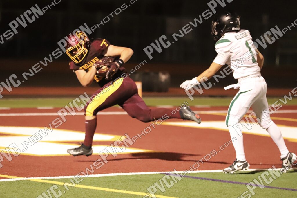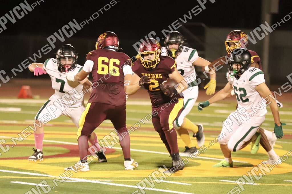 Virgin Valley won the coin toss and elected to receive, starting strong with short yardage plays before the Trojans’ defense made an early statement. On the Bulldogs’ second drive, Pahrump’s Lucas Gavenda intercepted a pass and ran it back for a touchdown. A penalty against the Bulldogs on the return helped the Trojans take an early 6-0 lead after the extra point attempt went wide.