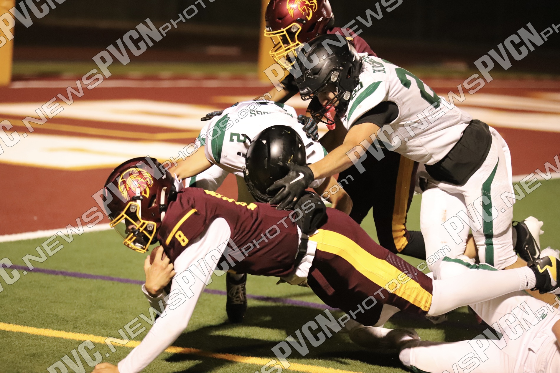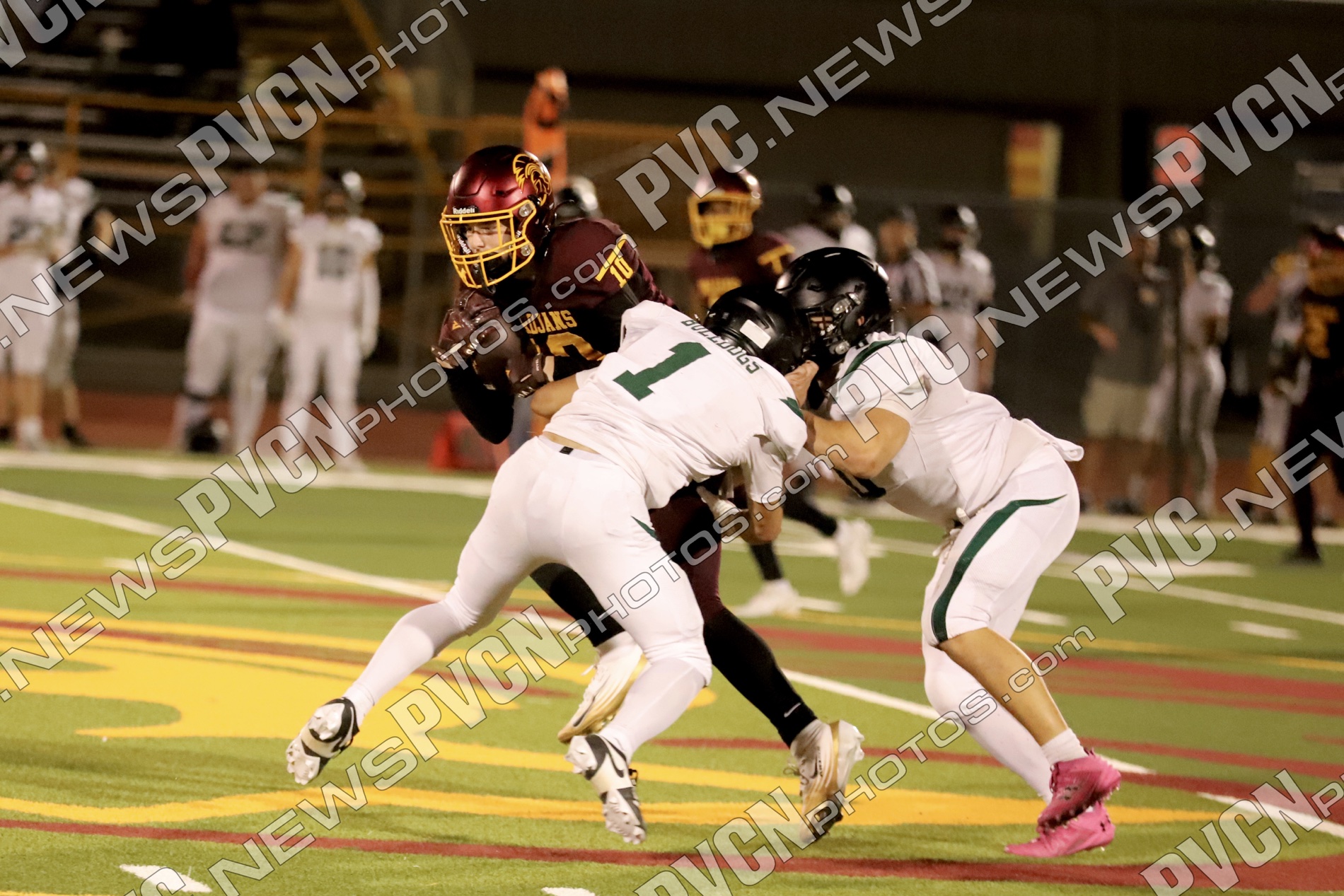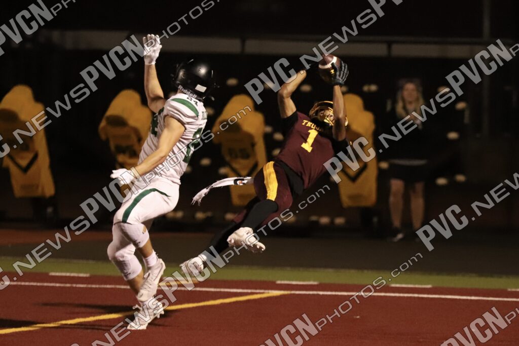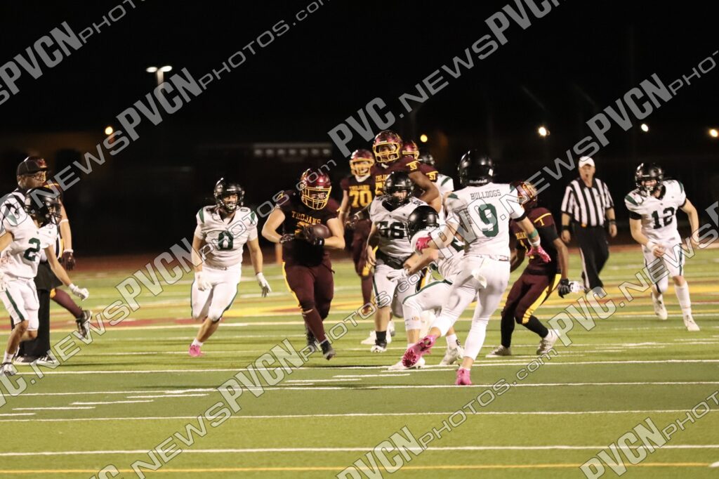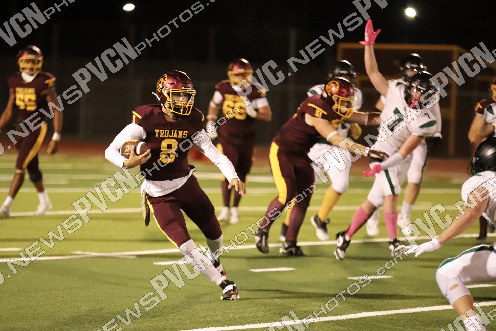 Virgin Valley won the coin toss and elected to receive, starting strong with short yardage plays before the Trojans’ defense made an early statement. On the Bulldogs’ second drive, Pahrump’s Lucas Gavenda intercepted a pass and ran it back for a touchdown. A penalty against the Bulldogs on the return helped the Trojans take an early 6-0 lead after the extra point attempt went wide.