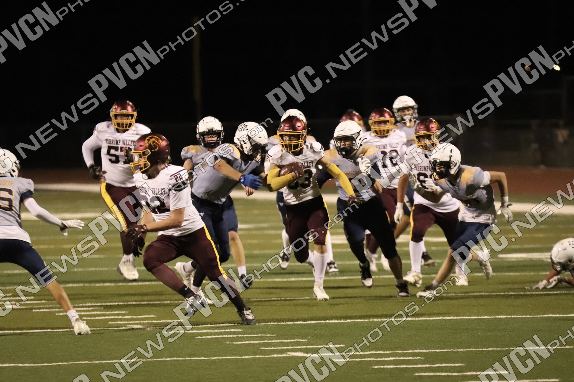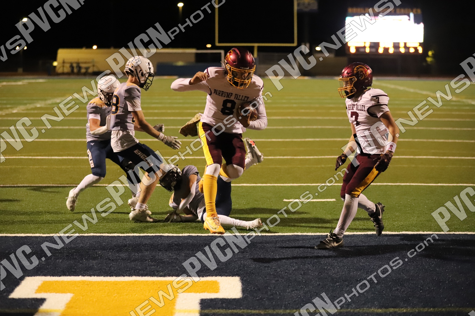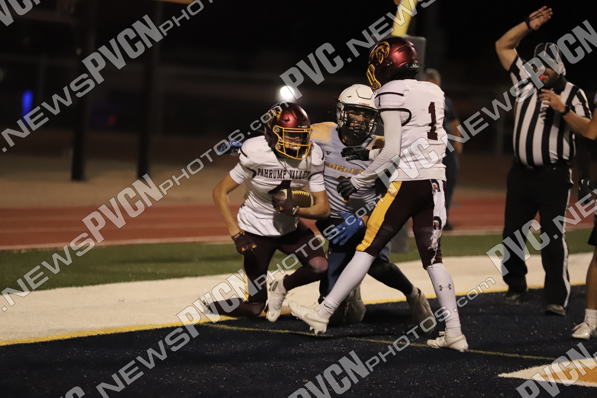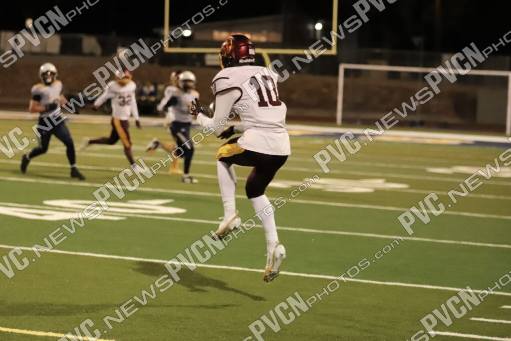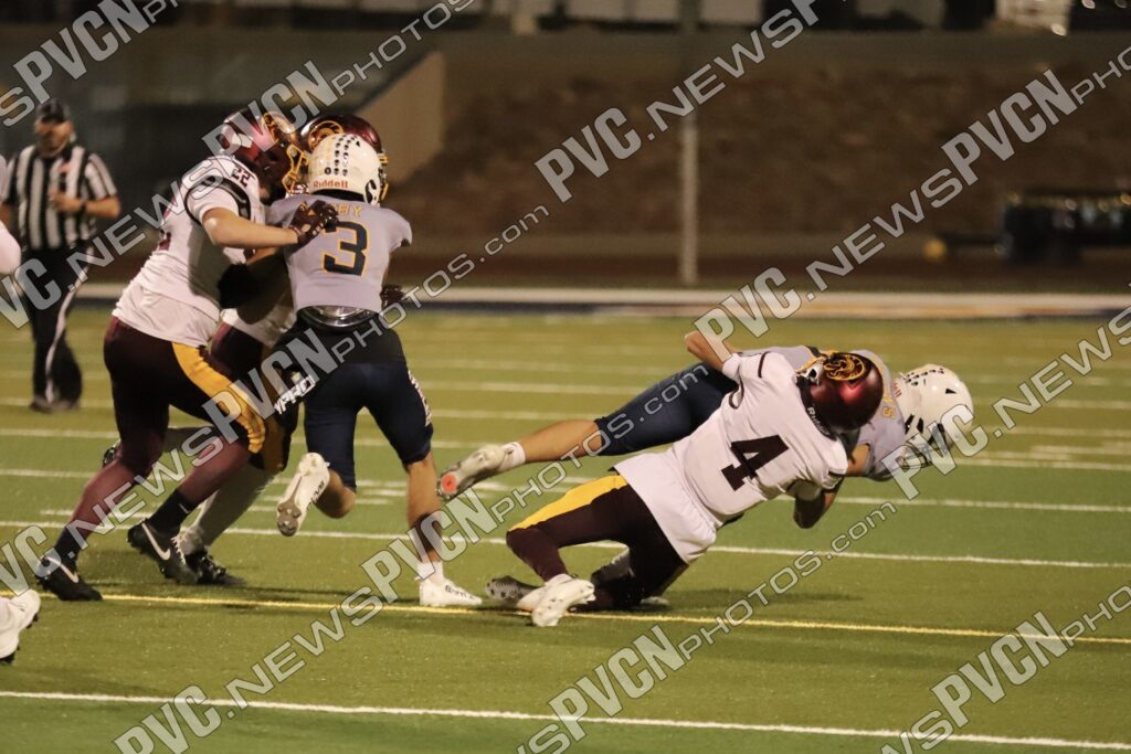Pahrump’s defense came ready from the opening drive, halting Boulder City’s first possession and setting up solid field position for the offense. Quarterback Kayne Horibe and running back Austin Alvarez worked to establish the ground game early, with short gains moving the ball methodically downfield. After a defensive stand deep in Trojan territory that ended with Ashton McClard snagging a critical interception in the end zone, Pahrump’s offense seized the momentum.