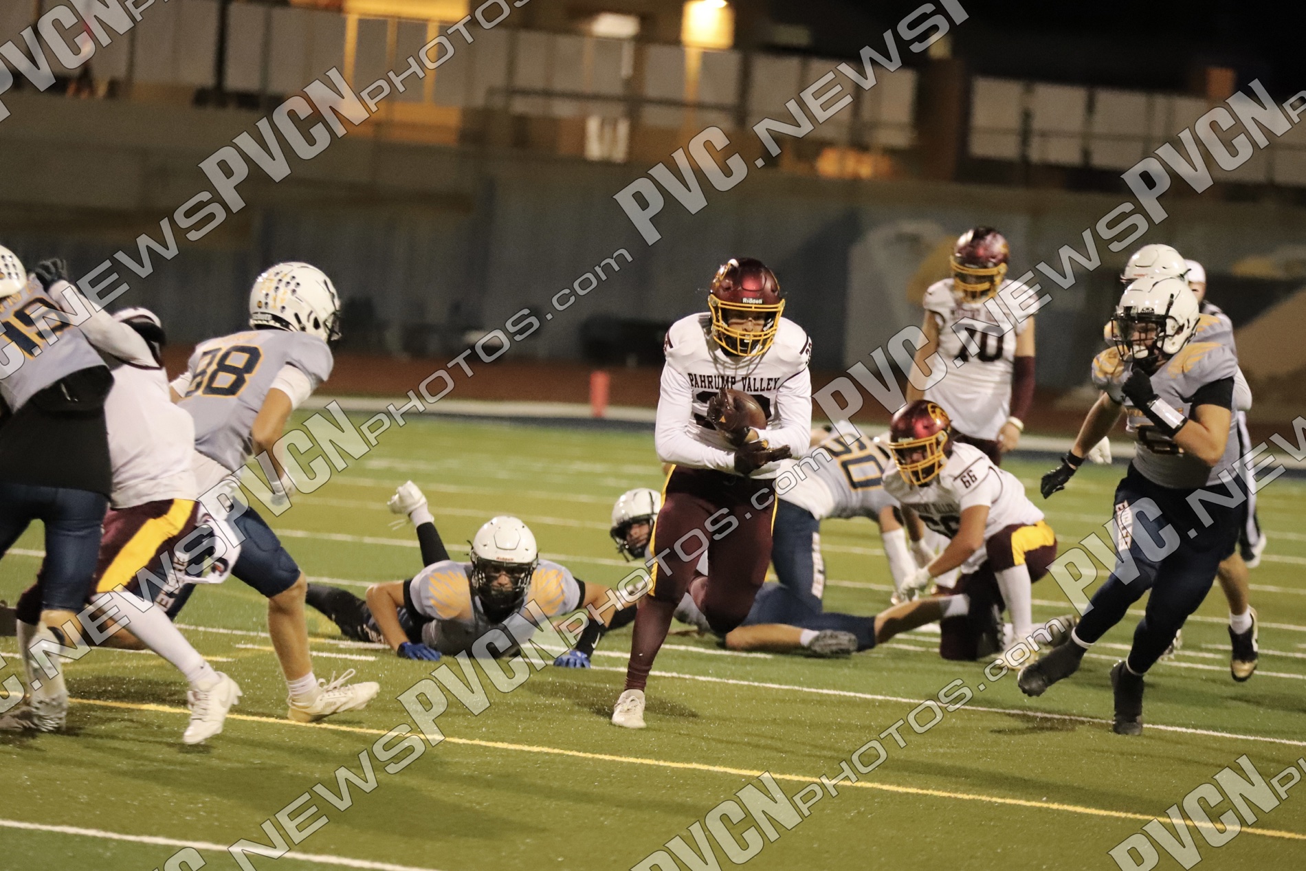 Refusing to back down, Pahrump’s offense regrouped. Alvarez broke loose on a series of hard-fought runs, powering the Trojans into scoring position. Horibe capped the drive with a quarterback sneak for a touchdown with 6:49 remaining, and Slusher split the uprights for a 14–6 lead.
