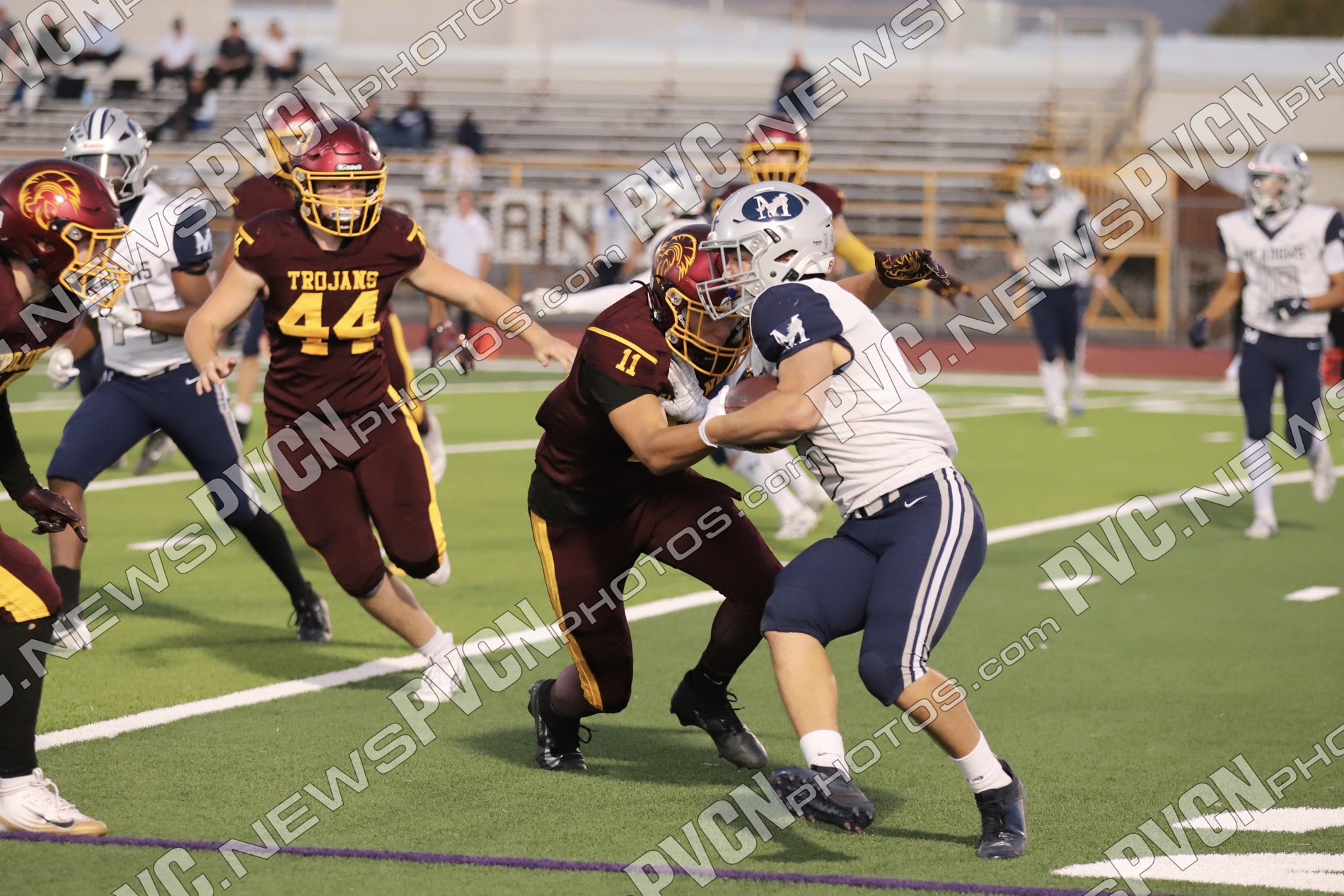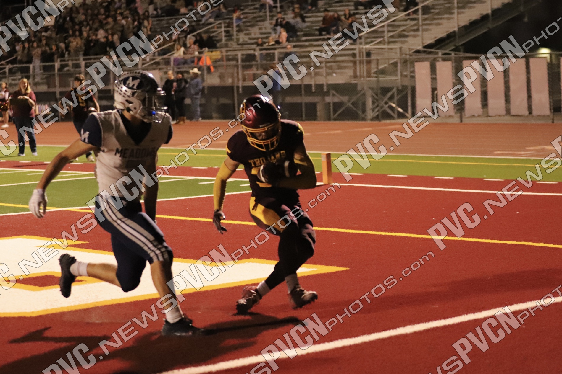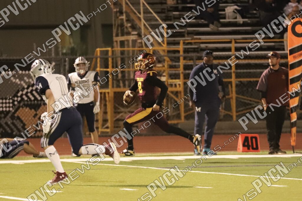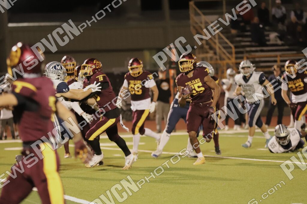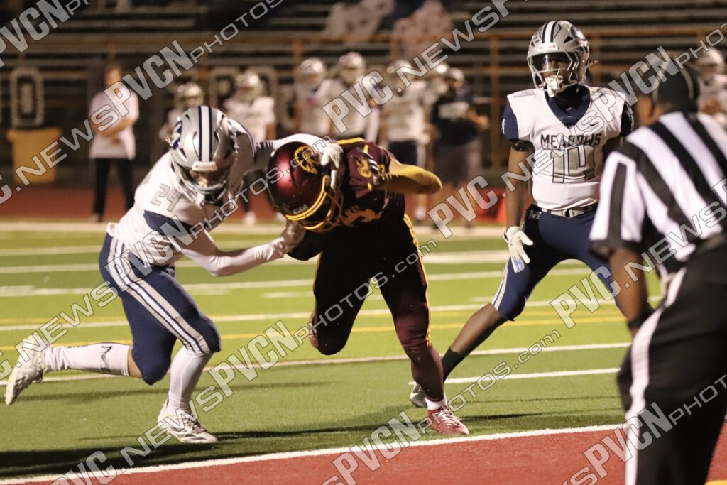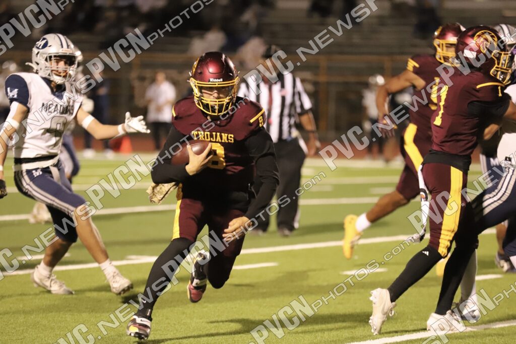 Early in the second quarter, The Meadows finally found the end zone with a short pass after a series of penalties moved them into scoring range, but their two-point conversion attempt failed, leaving the score at 27–6 with 11 minutes remaining. The Trojans responded immediately. A deep pass from Horibe to Alvarez resulted in another touchdown, followed by a two-point conversion run by Alvarez to make it 35–6.