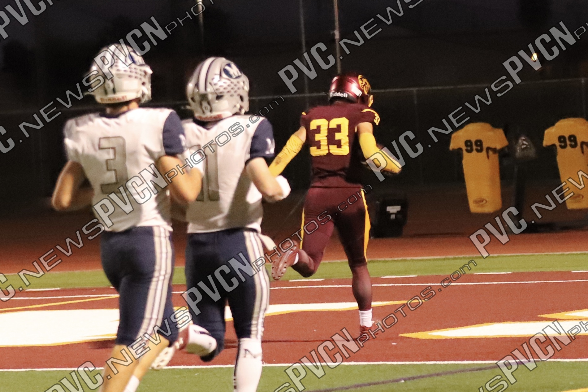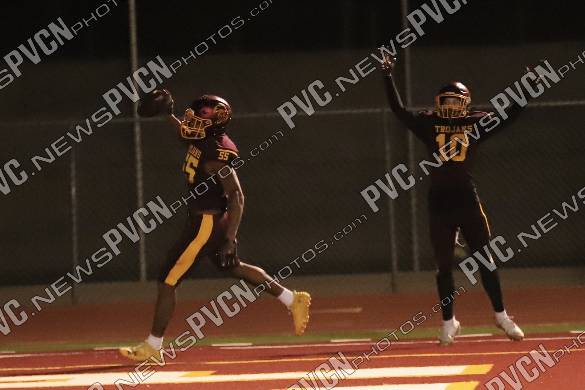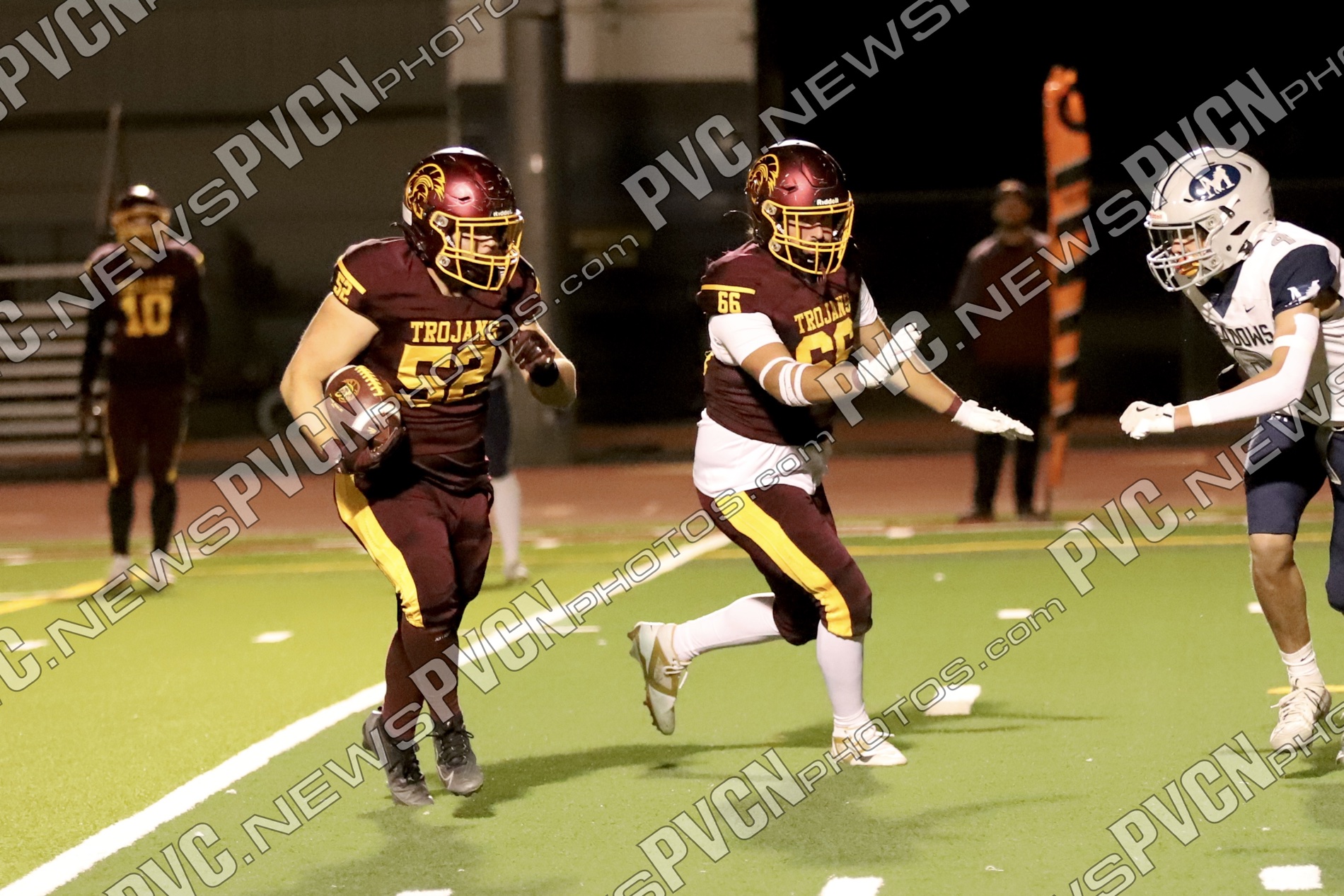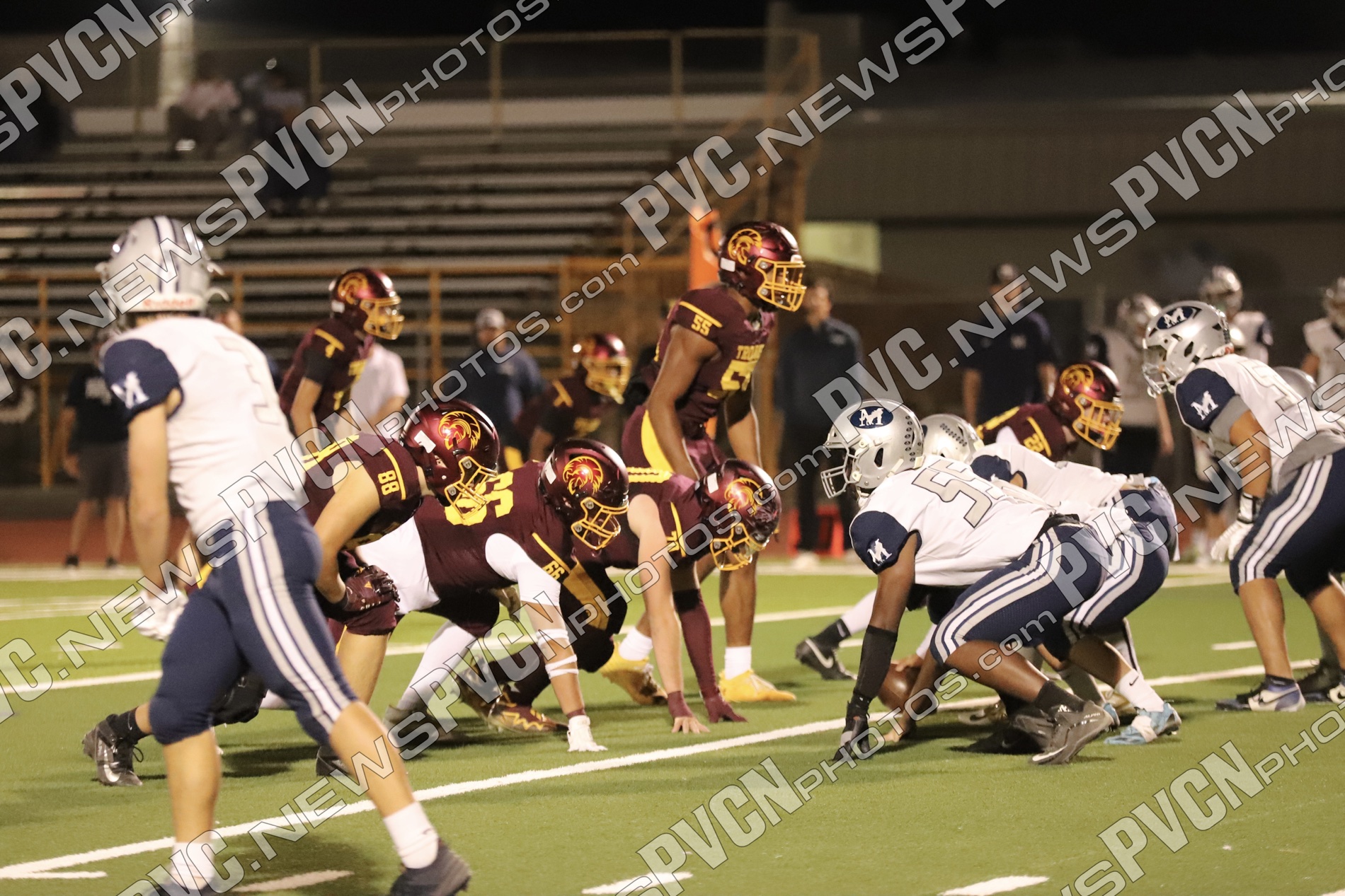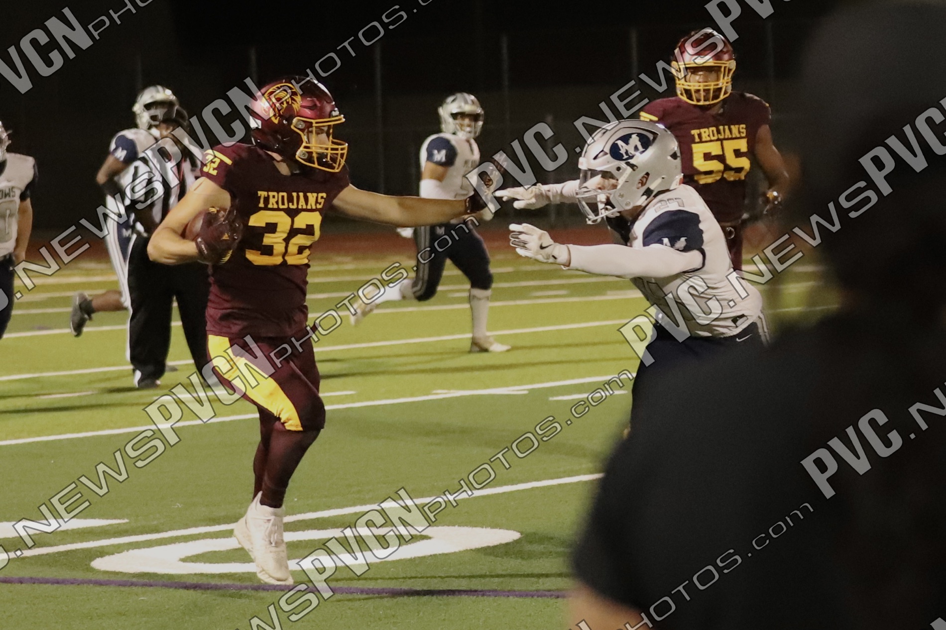 Early in the second quarter, The Meadows finally found the end zone with a short pass after a series of penalties moved them into scoring range, but their two-point conversion attempt failed, leaving the score at 27–6 with 11 minutes remaining. The Trojans responded immediately. A deep pass from Horibe to Alvarez resulted in another touchdown, followed by a two-point conversion run by Alvarez to make it 35–6.