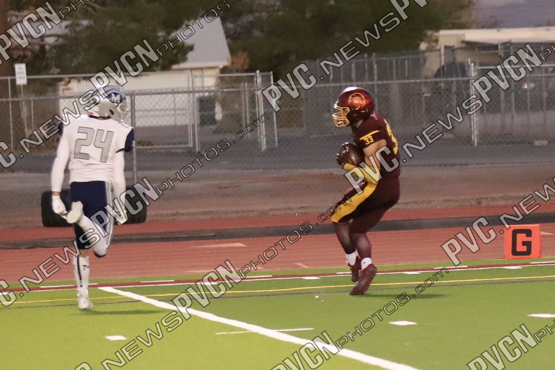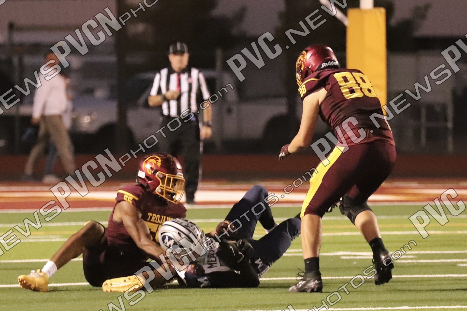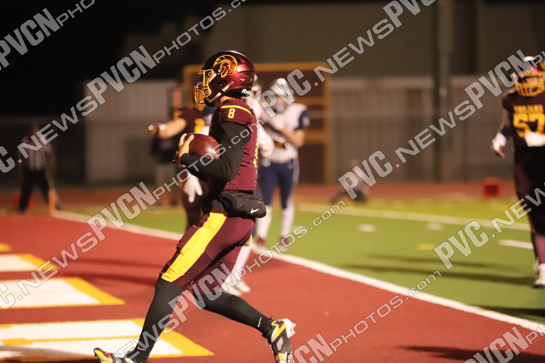 The defense continued to dominate as Jack Walker and Iyan Bosket stopped the Mustangs behind the line, and Ashton McClard and Ryan Hamlin each broke up pass attempts. After a blocked punt, the Trojans took over again near the 39-yard line. A keeper by Horibe moved the ball to the 4-yard line, setting up Alvarez for his third touchdown of the quarter. Slusher’s extra point was good, and Pahrump was ahead 21–0 with just over five minutes left in the first.