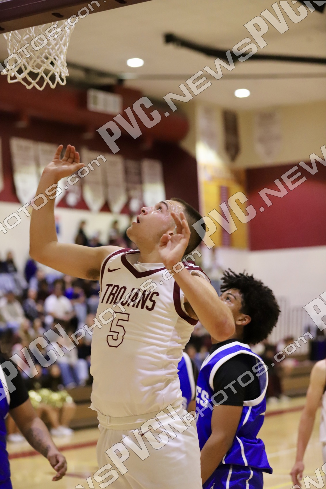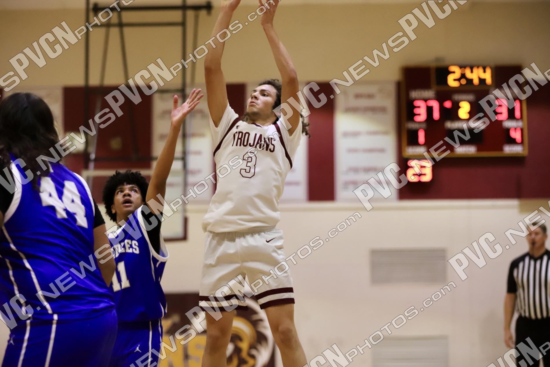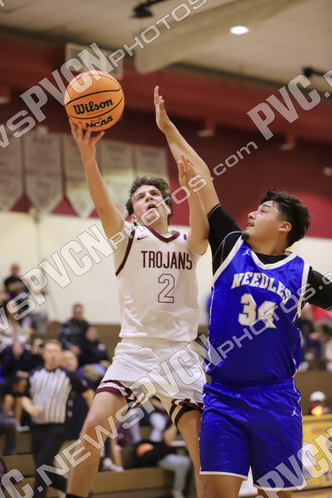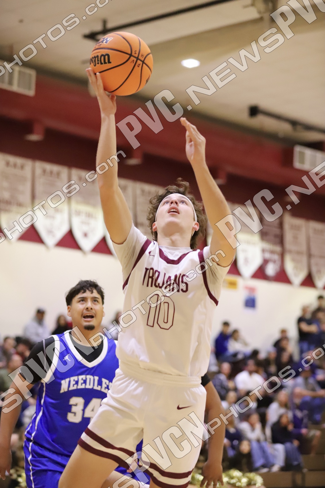 The Mustangs responded with a quick five-point burst — a corner three followed by a steal and layup — trimming Pahrump’s lead to just four. The Trojans regrouped as Malachi Holland took over inside, scoring back-to-back baskets, then earning a trip to the line and sinking both free throws to restore a multi-possession advantage. Caden Briscoe’s putback and two free throws with 1:36 left capped off a strong quarter for PVHS, who entered halftime leading 45–37 despite Needles’ increasingly aggressive offense.