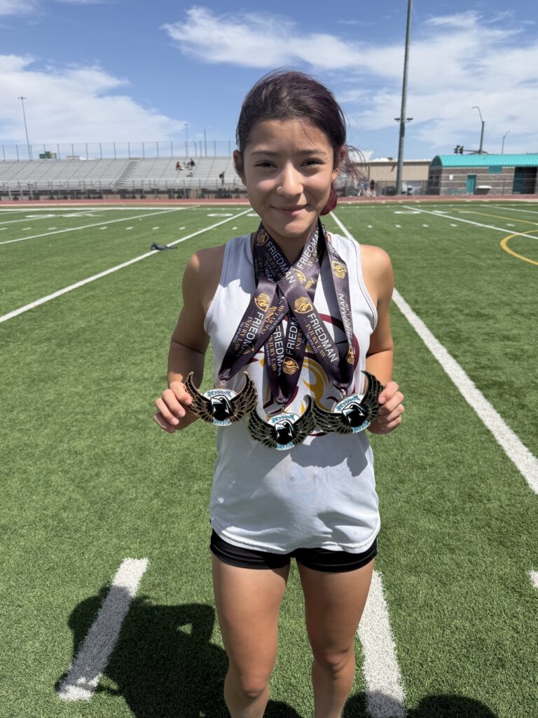 Sprint events continued in the 200m dash, where Rene Gonzalez Valdez ran 25.40 in the boys freshman-sophomore race and Aurora Bowers ran 28.72 for the girls. In the varsity races, Ben De Santiago posted a 22.78 for second in small schools, while Jace Wulfenstein (24.63) and Justin Byers (25.01) followed. The girls saw Anjolina Mercado (personal best 27.35), Ma’liyah Collins (personal best 27.67), Diona Nixon (personal best 28.71) and Cindal Monahan (season best 30.03) all turn in strong efforts.