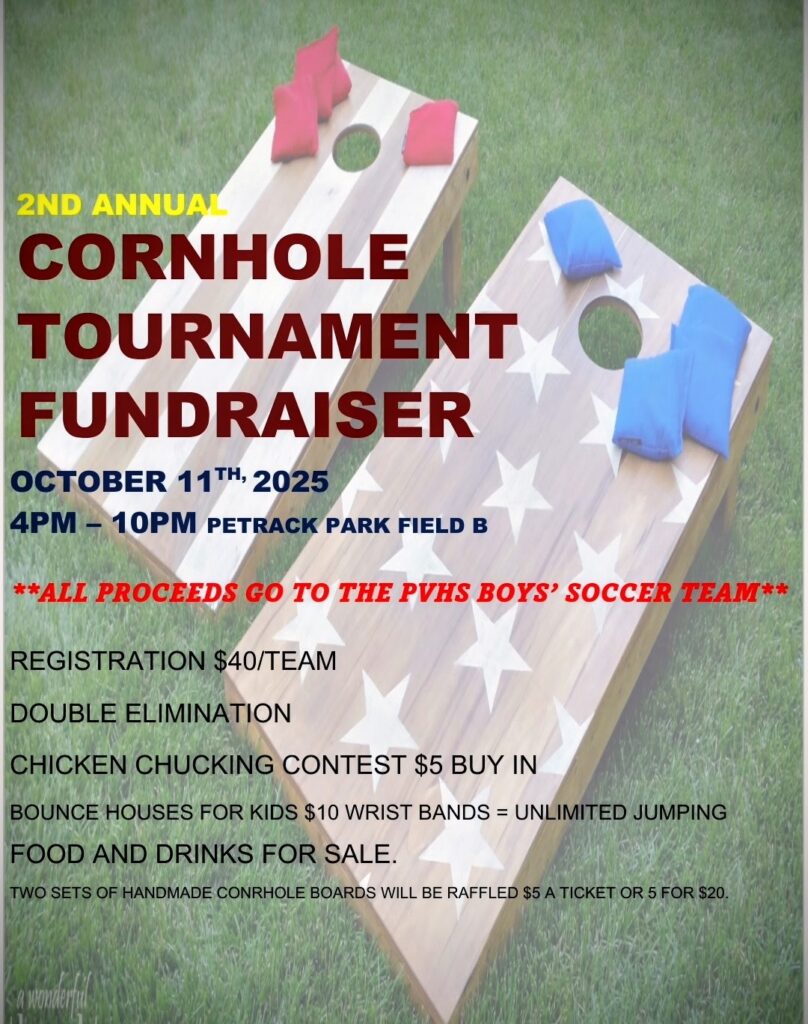 Teams can register for $40 per team to compete in a double-elimination cornhole tournament, with all proceeds going directly to the PVHS boys’ soccer team. The evening will also feature a Chicken Chucking Contest with a $5 buy-in, sure to add some laughs to the competition.