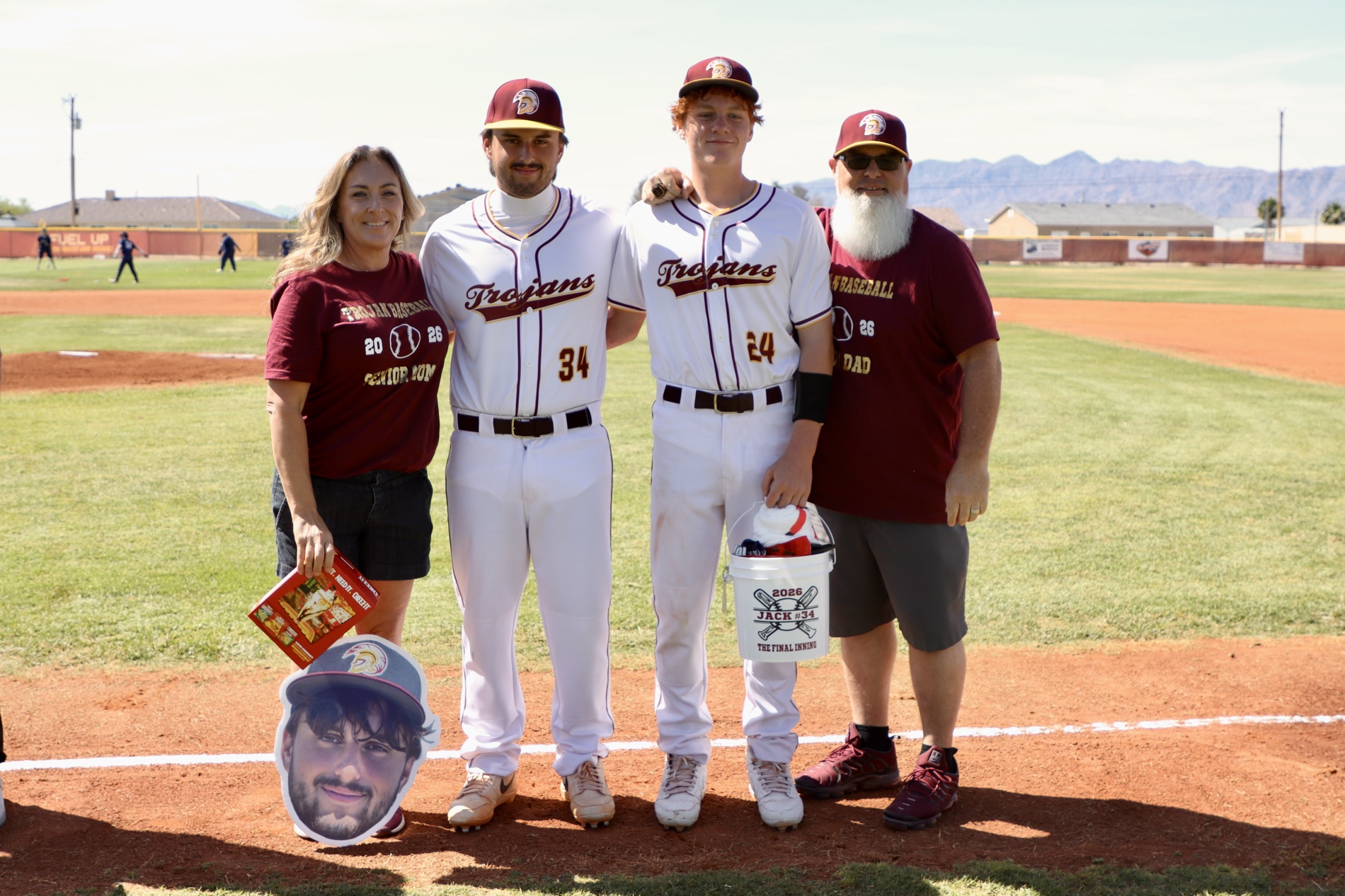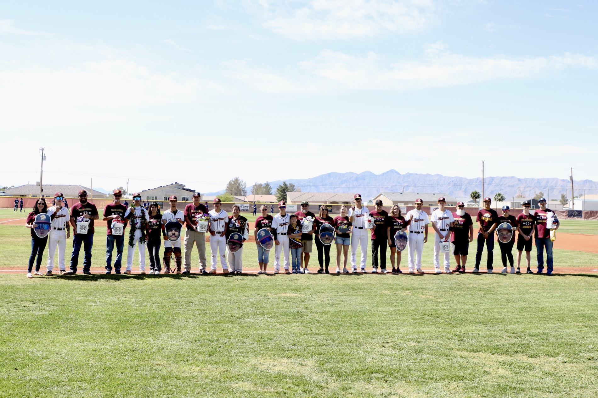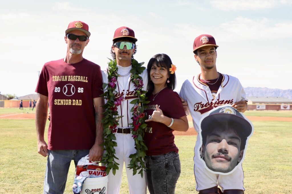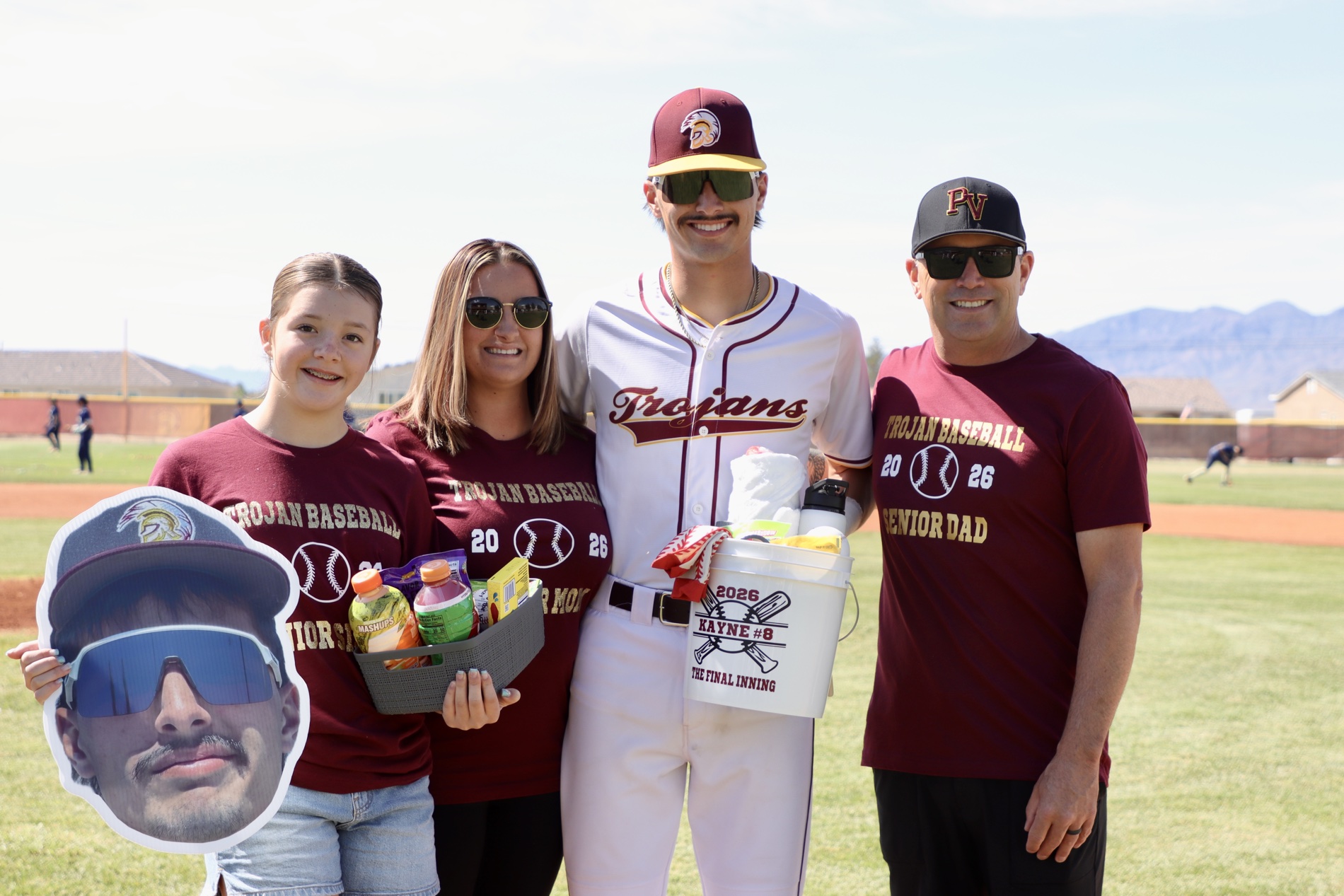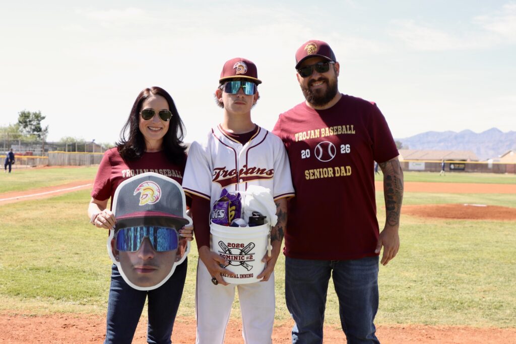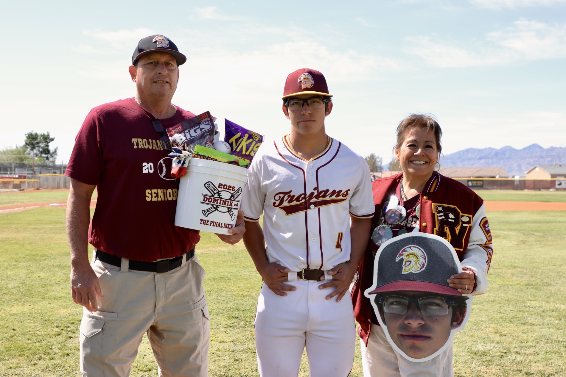 Before the first pitch was even thrown, Saturday’s matchup between Pahrump Valley High School and Lake Mead Christian carried a special meaning. The Trojans honored their senior class—Manager Tristan Brown, and players Dominic Chiancone, Leland Delgado, Kayne Horibe, Jack Walker, Vinny Whitney, and Dominik Wilson—alongside their families in a pregame ceremony that included a memorable first pitch from each senior’s father.